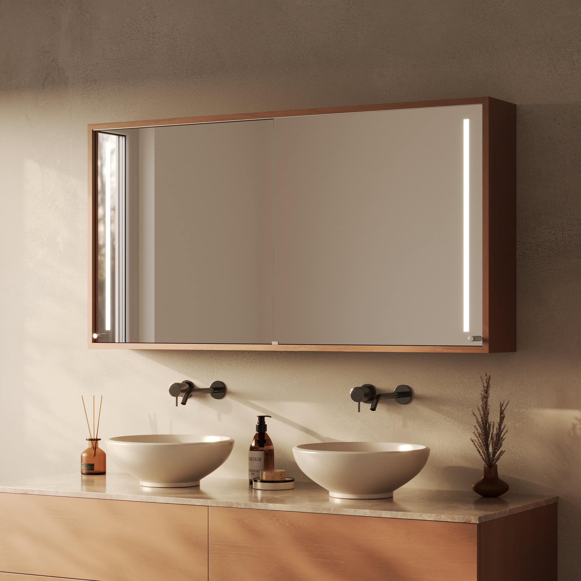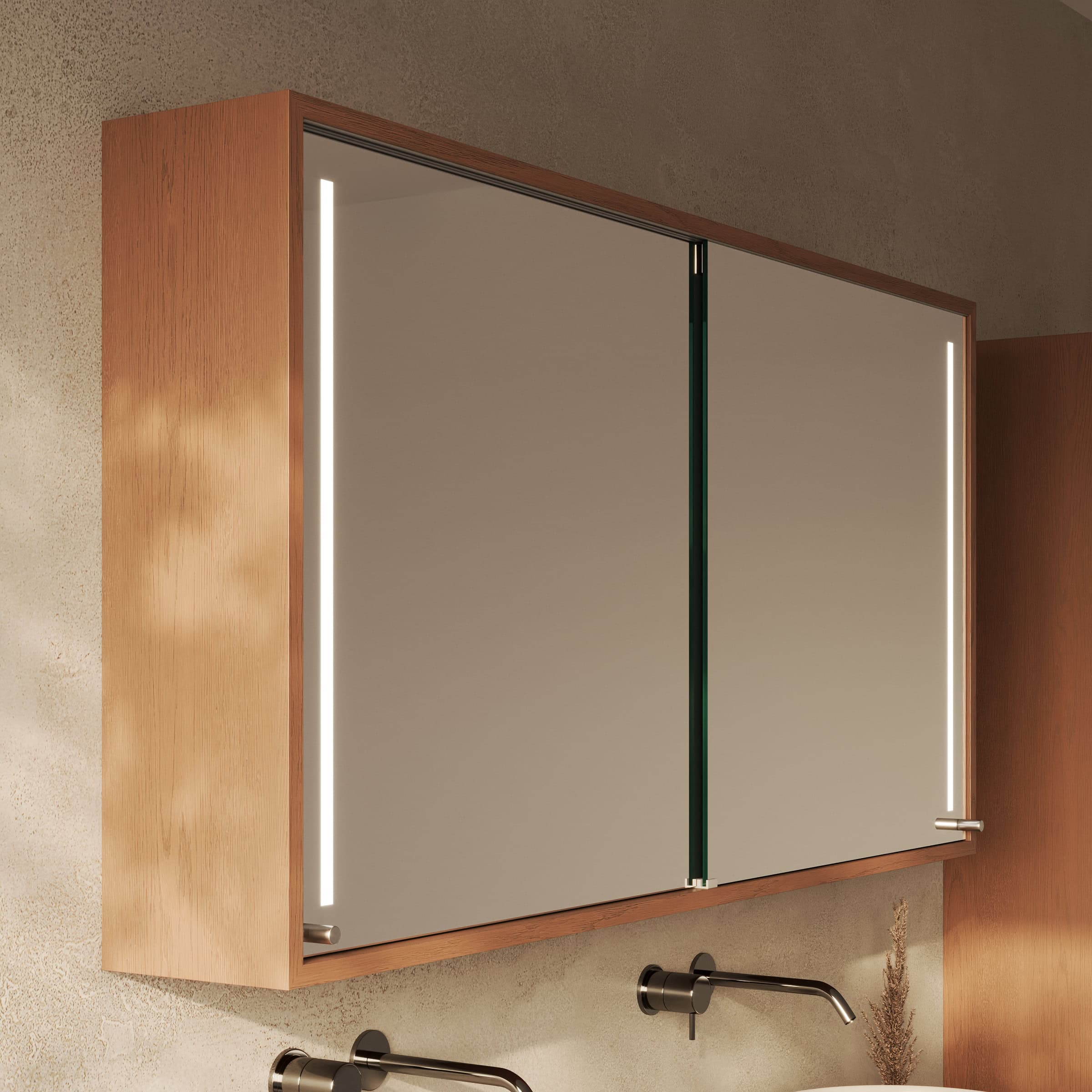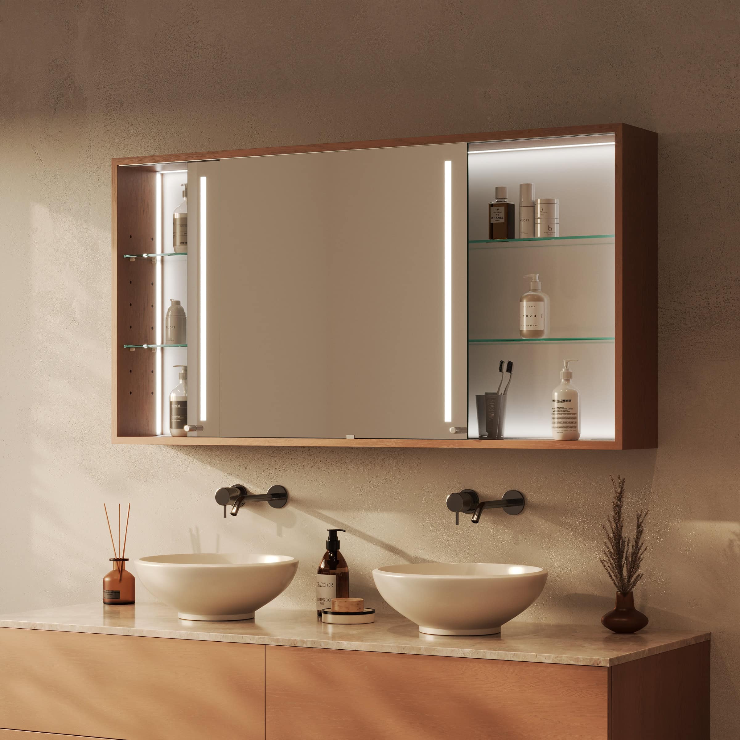 Der Spiegelschrank Modena wird exakt nach Ihren Vorgaben gefertigt und fügt sich so nahtlos in die Architektur Ihres Badezimmers ein. Sein Korpus aus 19mm starken Holzdekorplatten bürgt für Stabilität, während die eleganten Schiebetüren für eine klare Ästhetik sorgen und gerade in kleineren Räumen wertvollen Platz sparen. Die Türen gleiten sanft zur Seite und geben den Blick frei auf einen brillanten, 6mm starken Kristallspiegel mit geschliffenen und veredelten Kanten, der Ihr Spiegelbild verzerrungsfrei wiedergibt. Das Highlight ist die beidseitig integrierte LED-Beleuchtung. Sie wurde speziell für kosmetische Anwendungen optimiert und taucht Ihr Gesicht in ein schattenfreies, schmeichelhaftes Licht. Im ausgeschalteten Zustand präsentieren sich die satinierten Leuchtfelder als dezente Milchglas-Elemente, eingeschaltet erhellen sie indirekt und blendfrei den gesamten Bereich – für eine Atmosphäre von konzentrierter Ruhe bei Ihrer täglichen Pflegeroutine.
