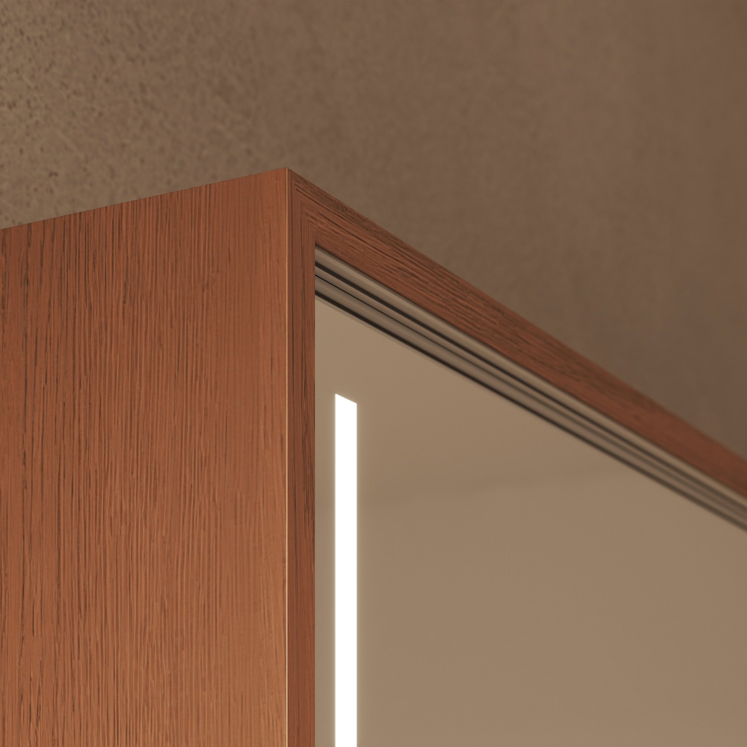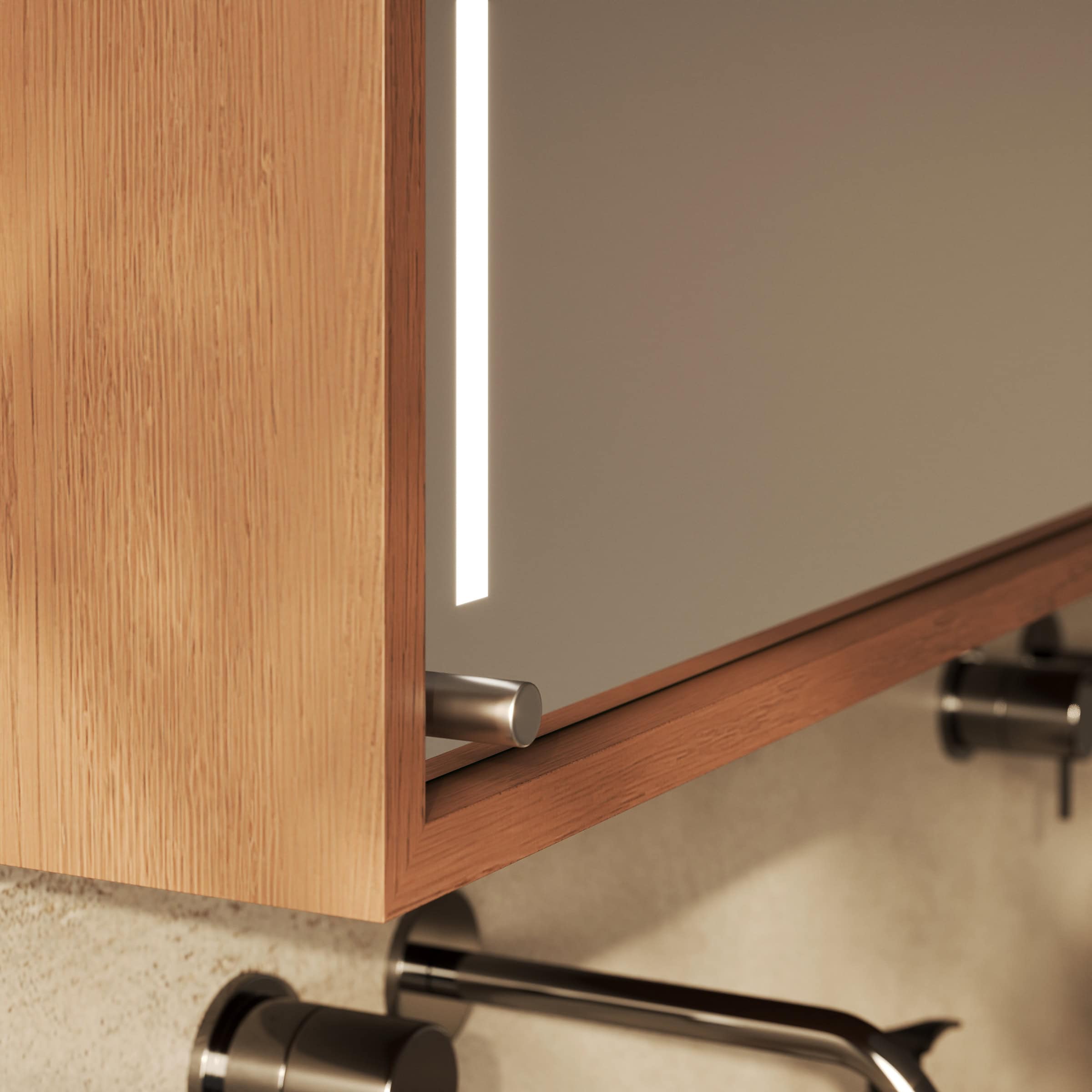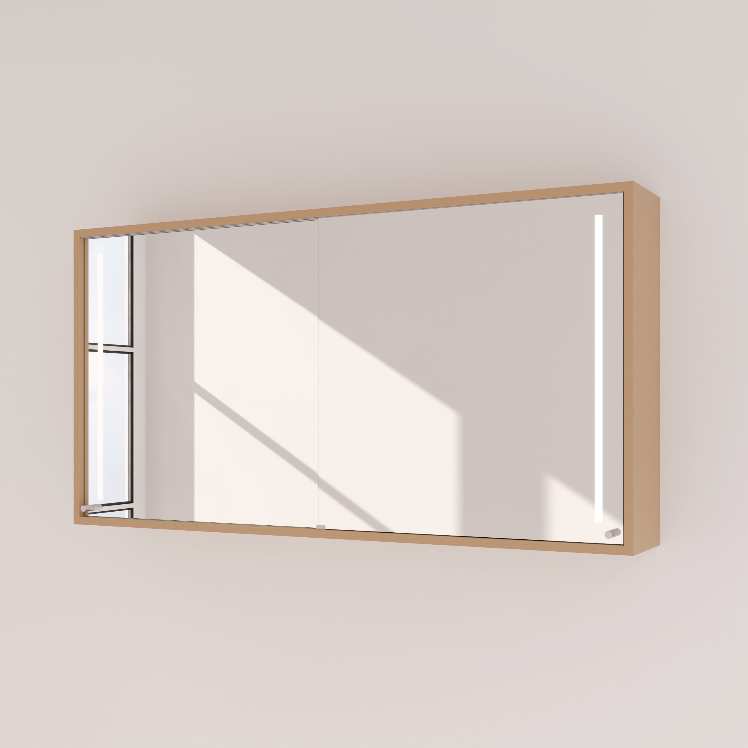 Der Spiegelschrank Modena wird exakt nach Ihren Vorgaben gefertigt und fügt sich so nahtlos in die Architektur Ihres Badezimmers ein. Sein Korpus aus 19mm starken Holzdekorplatten bürgt für Stabilität, während die eleganten Schiebetüren für eine klare Ästhetik sorgen und gerade in kleineren Räumen wertvollen Platz sparen. Die Türen gleiten sanft zur Seite und geben den Blick frei auf einen brillanten, 6mm starken Kristallspiegel mit geschliffenen und veredelten Kanten, der Ihr Spiegelbild verzerrungsfrei wiedergibt. Das Highlight ist die beidseitig integrierte LED-Beleuchtung. Sie wurde speziell für kosmetische Anwendungen optimiert und taucht Ihr Gesicht in ein schattenfreies, schmeichelhaftes Licht. Im ausgeschalteten Zustand präsentieren sich die satinierten Leuchtfelder als dezente Milchglas-Elemente, eingeschaltet erhellen sie indirekt und blendfrei den gesamten Bereich – für eine Atmosphäre von konzentrierter Ruhe bei Ihrer täglichen Pflegeroutine.