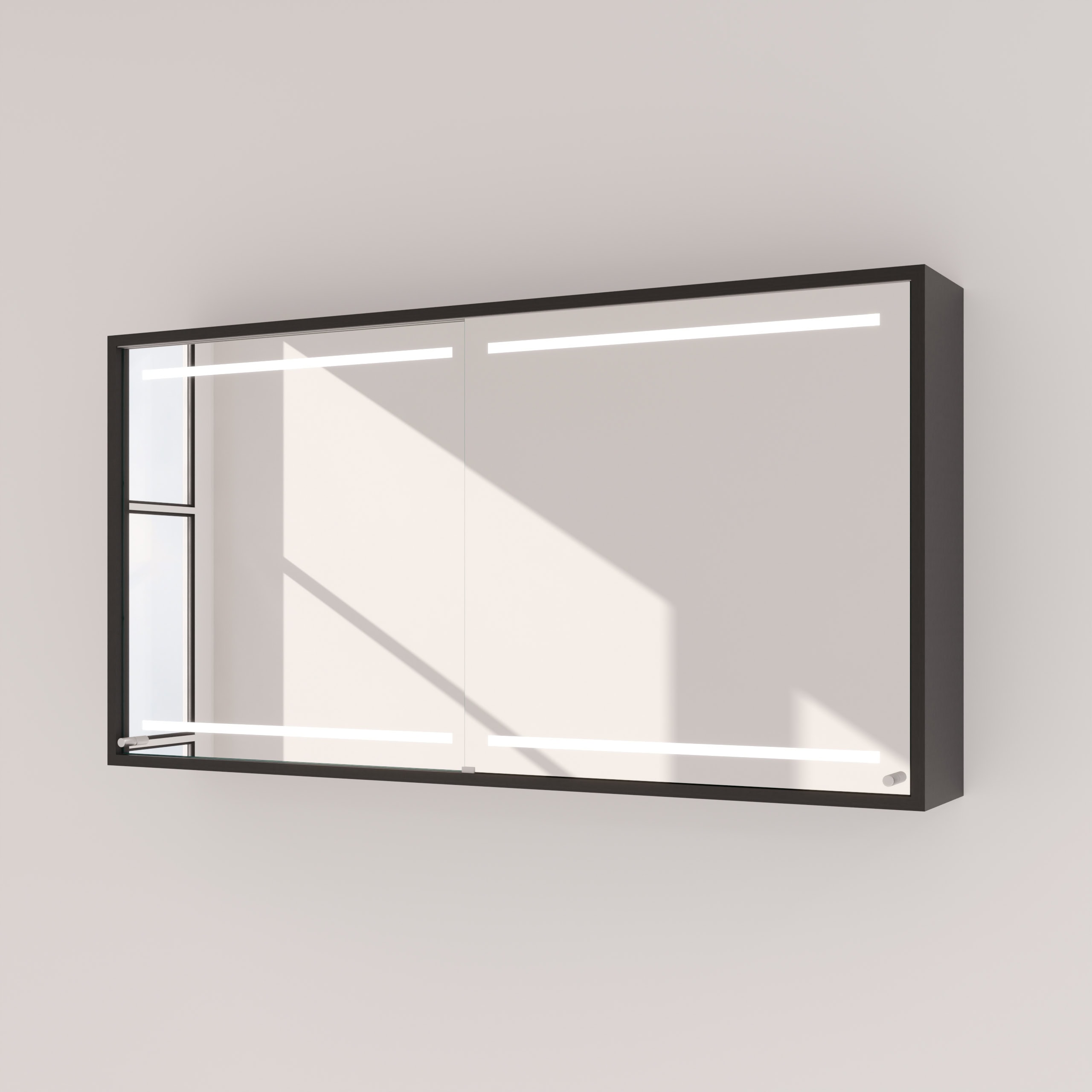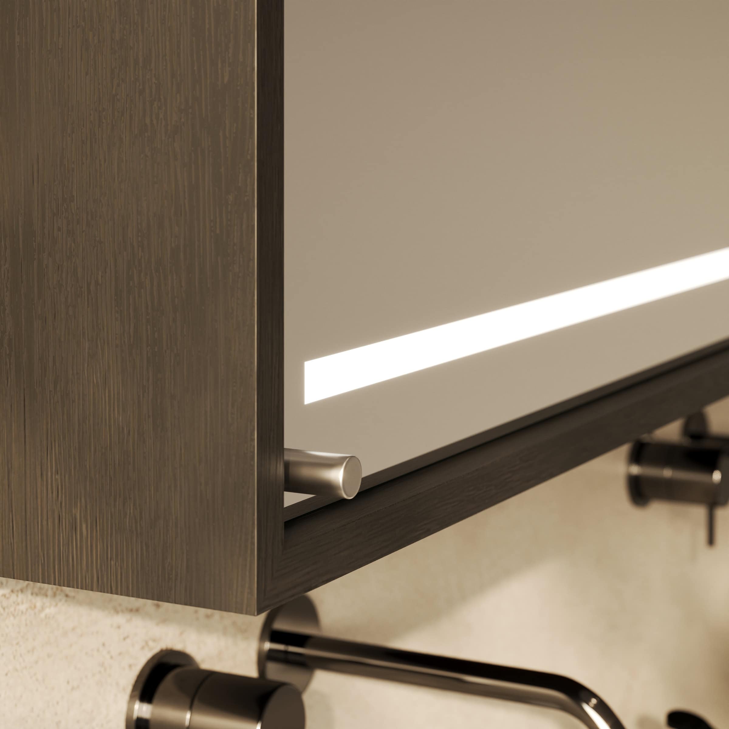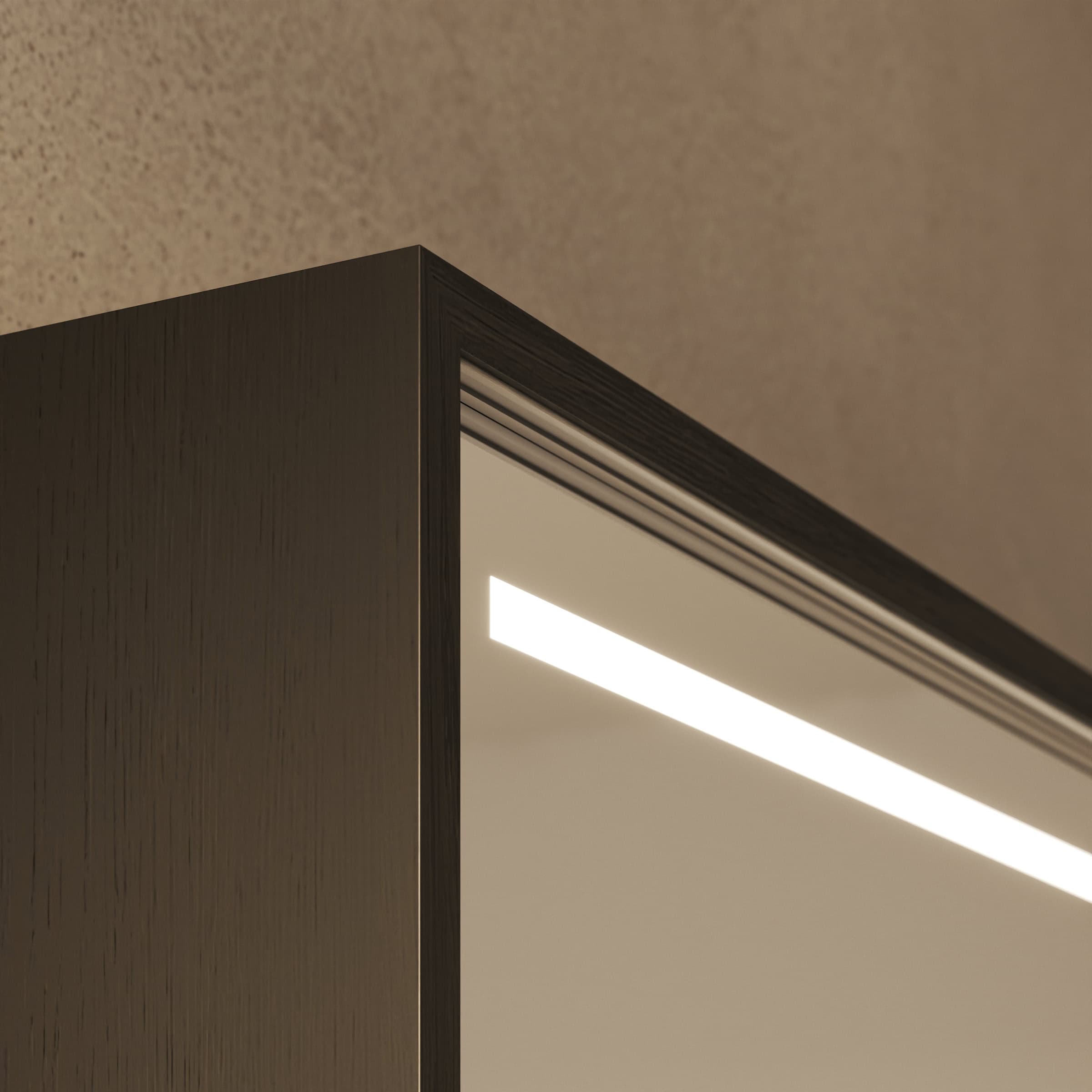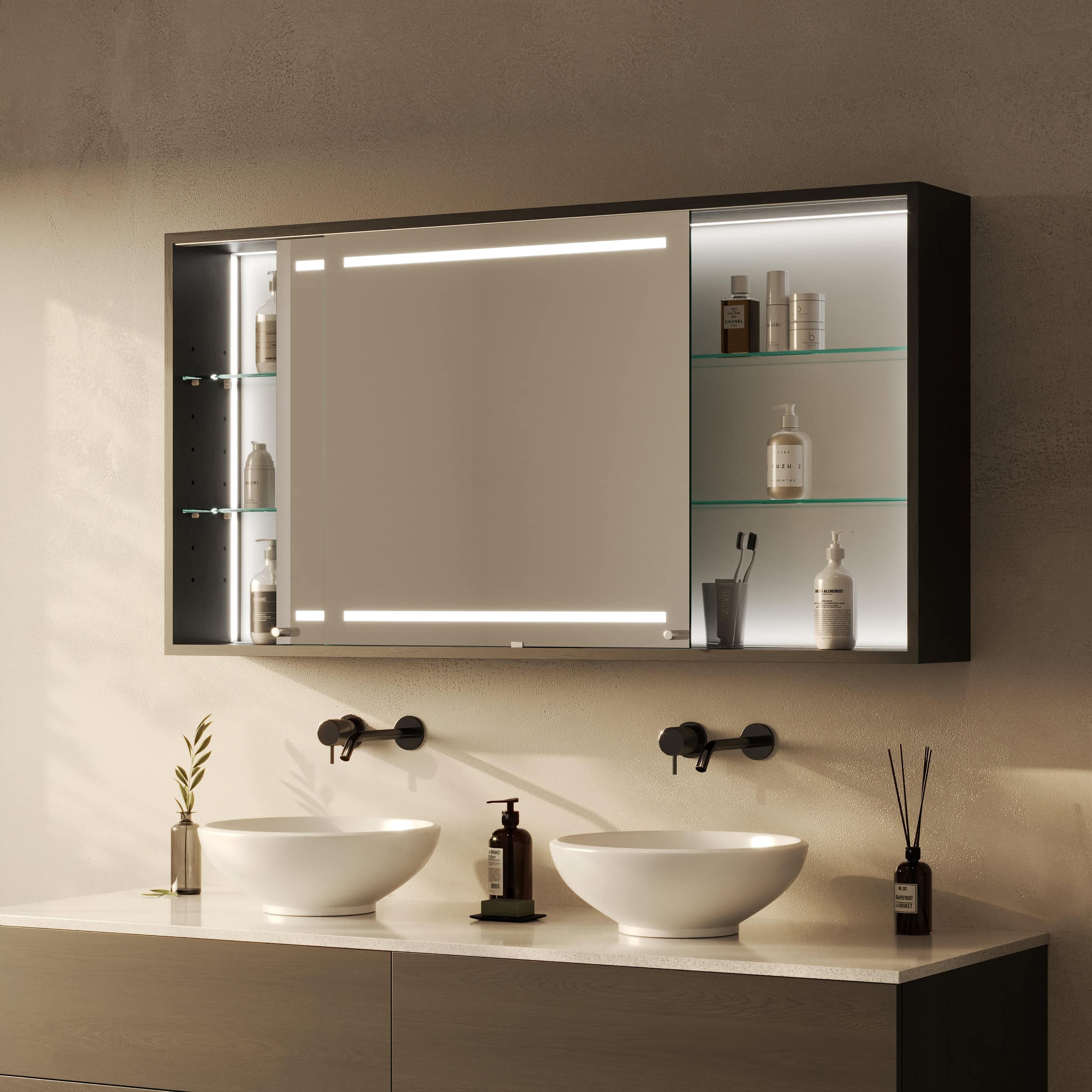 Der Spiegelschrank Modena wird exakt nach Ihren Vorgaben gefertigt und fügt sich so nahtlos in die Architektur Ihres Badezimmers ein. Der Korpus aus 19 mm starken Holzdekorplatten in Ihrer Wunschfarbe bildet eine stabile und langlebige Basis, während die eleganten Schiebetüren aus 6 mm starkem Kristallspiegel gefertigt sind. Diese ermöglichen nicht nur einen komfortablen, platzsparenden Zugriff auf Ihre Pflegeprodukte, sondern bieten dank geschliffener und veredelter Kanten auch ein brillantes, klares Spiegelbild. Das Herzstück ist die innovative LED-Beleuchtung oben und unten. Die satinierten Leuchtfelder erzeugen ein sanftes, indirektes Licht, das Ihr Gesicht schattenfrei und optimal für kosmetische Anwendungen ausleuchtet. Im ausgeschalteten Zustand präsentieren sich die Flächen in einer dezenten Milchglas-Optik, die das puristische Design unterstreicht.