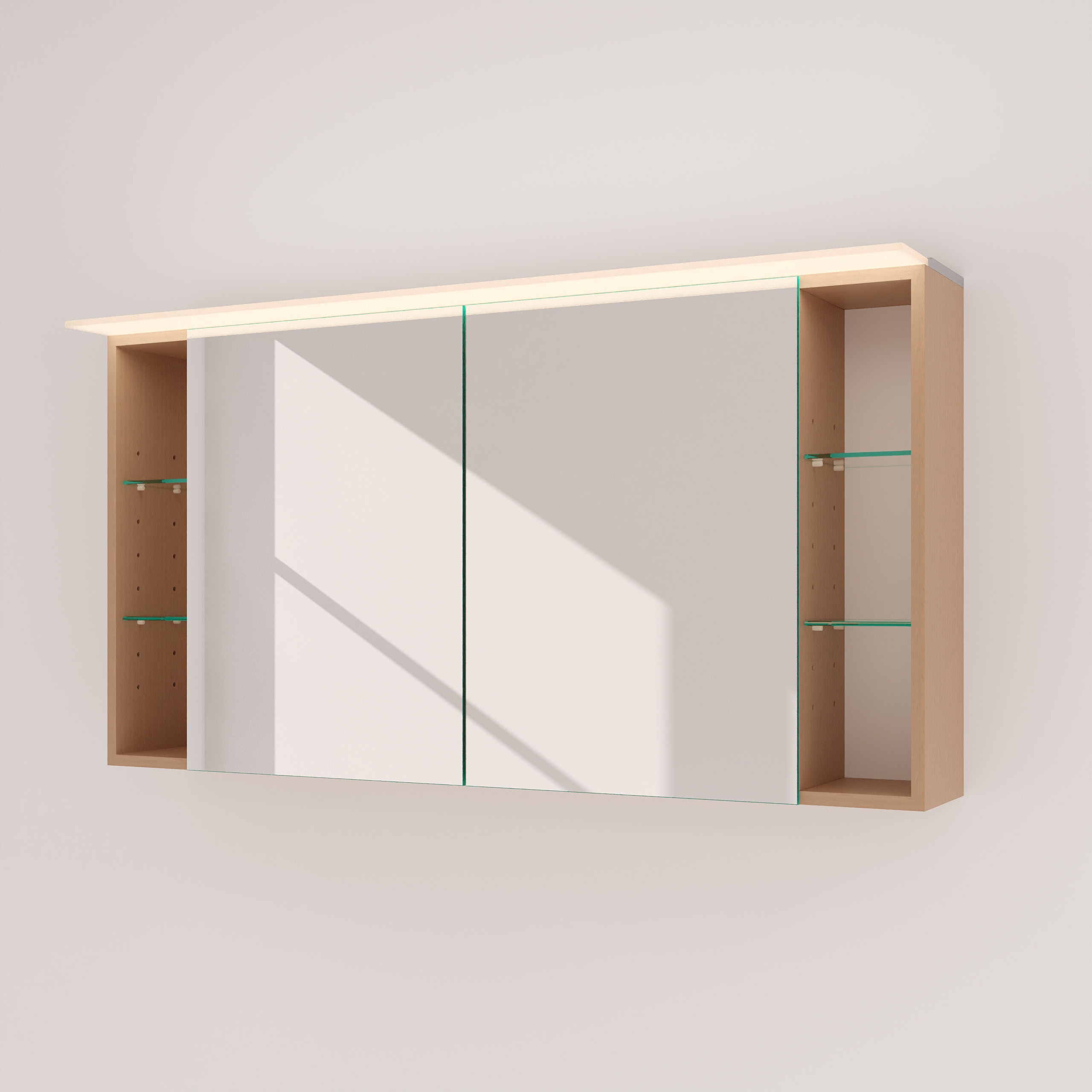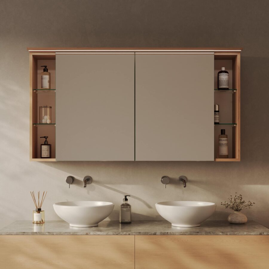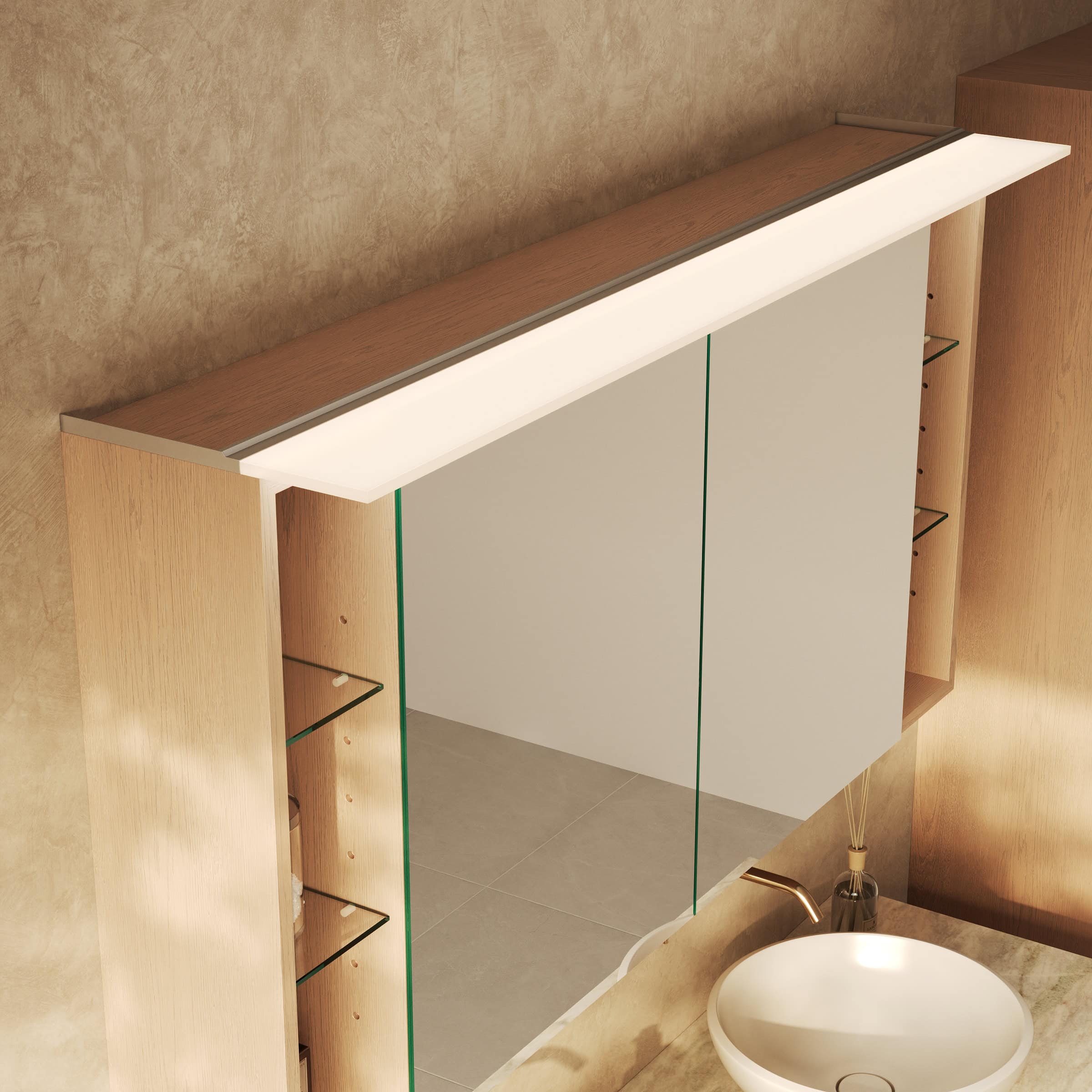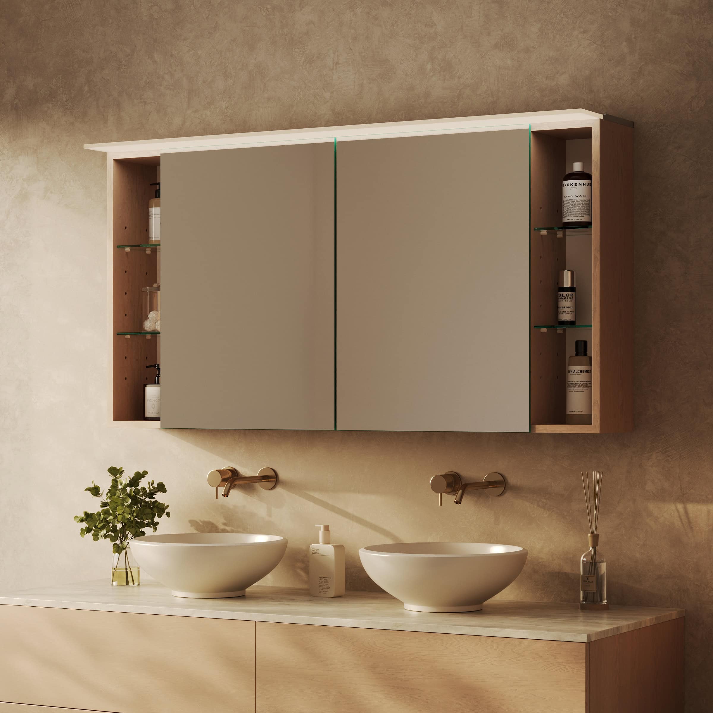 Der Spiegelschrank Luana wird exakt nach Ihren Wünschen und räumlichen Gegebenheiten gefertigt. Die brillanten Fronten aus 6 mm starkem Kristallspiegel mit sorgfältig geschliffenen und veredelten Kanten reflektieren nicht nur Ihr Bild, sondern auch Ihren Anspruch an Qualität. Der stabile Korpus aus 19 mm starken Holzdekorplatten, dessen Farbe und Tiefe Sie frei bestimmen, bildet dazu den passenden Rahmen. Einzigartig sind die seitlichen Fächer, die offenen, schnell zugänglichen Stauraum für Ihre täglichen Essentials oder dekorative Akzente bieten. Die integrierte LED-Aufsatzleuchte ist präzise für die kosmetische Anwendung optimiert und taucht Ihr Gesicht in ein schattenfreies, klares Licht. Im Inneren sorgen hochwertige Blum-Scharniere mit Soft-Close-Mechanismus für ein sanftes, geräuschloses Schließen der Türen – ein Detail, das die Wertigkeit dieses Badmöbels bei jeder Nutzung unterstreicht.