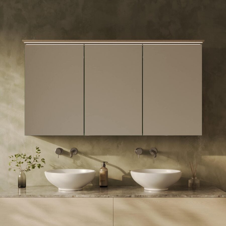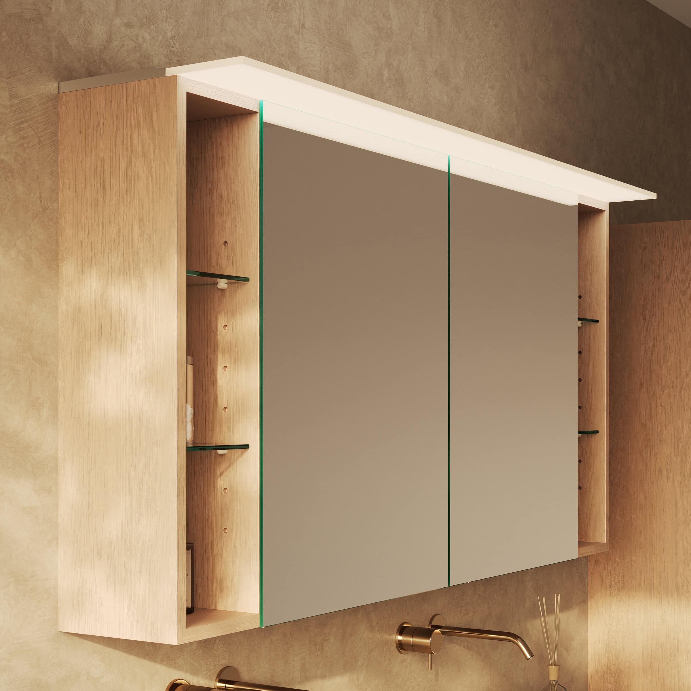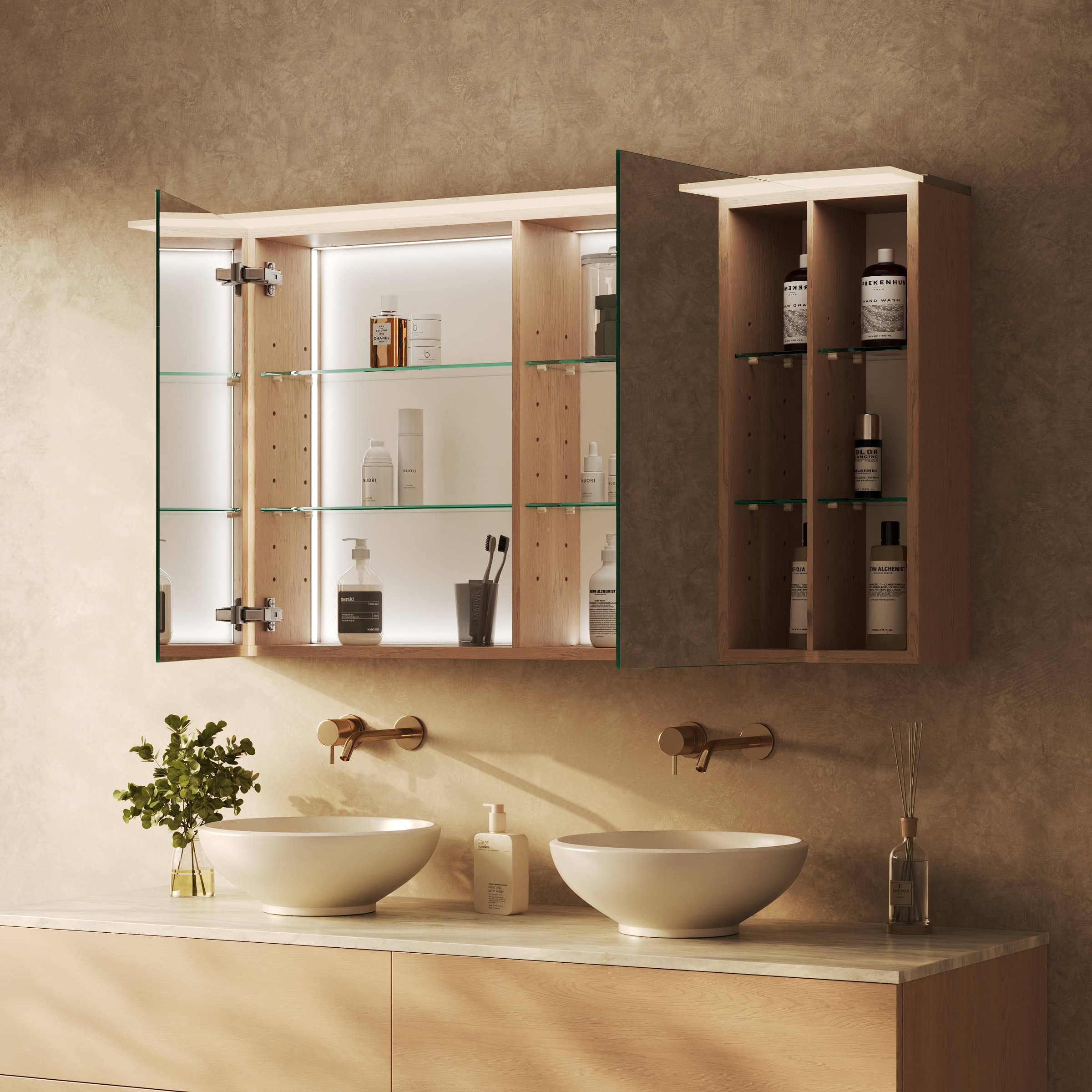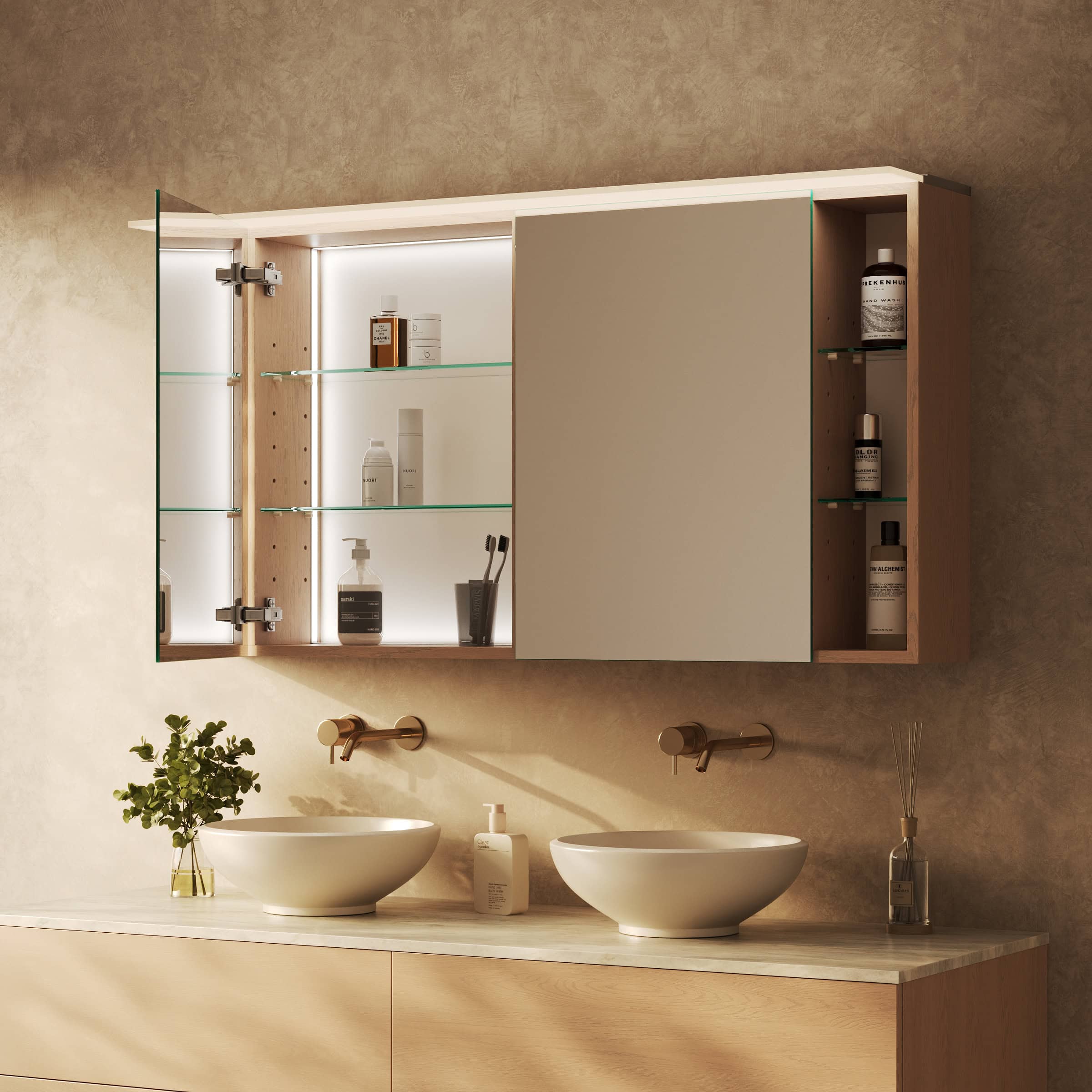 Der Spiegelschrank Luana wird exakt nach Ihren Wünschen und räumlichen Gegebenheiten gefertigt. Die brillanten Fronten aus 6 mm starkem Kristallspiegel mit sorgfältig geschliffenen und veredelten Kanten reflektieren nicht nur Ihr Bild, sondern auch Ihren Anspruch an Qualität. Der stabile Korpus aus 19 mm starken Holzdekorplatten, dessen Farbe und Tiefe Sie frei bestimmen, bildet dazu den passenden Rahmen. Einzigartig sind die seitlichen Fächer, die offenen, schnell zugänglichen Stauraum für Ihre täglichen Essentials oder dekorative Akzente bieten. Die integrierte LED-Aufsatzleuchte ist präzise für die kosmetische Anwendung optimiert und taucht Ihr Gesicht in ein schattenfreies, klares Licht. Im Inneren sorgen hochwertige Blum-Scharniere mit Soft-Close-Mechanismus für ein sanftes, geräuschloses Schließen der Türen – ein Detail, das die Wertigkeit dieses Badmöbels bei jeder Nutzung unterstreicht.