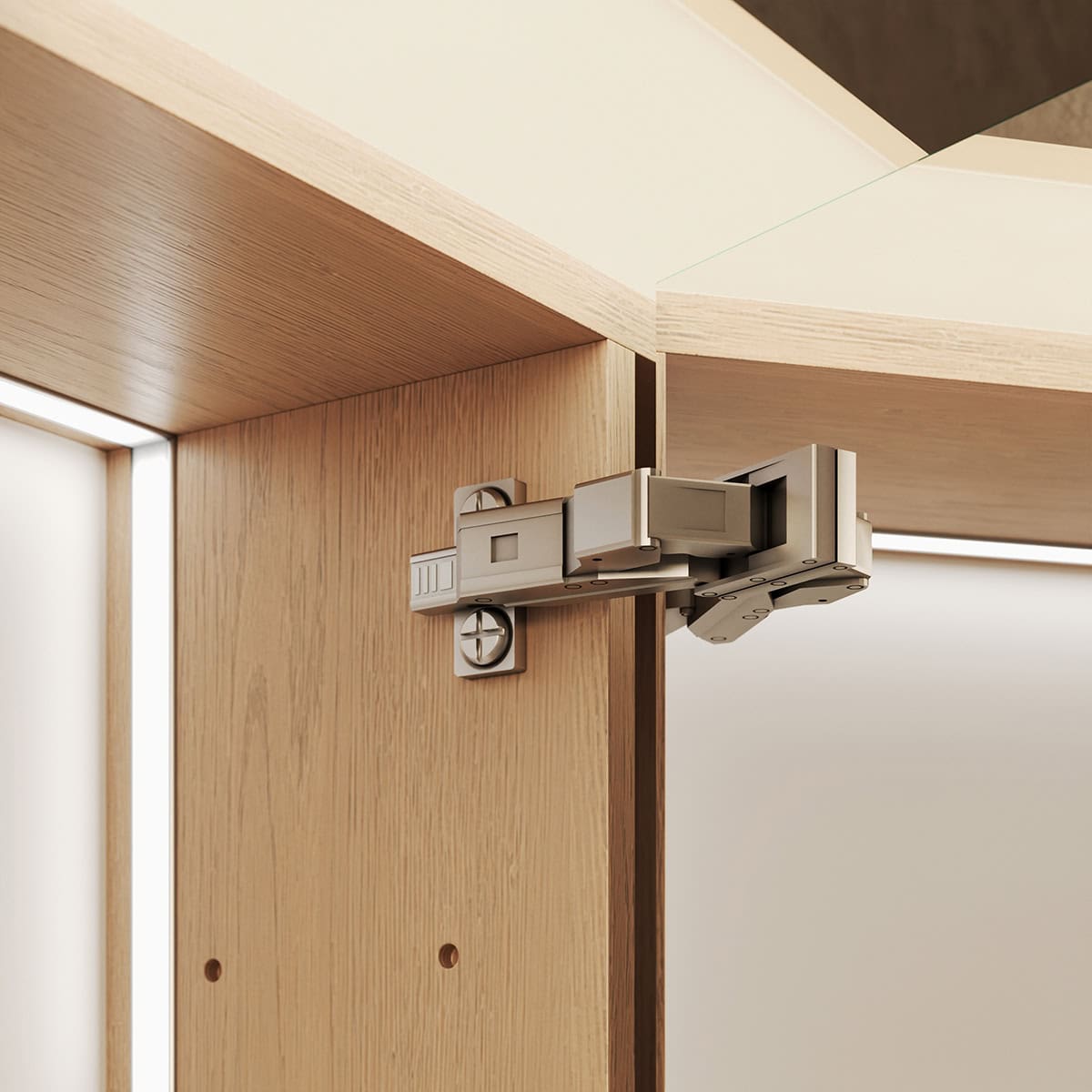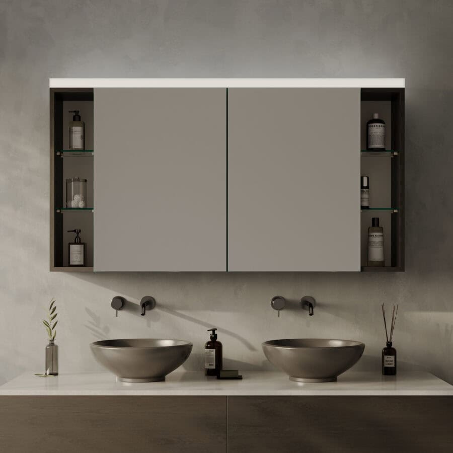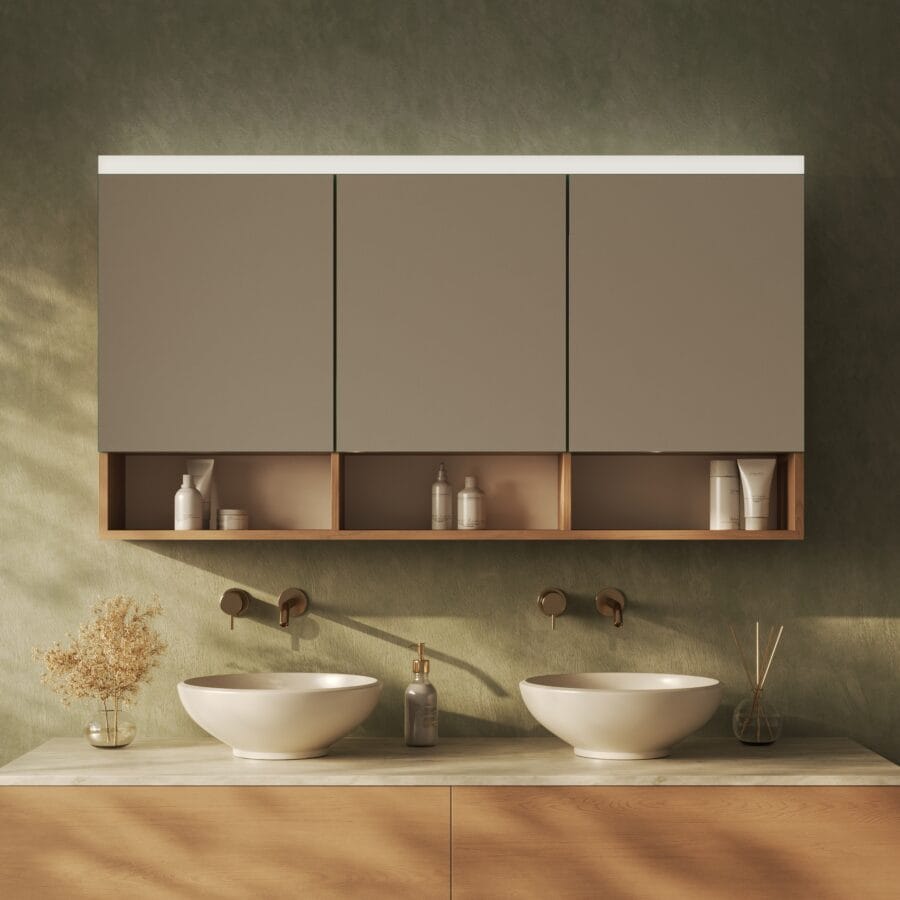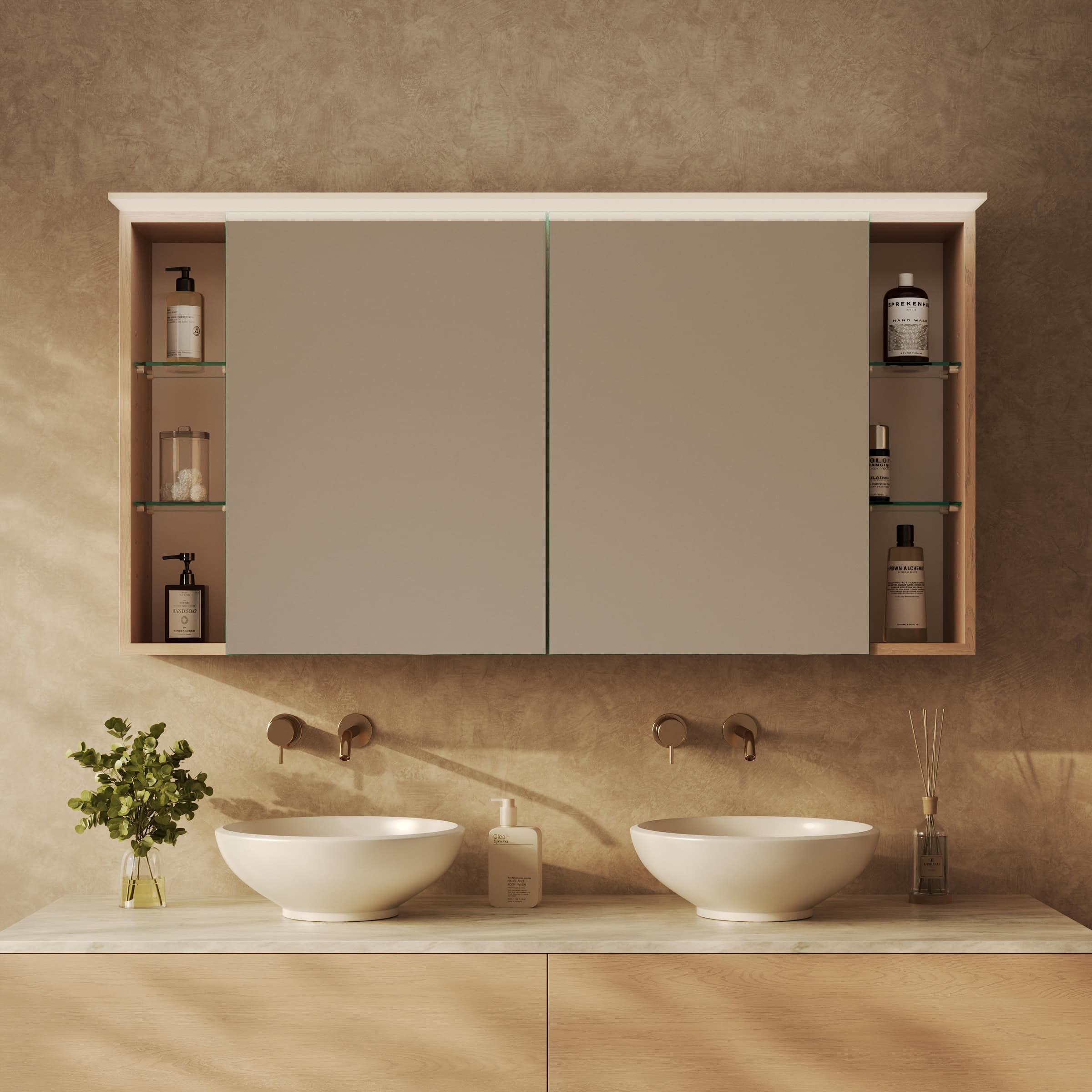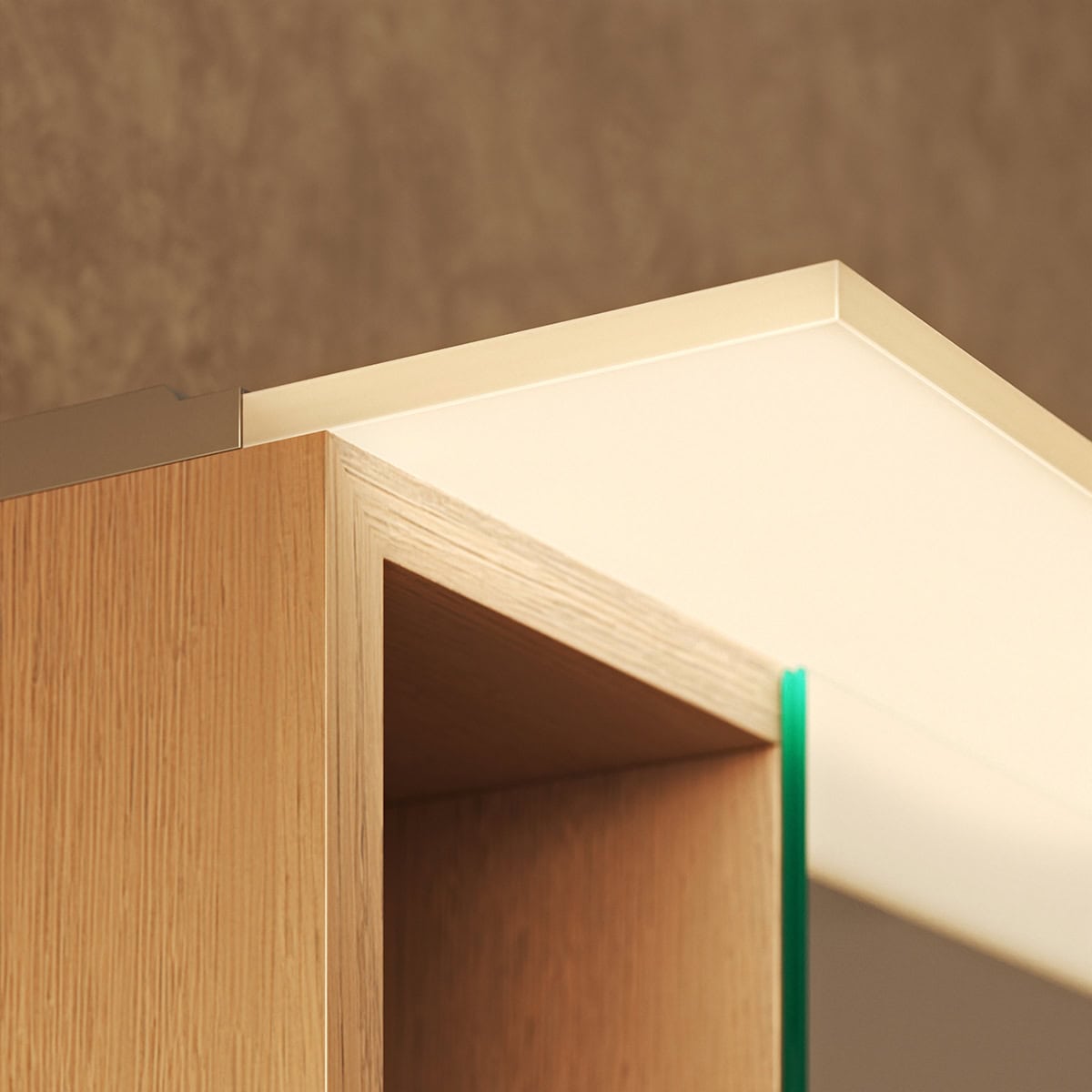 Der Spiegelschrank Luana wird exakt nach Ihren Wünschen und räumlichen Gegebenheiten gefertigt. Die brillanten Fronten aus 6 mm starkem Kristallspiegel mit sorgfältig geschliffenen und veredelten Kanten reflektieren nicht nur Ihr Bild, sondern auch Ihren Anspruch an Qualität. Der stabile Korpus aus 19 mm starken Holzdekorplatten, dessen Farbe und Tiefe Sie frei bestimmen, bildet dazu den passenden Rahmen. Einzigartig sind die seitlichen Fächer, die offenen, schnell zugänglichen Stauraum für Ihre täglichen Essentials oder dekorative Akzente bieten. Die integrierte LED-Aufsatzleuchte ist präzise für die kosmetische Anwendung optimiert und taucht Ihr Gesicht in ein schattenfreies, klares Licht. Im Inneren sorgen hochwertige Blum-Scharniere mit Soft-Close-Mechanismus für ein sanftes, geräuschloses Schließen der Türen – ein Detail, das die Wertigkeit dieses Badmöbels bei jeder Nutzung unterstreicht.