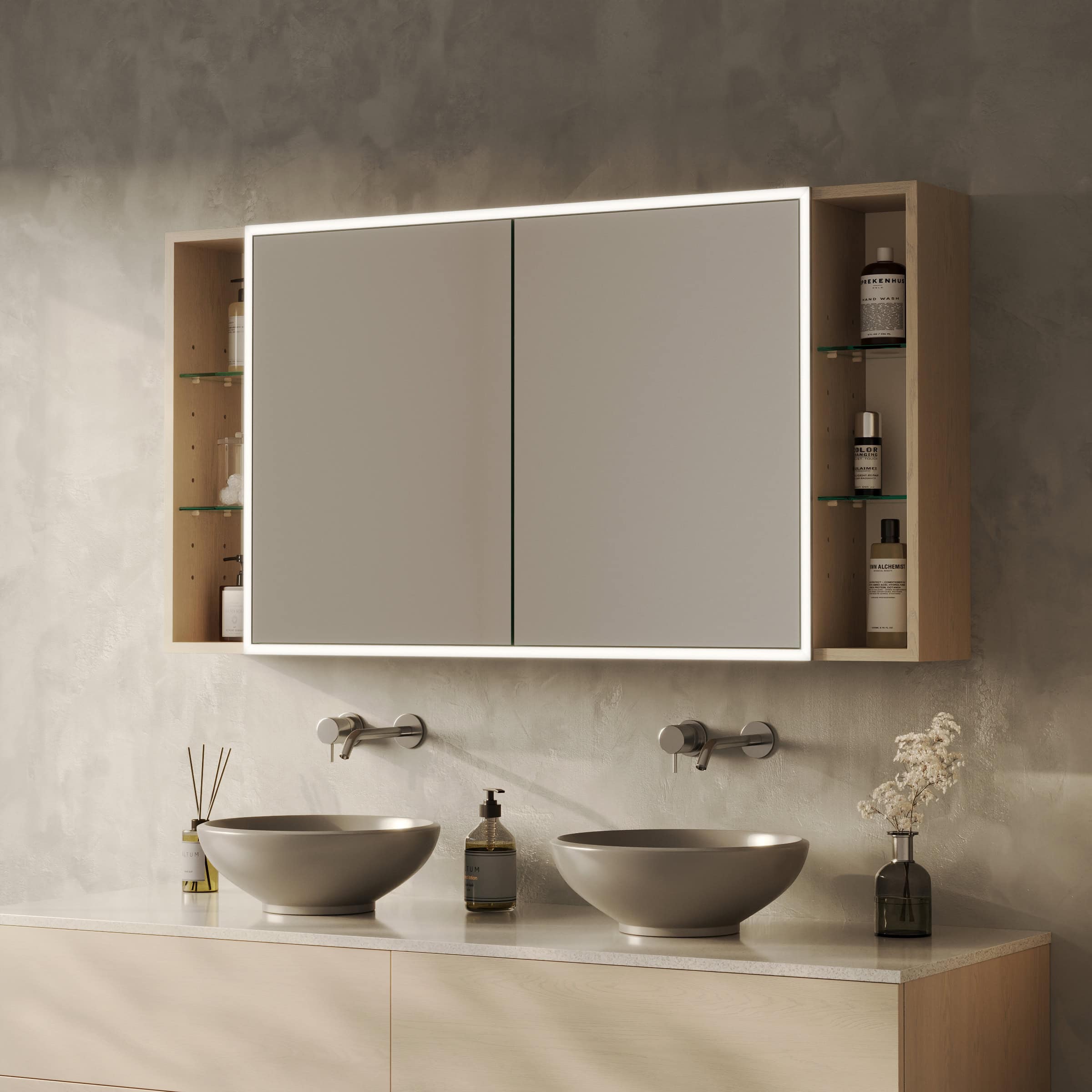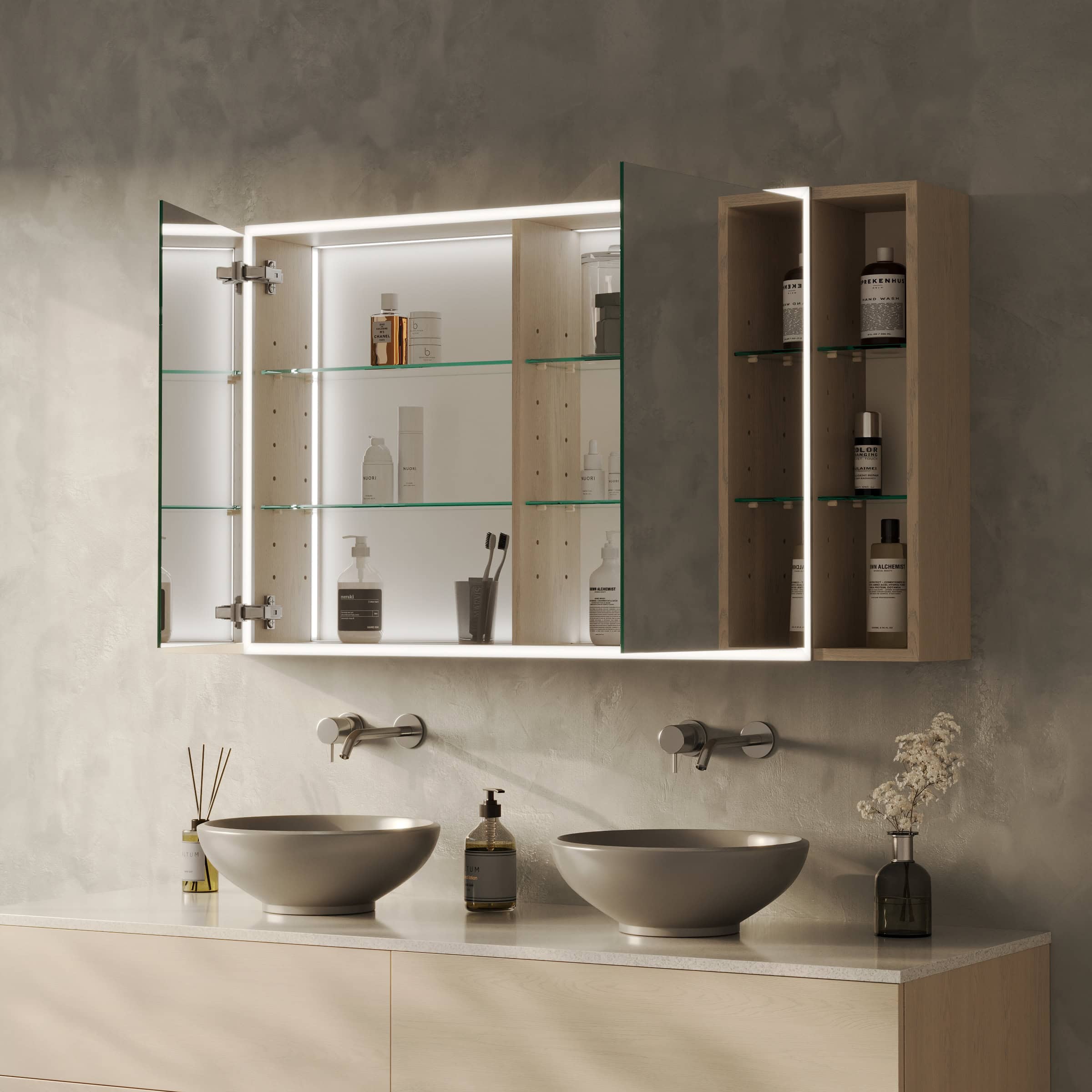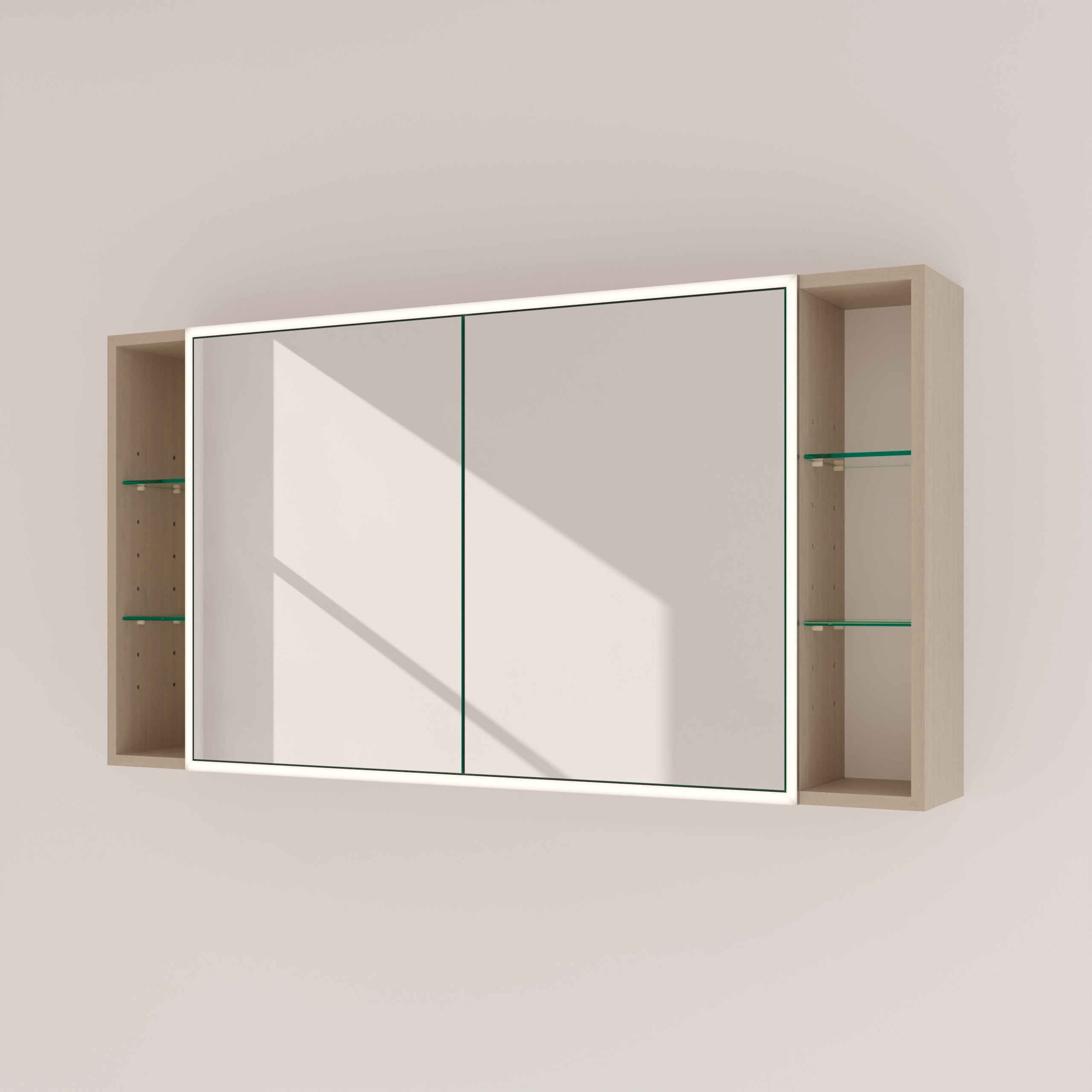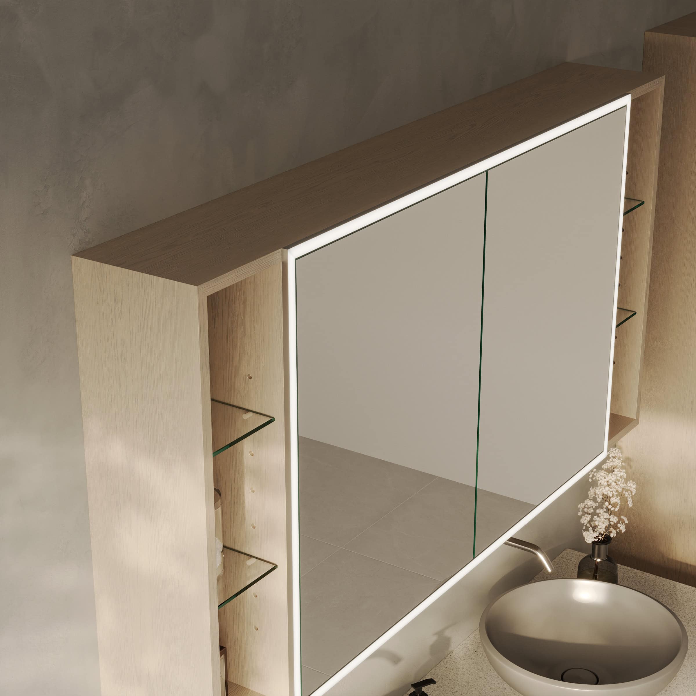 Der Spiegelschrank Lunara ist eine Komposition aus Licht, Raum und edlen Materialien, gefertigt nach Ihren individuellen Vorstellungen. Das Herzstück bildet der großzügige Stauraum hinter Türen aus brillantem, 6 mm starkem Kristallspiegel, deren geschliffene Kanten von höchster Handwerkskunst zeugen. Ein besonderes Highlight sind die offenen, seitlichen Fächer, die eine elegante Bühne für Ihre liebsten Parfums und Pflegeprodukte bieten. Die umlaufende LED-Beleuchtung schafft ein schattenfreies, tageslichtähnliches Licht, das speziell für die kosmetische Anwendung optimiert ist. Eingefasst in 2 cm breite, satinierte Leuchtfelder, erstrahlt Ihr Spiegelbild in einem schmeichelhaften Schein. Im ausgeschalteten Zustand fügen sich diese Flächen dezent als milchglasartige Designelemente in das Gesamtbild ein. Der robuste, 19 mm starke Korpus aus hochwertigen Holzdekorplatten und die präzisen Blum-Scharniere mit Soft-Close-Mechanismus unterstreichen den Anspruch an Qualität und Langlebigkeit, die Sie bei jeder Berührung spüren.