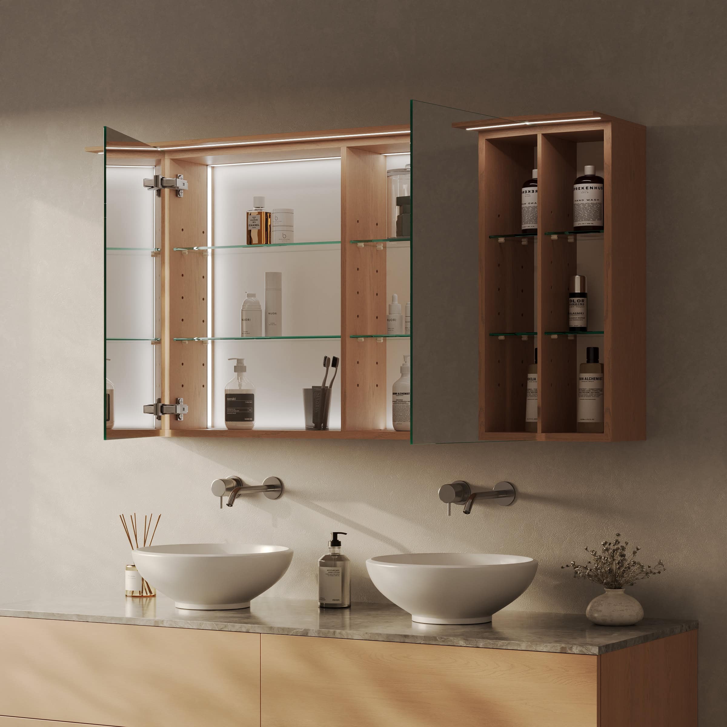 Der Spiegelschrank Sonela ist mehr als nur Stauraum – er ist ein Bekenntnis zu Ihrem persönlichen Stil und ein maßgefertigtes Herzstück für Ihr Badezimmer. Gefertigt nach Ihren individuellen Breiten-, Höhen- und Tiefenvorgaben, integriert er sich nahtlos in jede Raumarchitektur. Die Front aus brillantem, 6 mm starkem Kristallspiegel mit präzise geschliffenen Kanten reflektiert nicht nur Ihr Bild, sondern auch die Qualität des gesamten Möbels. Die innovative LED-Aufsatzleuchte ist speziell für kosmetische Anwendungen optimiert und taucht Ihr Gesicht in schattenfreies, klares Licht. Hinter den Spiegeltüren, die dank hochwertiger Blum-Scharniere sanft und lautlos schließen (Soft Close), verbirgt sich ein durchdachtes Ordnungssystem. Der robuste, 19 mm starke Korpus in Ihrem Wunsch-Holzdekor wird durch die praktischen, seitlichen Fächer ergänzt, die Ihre liebsten Pflegeprodukte oder dekorative Accessoires stilvoll präsentieren und stets griffbereit halten.