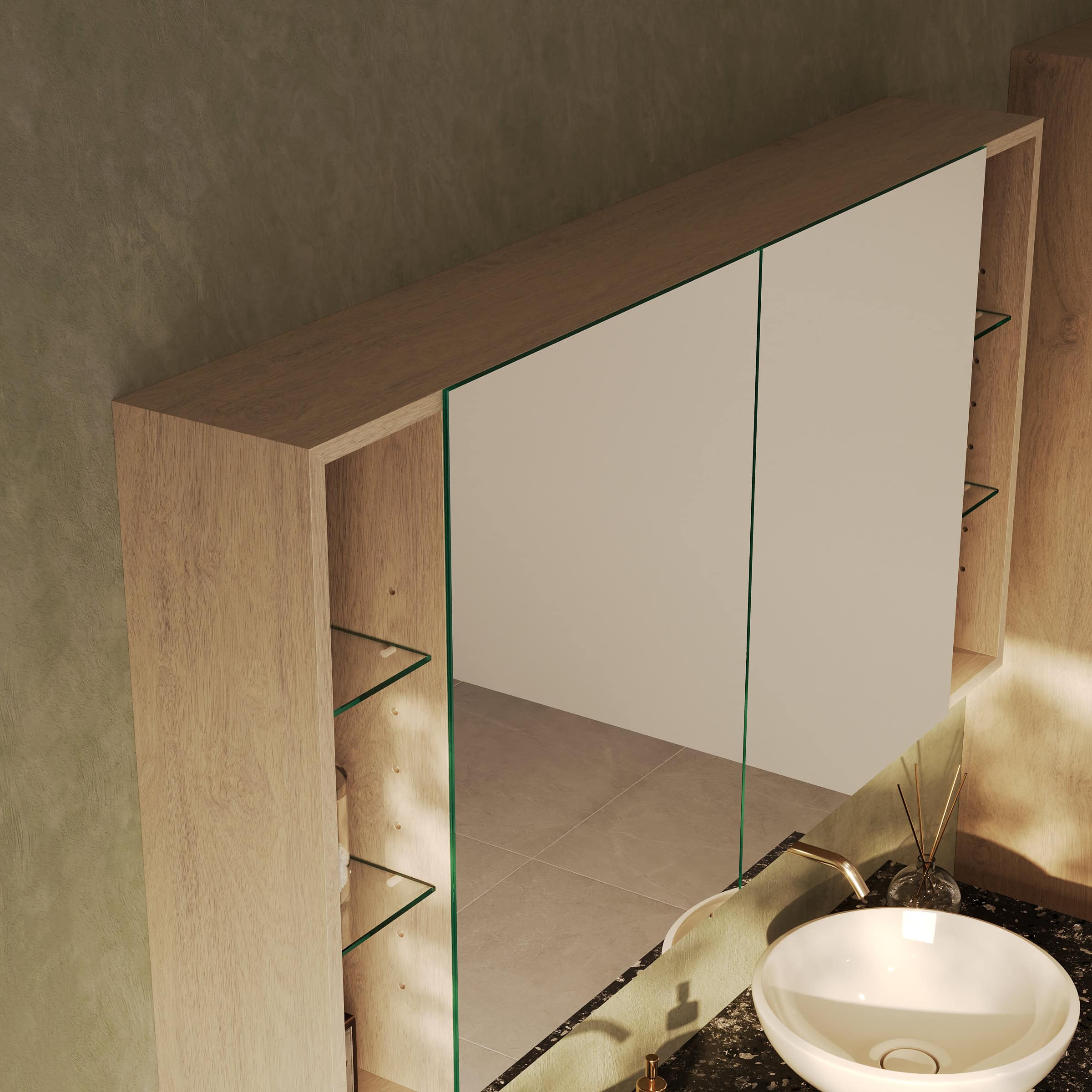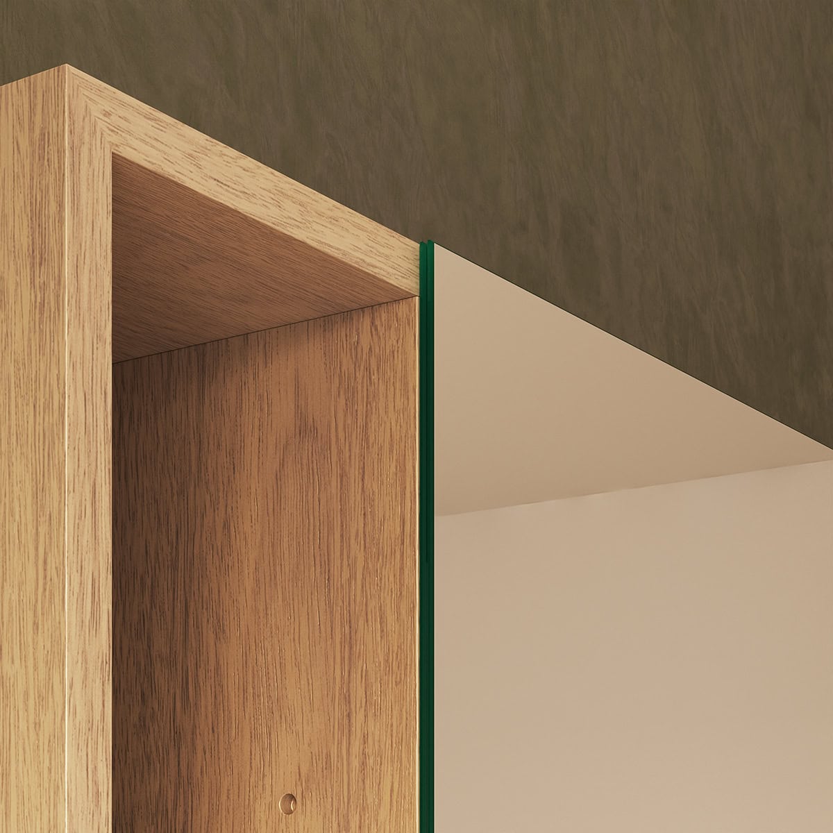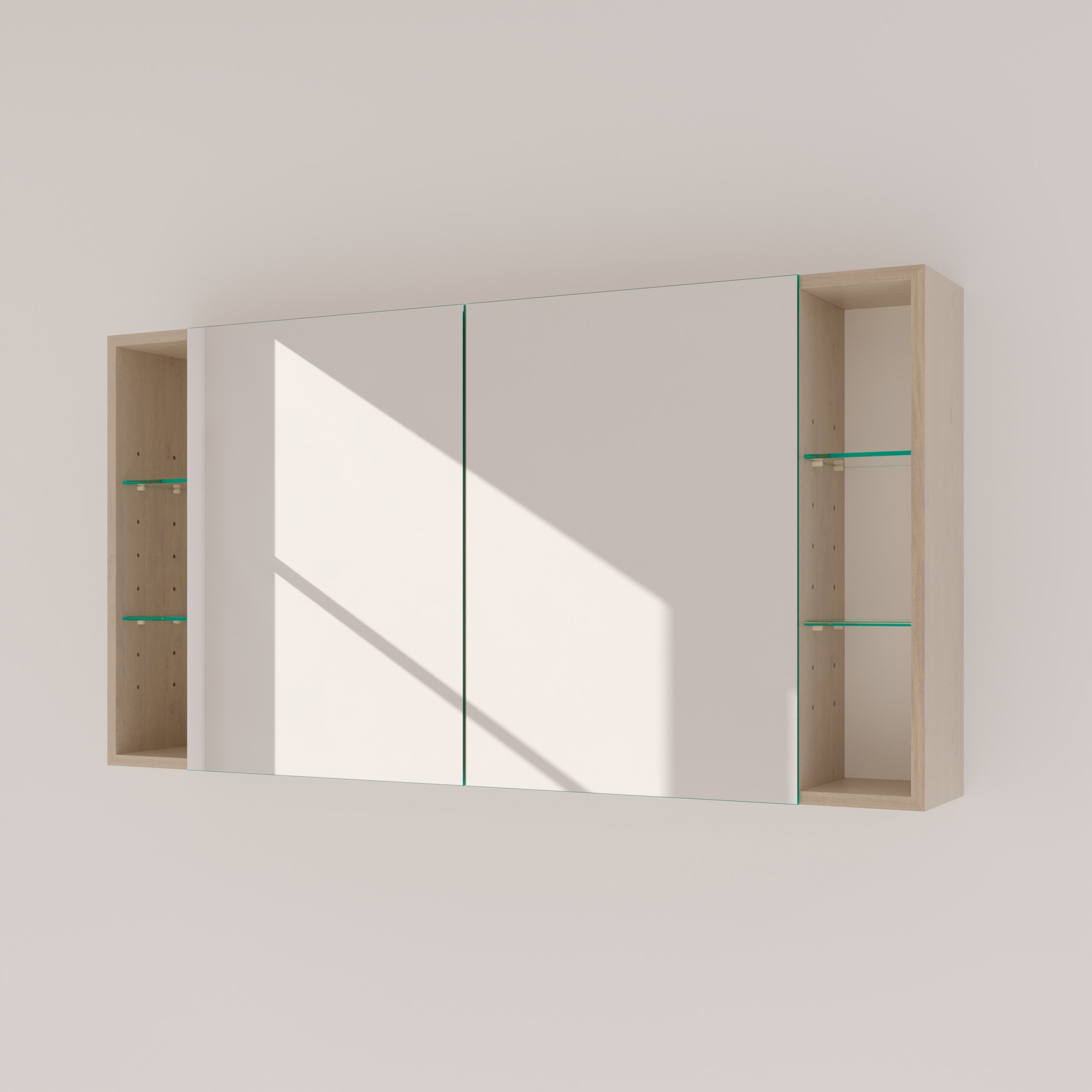 Der Spiegelschrank Aurea ist mehr als nur ein Aufbewahrungsmöbel – er ist ein zentrales Gestaltungselement, das sich nahtlos in die Architektur Ihres Badezimmers einfügt. Dank der individuellen Maßanfertigung bestimmen Sie Breite, Höhe und Tiefe selbst und kreieren ein Möbelstück, das exakt auf Ihre räumlichen Gegebenheiten und persönlichen Bedürfnisse zugeschnitten ist. Die seitlichen Fächer bieten eine offene Bühne für Ihre liebsten Pflegeprodukte oder dekorative Akzente und verbinden so praktischen Nutzen mit wohnlicher Atmosphäre. Hinter den Türen aus brillantem, 6 mm starkem Kristallspiegel erwartet Sie eine Offenbarung: Eine dezente, für kosmetische Anwendungen optimierte LED-Innenbeleuchtung illuminiert den Inhalt sanft und blendfrei. Jeder Griff wird so zu einem Akt der Klarheit. Der robuste, 19 mm starke Korpus in Ihrem Wunsch-Holzdekor und die weltbekannten Blum-Scharniere mit Soft-Close-Mechanismus garantieren eine Stabilität und eine lautlose, sanfte Bedienung, die Sie jeden Tag aufs Neue schätzen werden.
