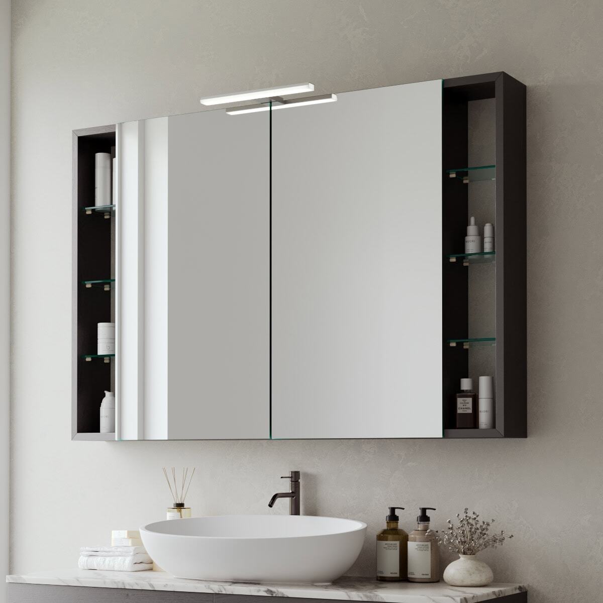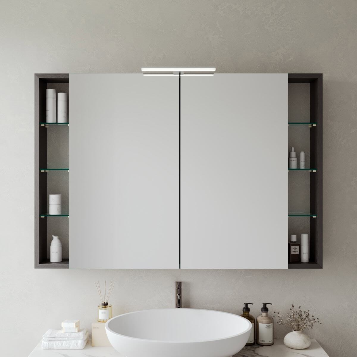 Gestalten Sie Ihr Badritual neu – mit einem Spiegelschrank, der sich präzise Ihren Wünschen und Ihrem Raum anpasst.