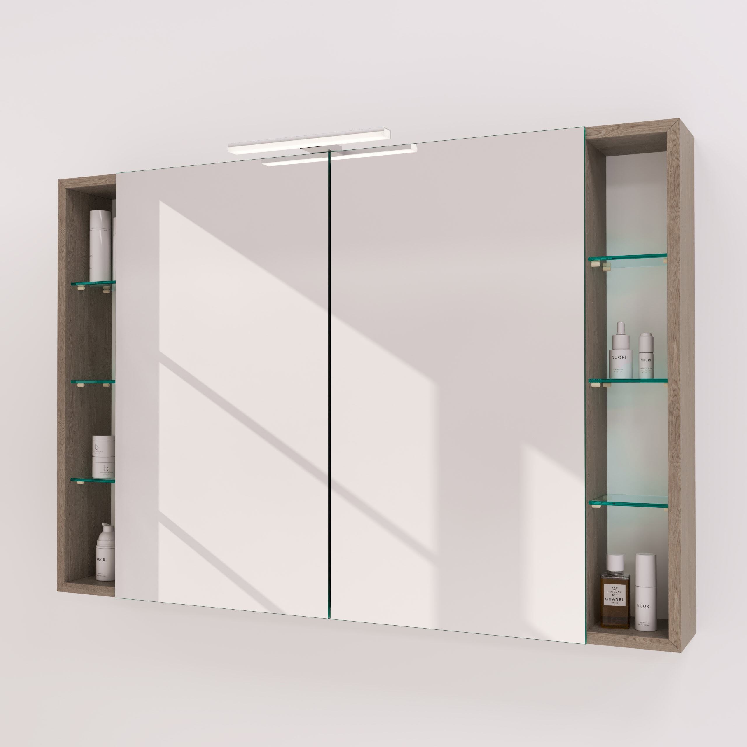 Der Spiegelschrank Lumia ist die Antwort auf den Wunsch nach Individualität und perfekter Integration im Badezimmer. Dank der Fertigung nach Maß fügt er sich millimetergenau in Ihre Raumarchitektur ein und schafft ein harmonisches Gesamtbild. Die seitlichen, offenen Fächer lockern das Design auf und bieten eine stilvolle Bühne für täglich genutzte Essentials oder dekorative Objekte. Hinter den Türen, die von präzisen Blum-Scharnieren mit Soft-Close-Mechanismus sanft und lautlos bewegt werden, verbirgt sich großzügiger, flexibler Stauraum. Das Herzstück ist die integrierte LED-Aufsatzleuchte: Speziell für kosmetische Anwendungen optimiert, liefert sie ein schattenfreies, klares Licht für Ihre tägliche Pflegeroutine. Das brillante Abbild im 6 mm starken Kristallspiegel, dessen Kanten sorgfältig geschliffen und veredelt sind, vollendet das Erlebnis von Luxus und Funktionalität.