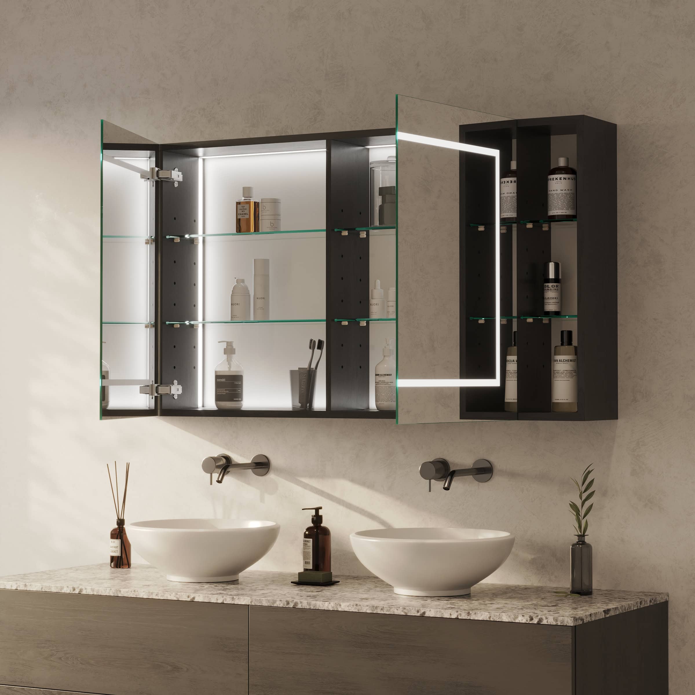 Der Modena vereint meisterhafte Verarbeitung, langlebige Materialien und zeitloses Design. Konfigurieren Sie jetzt Ihren Spiegelschrank nach Maß und verleihen Sie Ihrem Bad den letzten Schliff.
