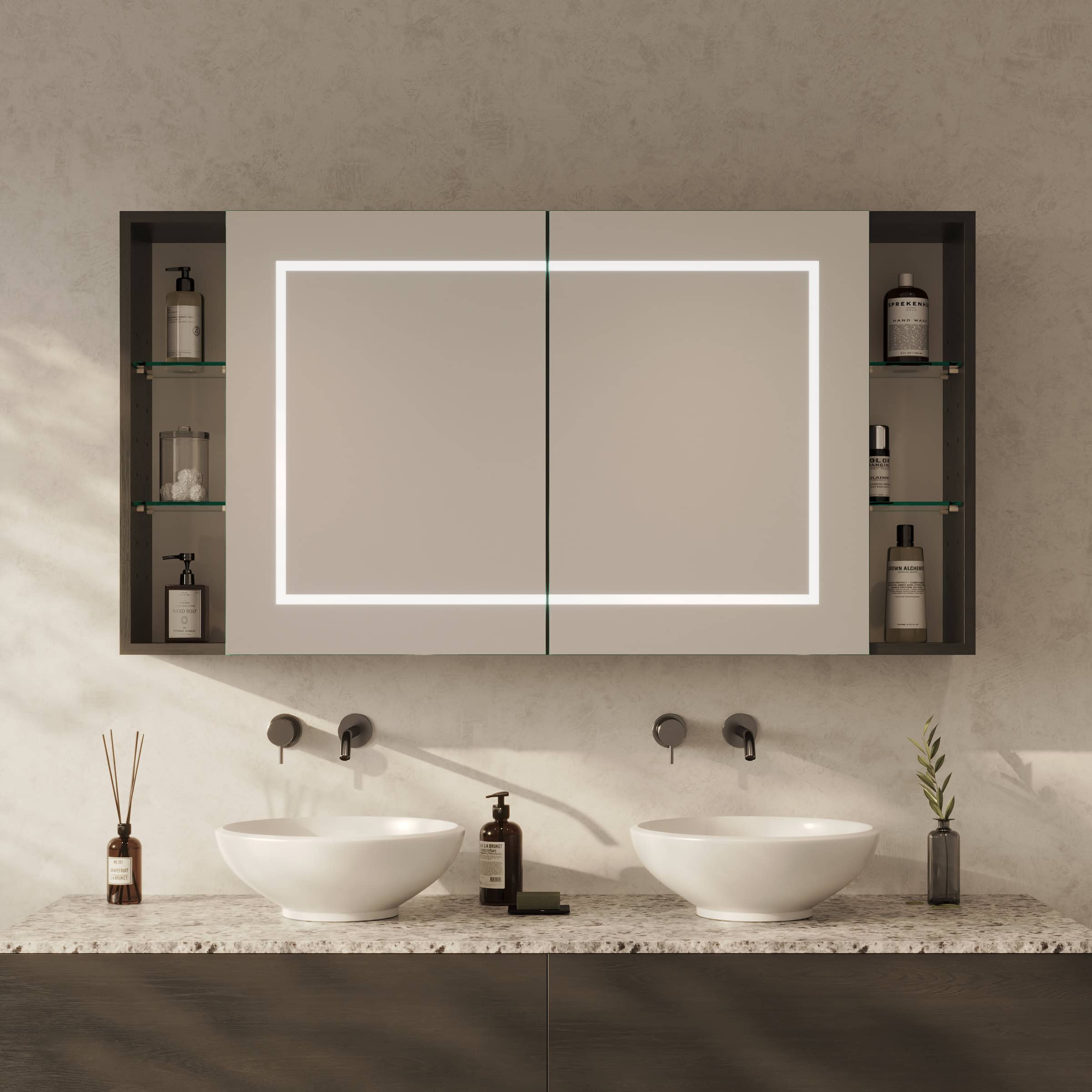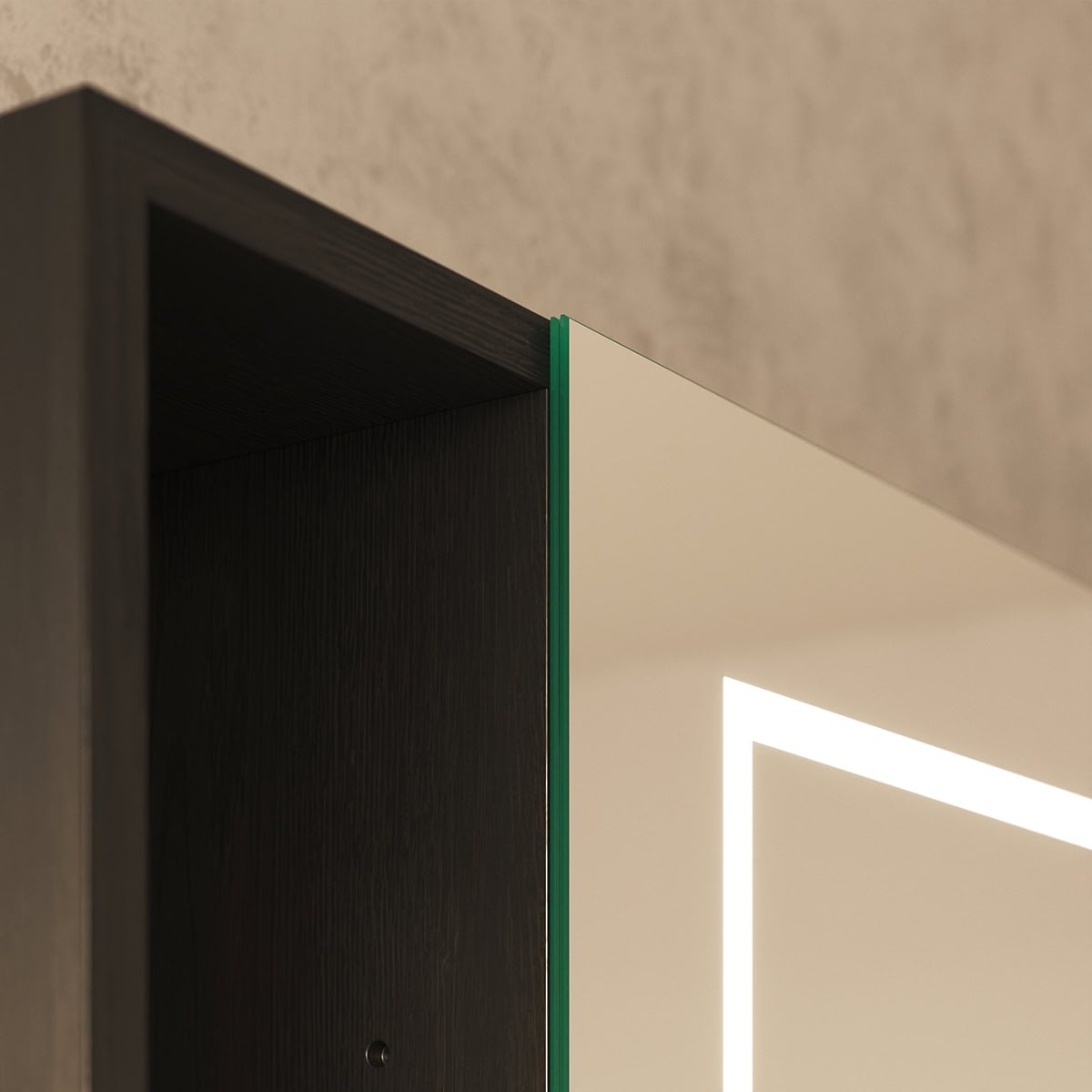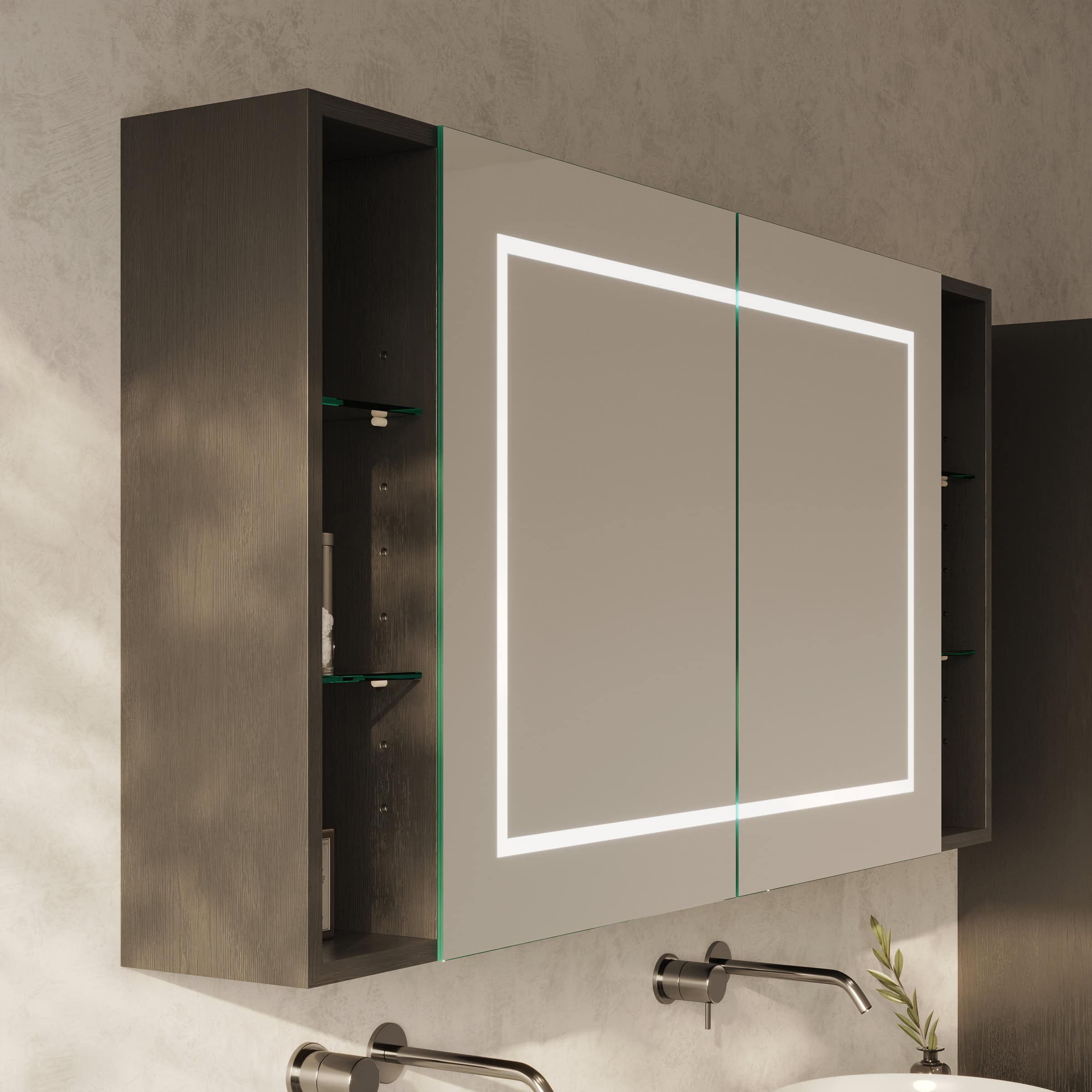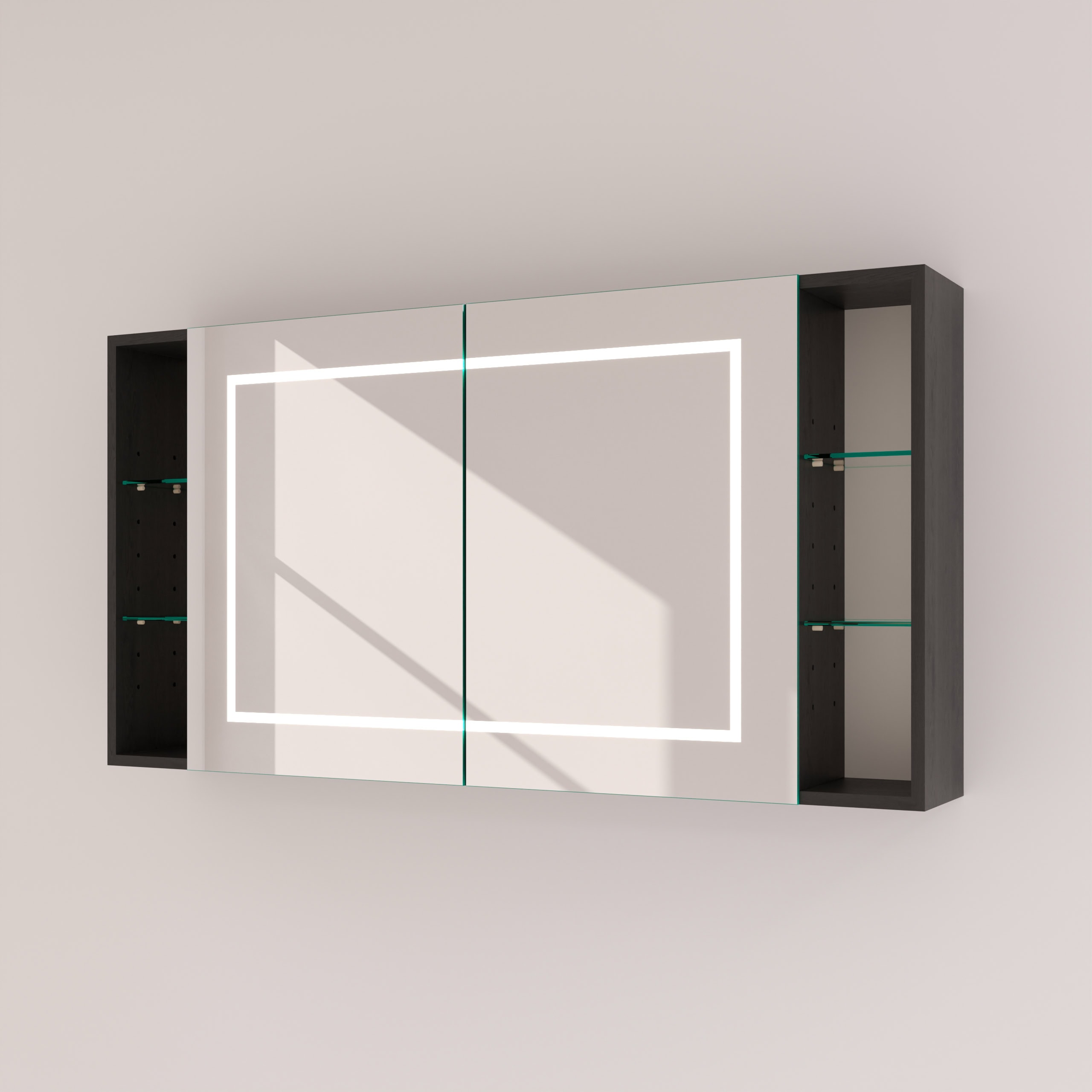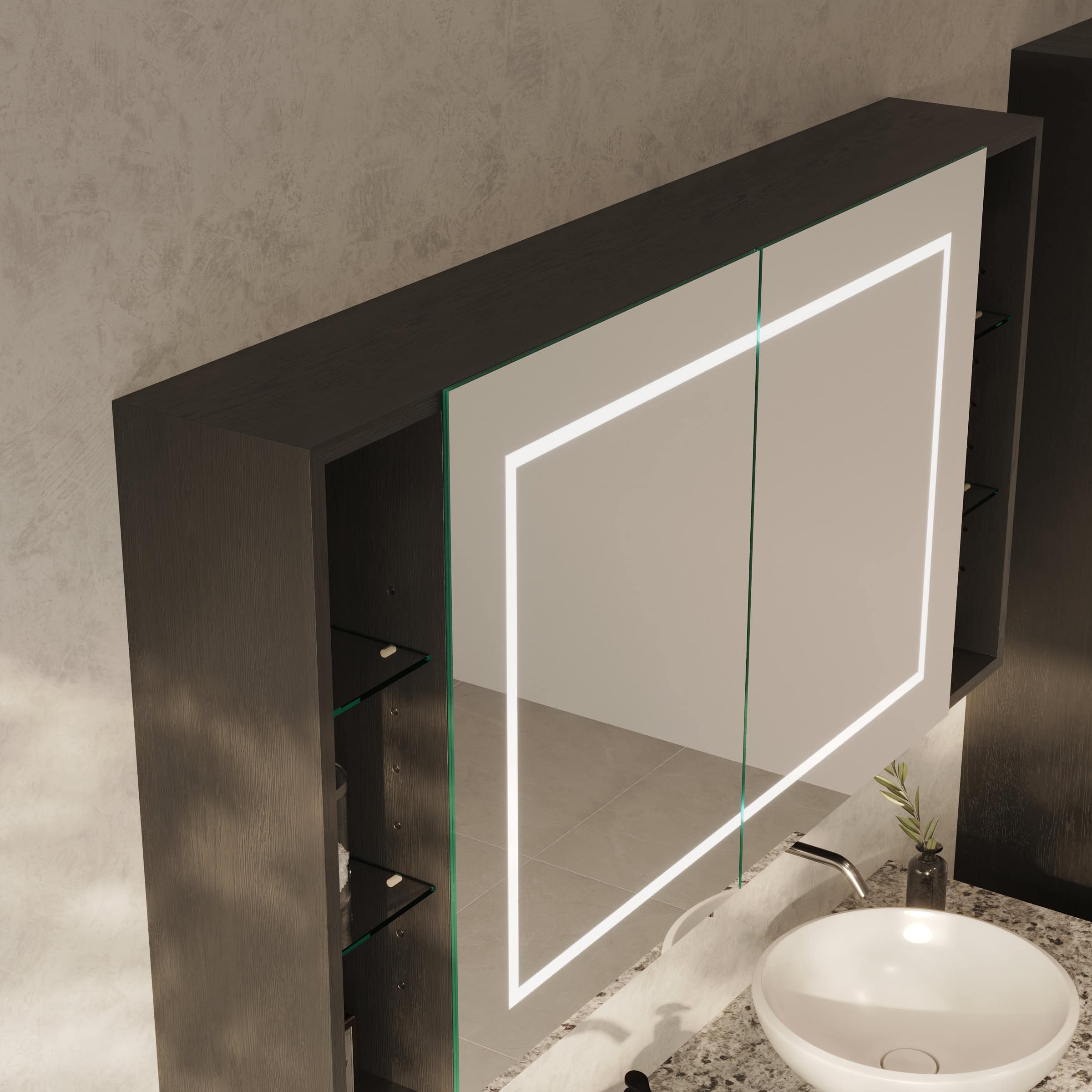 Der Spiegelschrank Modena ist mehr als nur Stauraum; er ist ein zentrales Gestaltungselement, das sich millimetergenau Ihren Wünschen anpasst. Gefertigt aus robusten 19mm Holzdekorplatten in Ihrer Wunschfarbe, bildet der Korpus die Basis für ein langlebiges Möbelstück. Die Türen aus 6mm starkem Kristallspiegel mit präzise geschliffenen und veredelten Kanten gleiten dank hochwertiger Blum-Scharniere mit Soft-Close-Mechanismus sanft und beinahe geräuschlos zu. Das Highlight ist die umlaufende LED-Beleuchtung: Durch satinierte Glasflächen tritt das Licht indirekt aus und erzeugt eine schattenfreie, für kosmetische Anwendungen optimierte Ausleuchtung. Ausgeschaltet fügen sich die Leuchtfelder als elegante Milchglas-Optik harmonisch in das Design ein. Die praktischen unteren Fächer bieten zusätzlichen, offenen Platz für Ihre täglichen Essentials oder dekorative Akzente und unterstreichen den durchdachten Charakter dieses Spiegelschranks fürs Bad.
