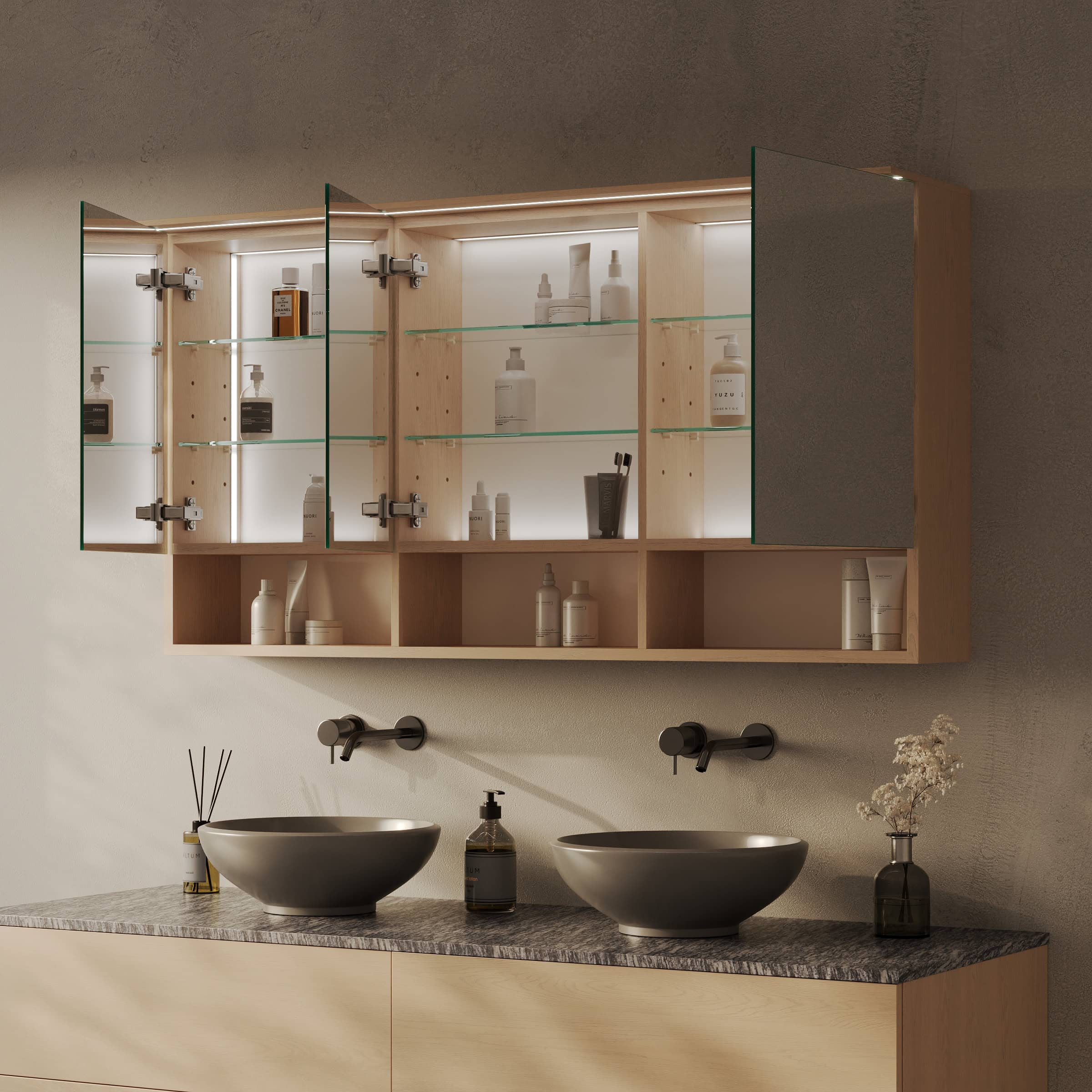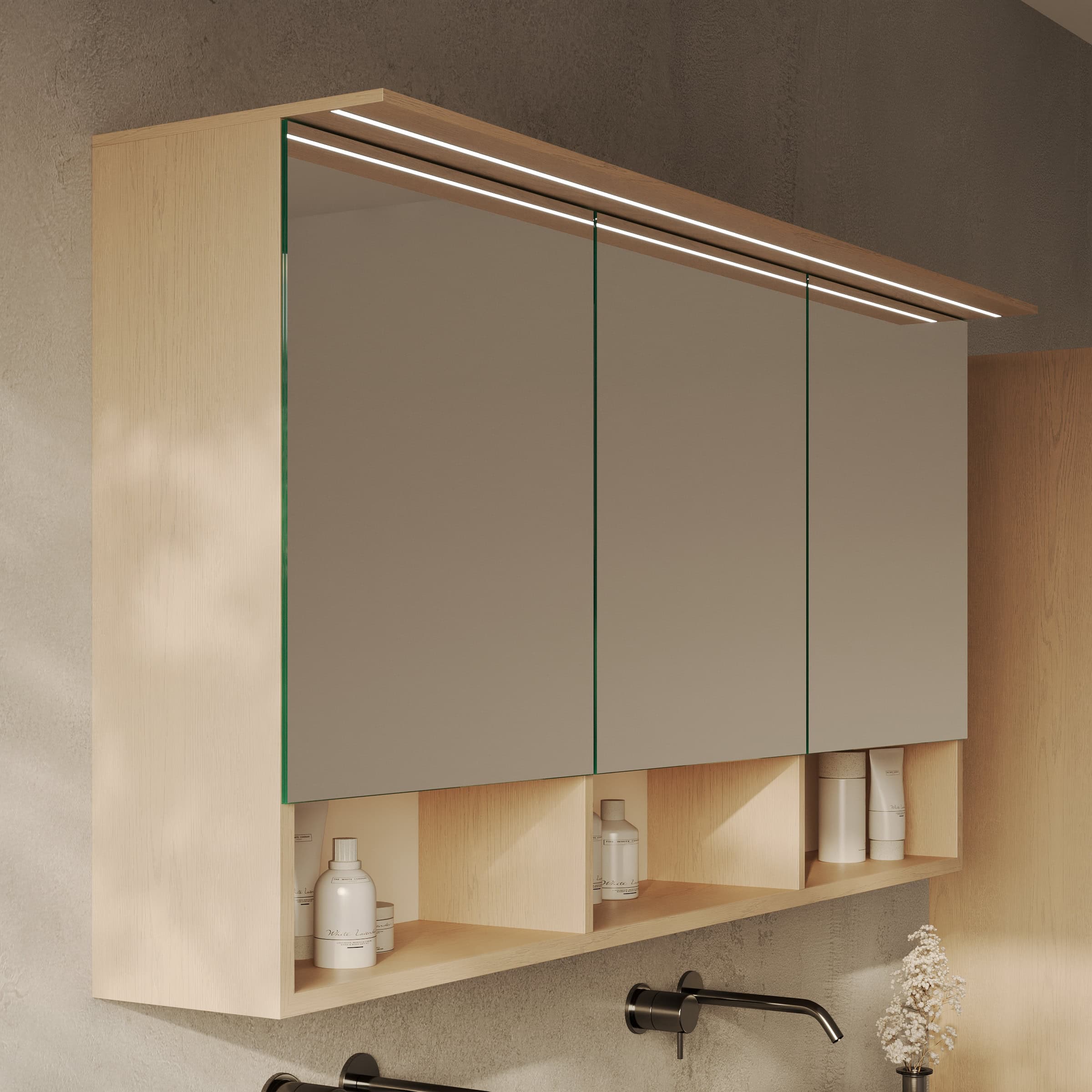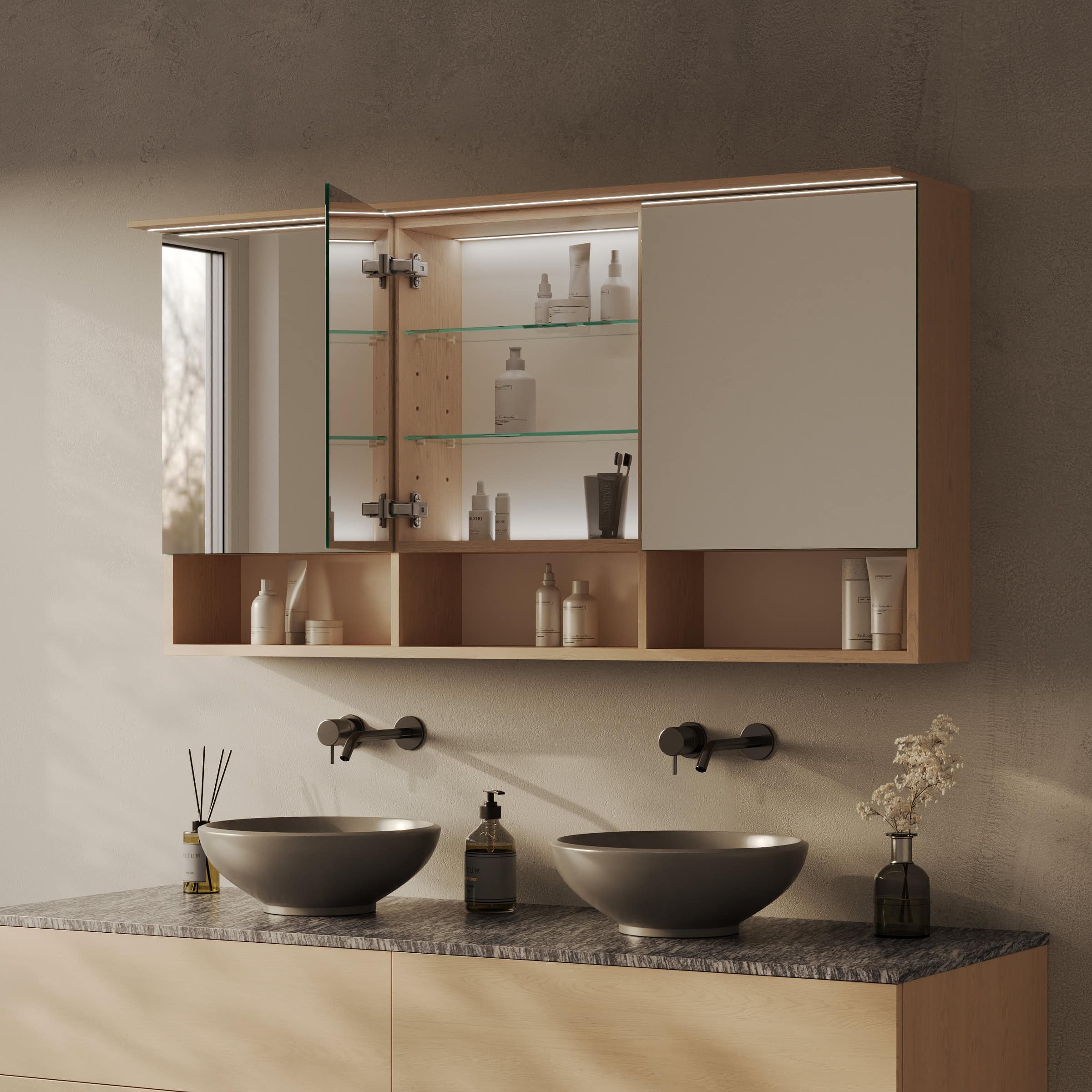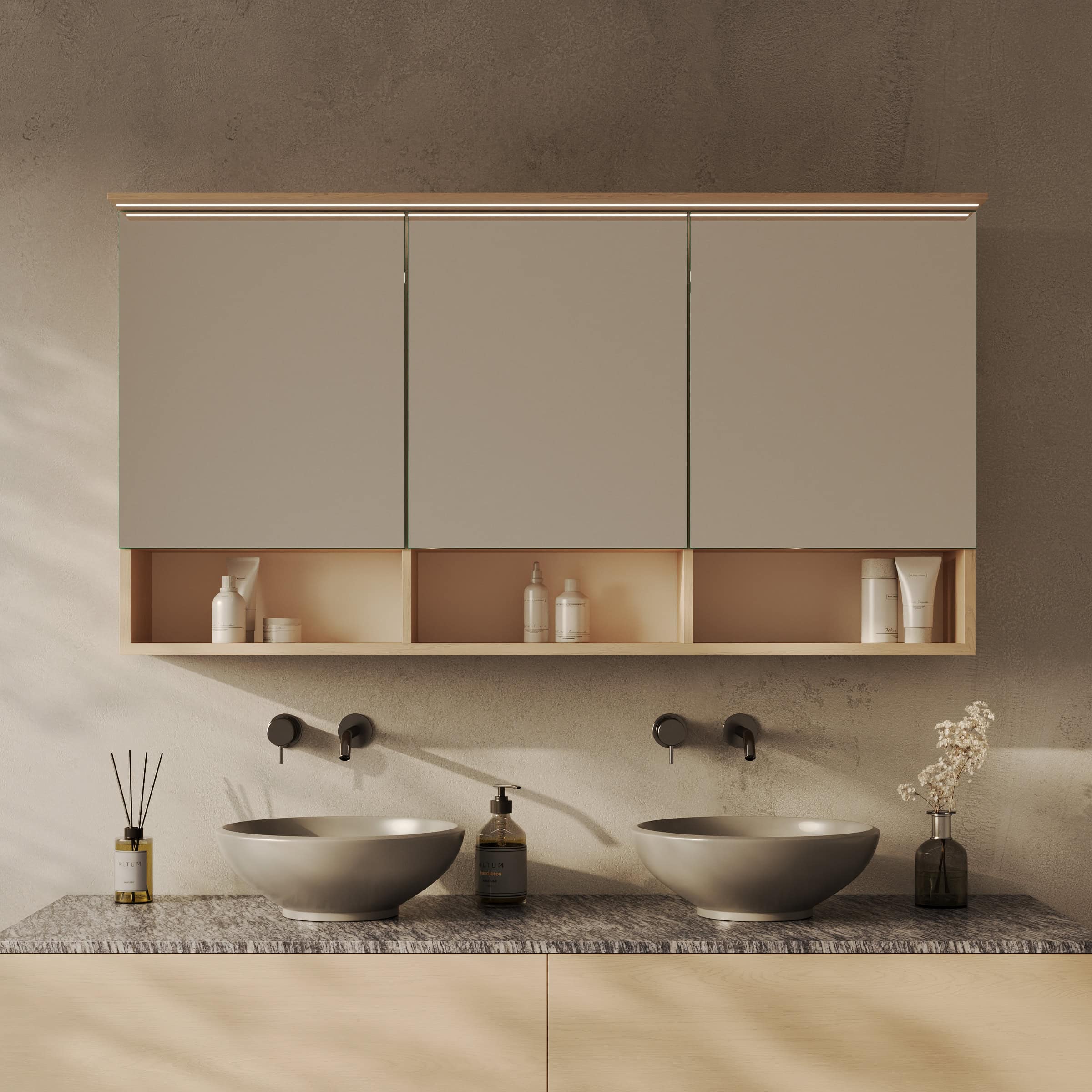 Spiegelschrank Sonela: Maßgefertigte Eleganz trifft auf durchdachte Funktion.