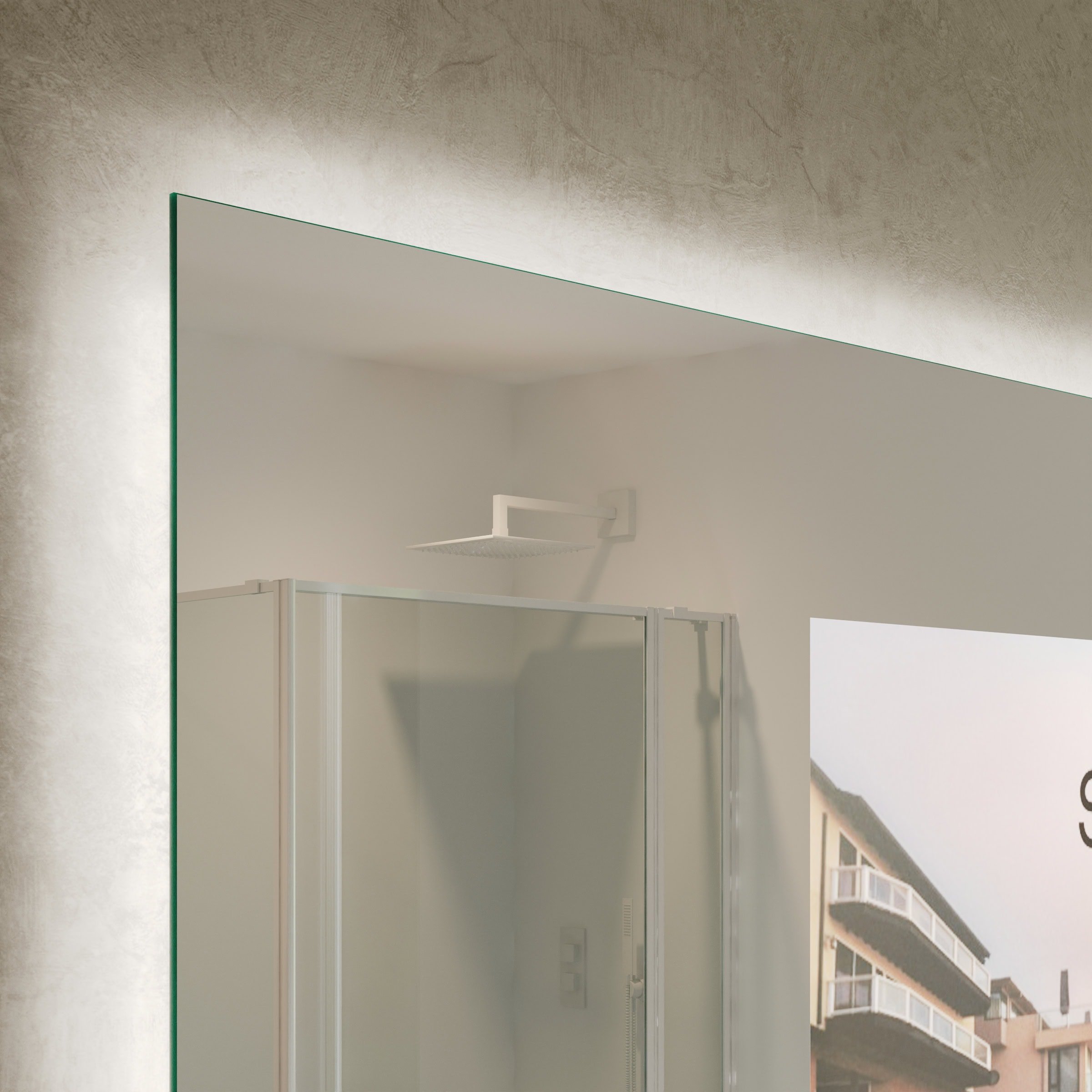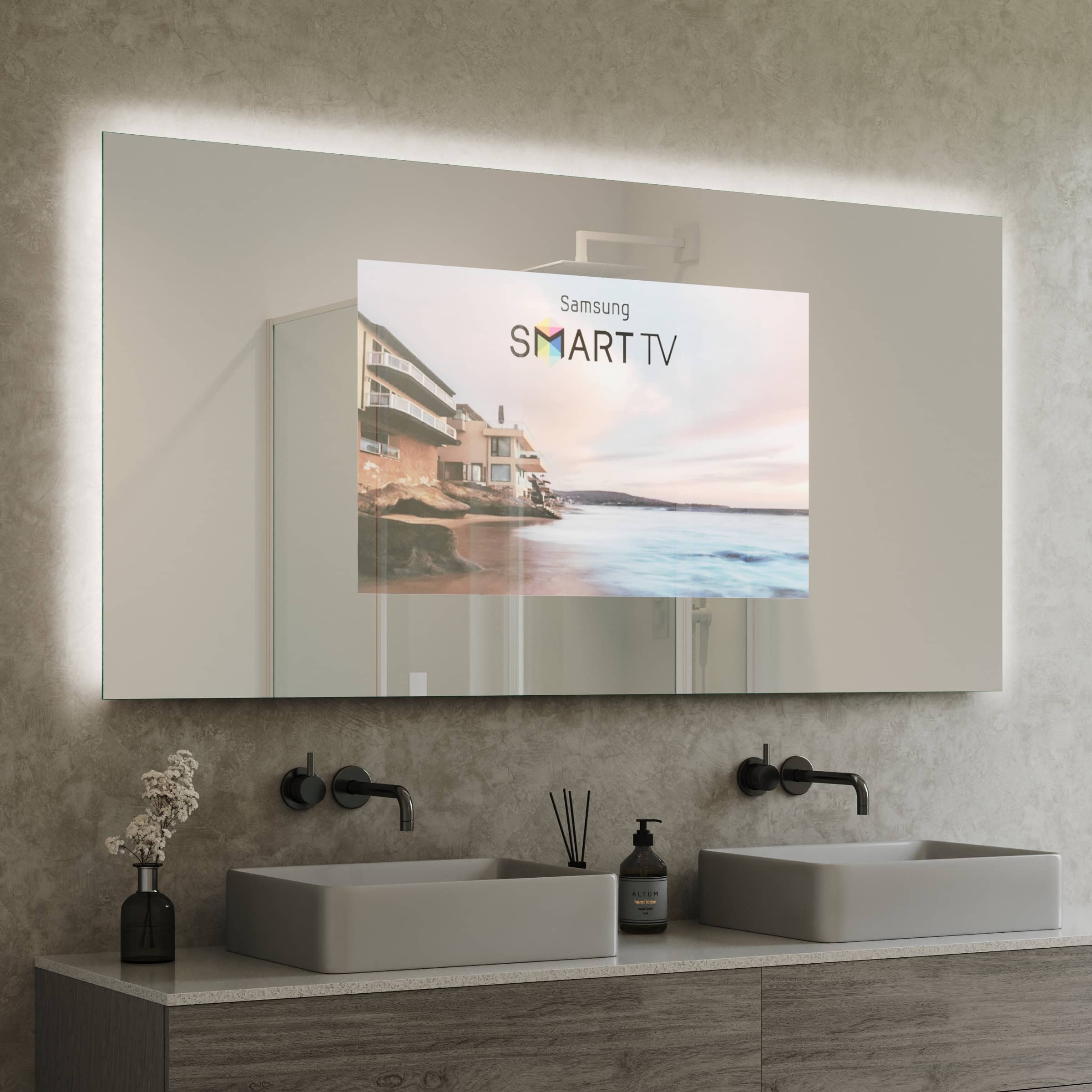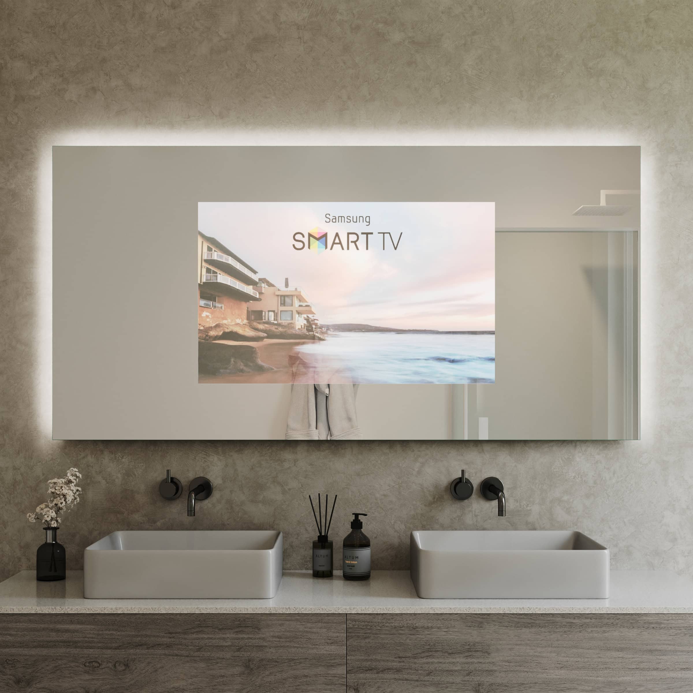 Der TV Spiegel Aurea ist mehr als nur ein Spiegel – er ist ein Statement für anspruchsvolles Interior Design. Gefertigt als individuelle Maßanfertigung, passt er sich millimetergenau Ihren räumlichen Gegebenheiten an und schafft ein harmonisches Gesamtbild. Die Basis bildet ein 6mm starkes Spionglas, dessen geschliffene und veredelte Kanten von höchster Handwerkskunst zeugen. Im ausgeschalteten Zustand präsentiert sich eine makellose, brillante Spiegelfläche. Auf Knopfdruck erwacht der integrierte Bildschirm zum Leben und bietet erstklassiges Entertainment, ohne die Ästhetik des Raumes zu stören. Die innovative LED Beleuchtung, positioniert links, oben und rechts, sorgt für eine schattenfreie und für kosmetische Anwendungen optimierte Ausleuchtung Ihres Gesichts. Gleichzeitig erzeugt die sanfte Hintergrundbeleuchtung eine schwebende Optik und taucht Ihr Badezimmer in ein stimmungsvolles, indirektes Licht – für Momente der puren Entspannung.