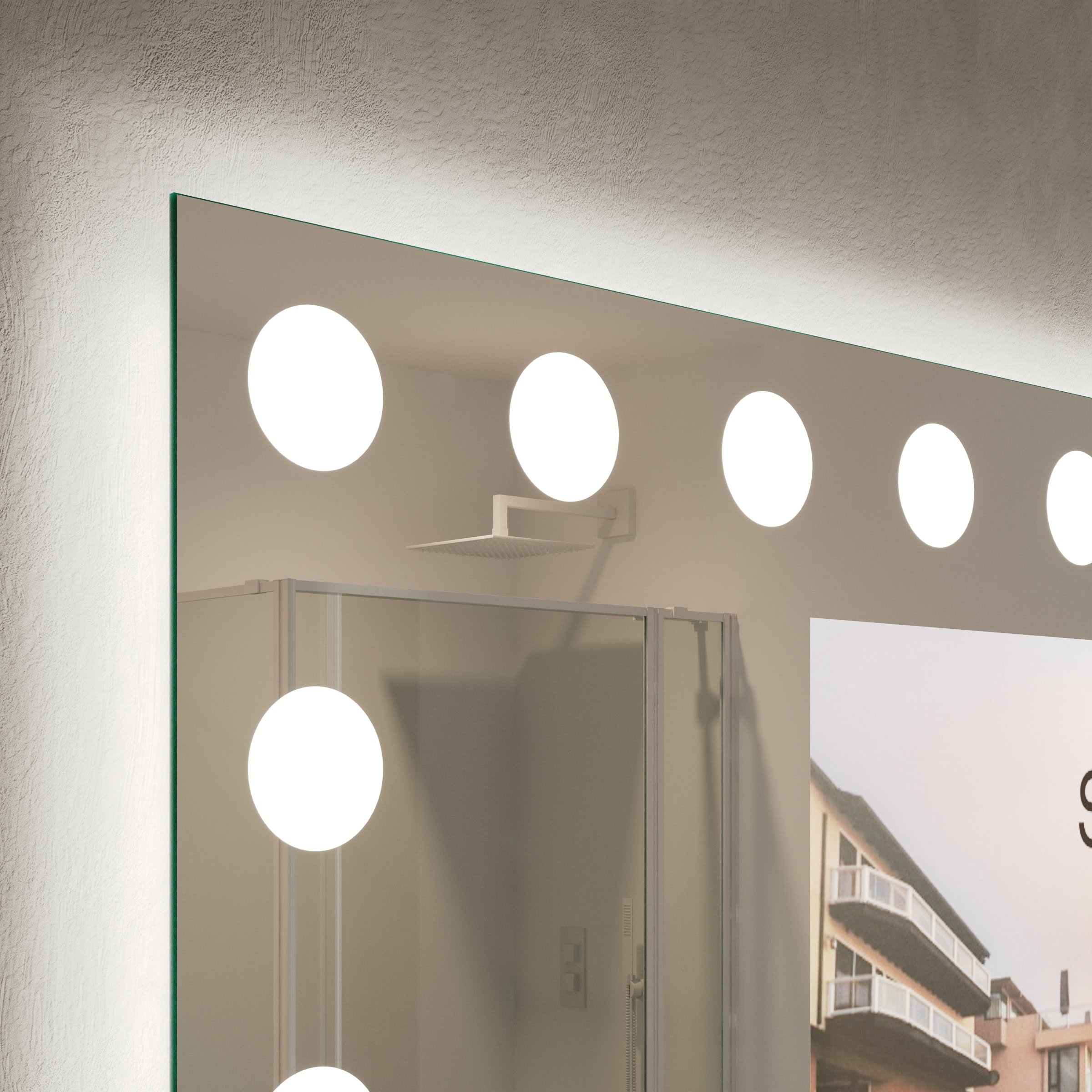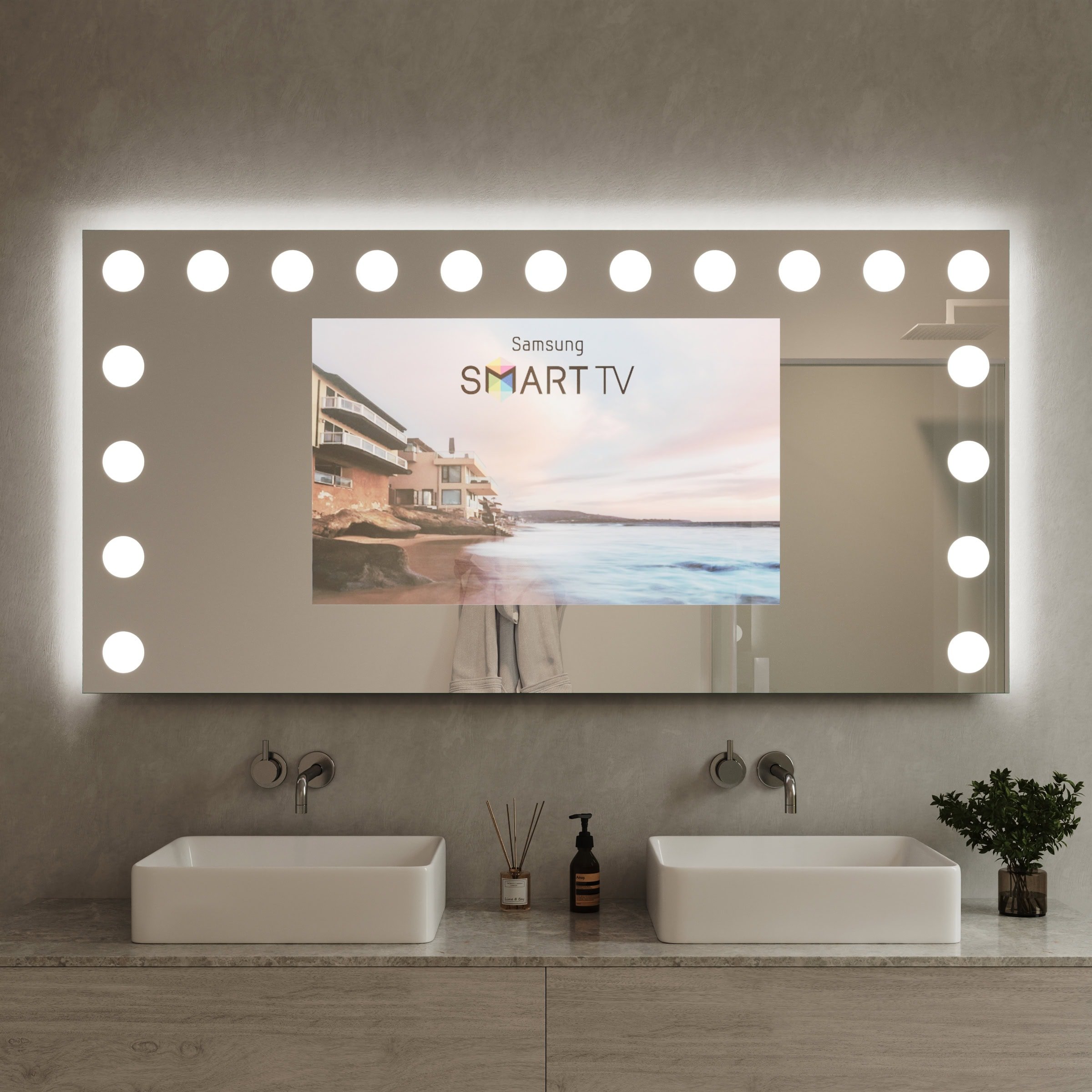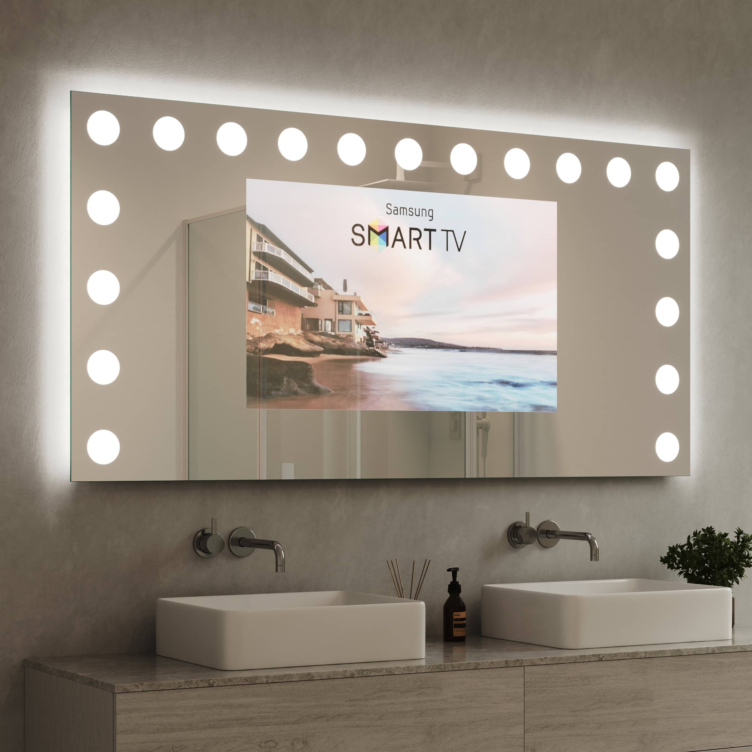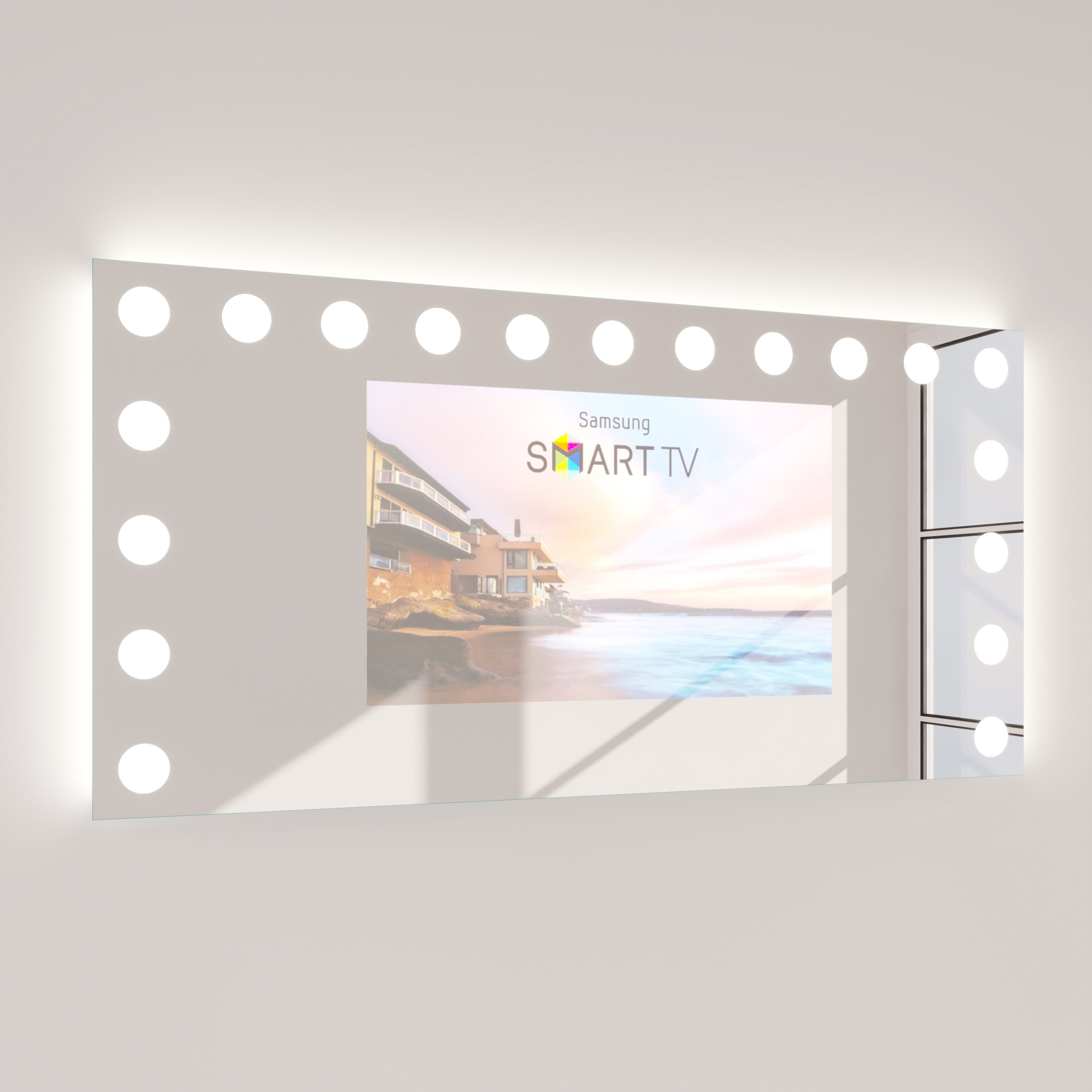 Gefertigt exakt nach Ihren Wünschen, fügt sich dieser TV Spiegel als architektonisches Highlight in Ihr Raumkonzept ein. Im ausgeschalteten Zustand präsentiert er sich als makelloser Spiegel aus 6mm starkem Spionglas mit edel geschliffenen und veredelten Kanten. Ein Fingertipp genügt, und die Fläche erwacht zum Leben, um Ihnen Nachrichten oder Ihre Lieblingsserie direkt im Badezimmer zu zeigen. Die dreiseitige LED Beleuchtung im Hollywood-Stil – links, oben und rechts positioniert – erzeugt durch indirekt erhellte Leuchtfelder ein weiches, schmeichelhaftes Licht. Die Lichtstärke ist dabei gezielt für die kosmetische Anwendung optimiert und ermöglicht eine schattenfreie, farbechte Ausleuchtung für Ihr tägliches Styling. So wird der TV Spiegel mit Beleuchtung nicht nur zum Unterhaltungszentrum, sondern auch zum professionellen Werkzeug in Ihrem ganz persönlichen Spa-Bereich.