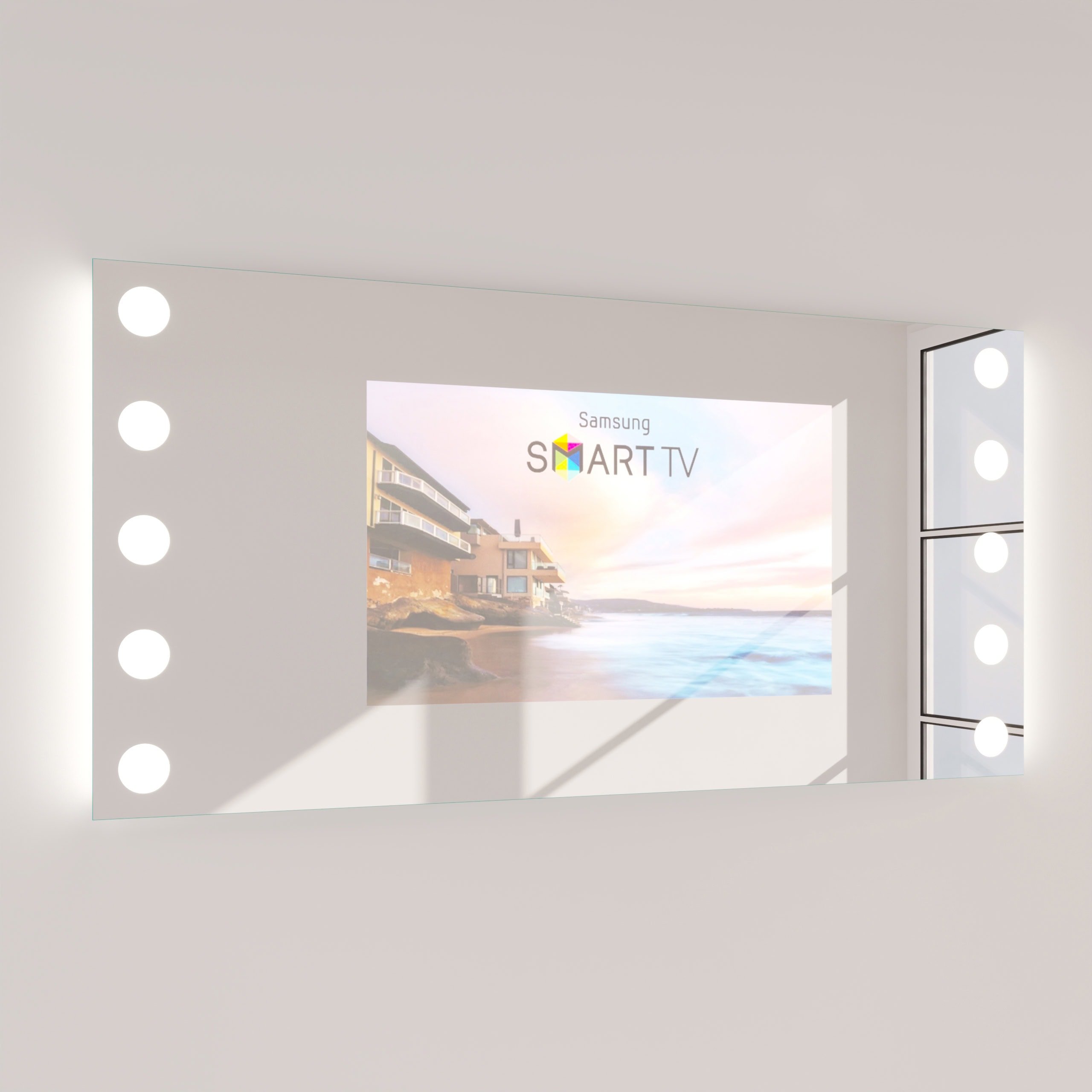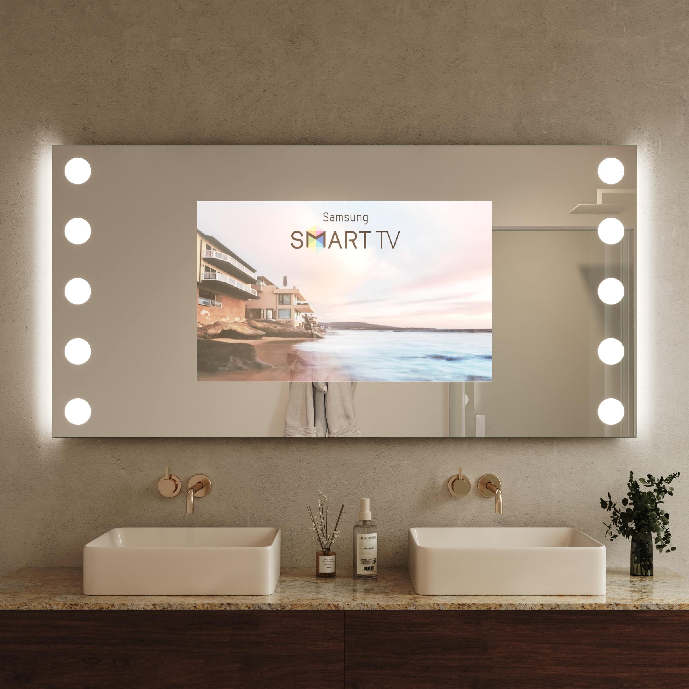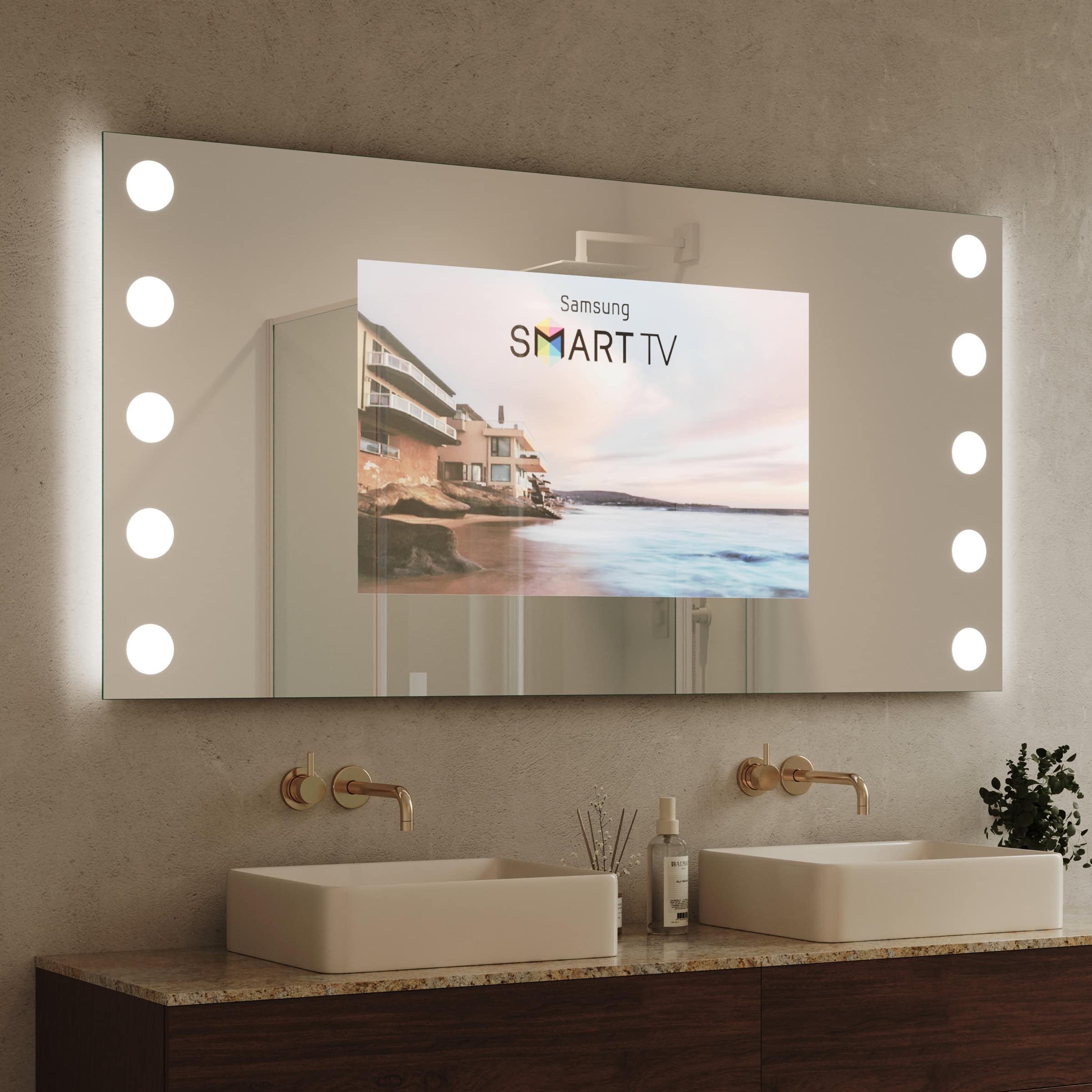 Der TV Spiegel Hollywood Dice ist mehr als nur ein Spiegel – er ist ein Statement für anspruchsvolles Design und intelligente Funktionalität in Ihrem Badezimmer. Im ausgeschalteten Zustand präsentiert er sich als makellose Spiegelfläche aus 6 mm starkem Spionglas, dessen geschliffene und veredelte Kanten höchste Qualität signalisieren. Auf Wunsch enthüllt er ein brillantes TV-Bild für entspannte Momente oder den informierten Start in den Tag. Die seitlich positionierte LED-Beleuchtung im Hollywood-Stil ist präzise auf kosmetische Anwendungen optimiert. Sie erzeugt durch indirekt erhellte Leuchtfelder ein schattenfreies, weiches Licht, das Ihr Gesicht perfekt ausleuchtet. Dank der individuellen Maßanfertigung fügt sich dieser TV Spiegel mit Beleuchtung nahtlos in jede Raumarchitektur ein und wird zum integralen Bestandteil Ihrer persönlichen Wellness-Oase.
