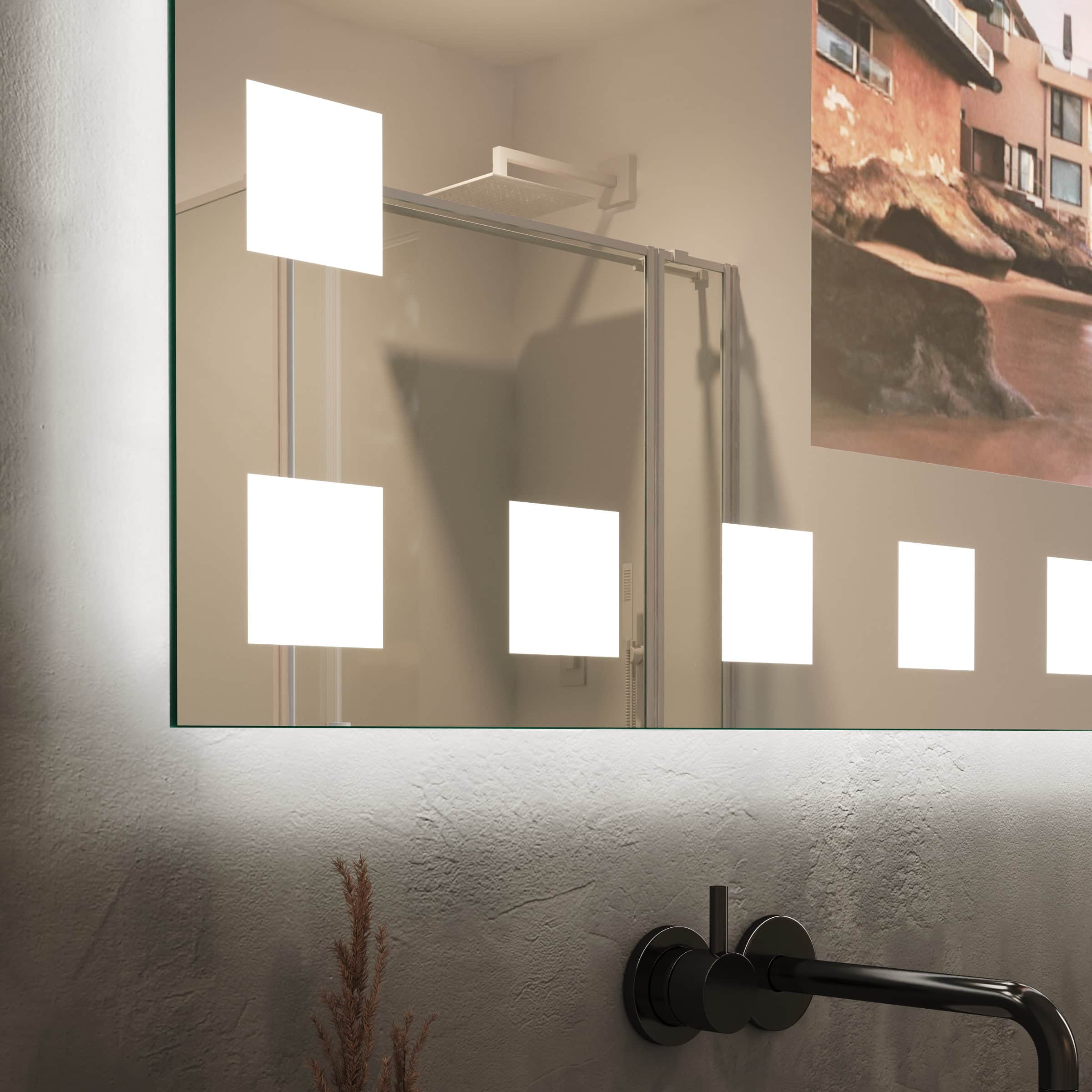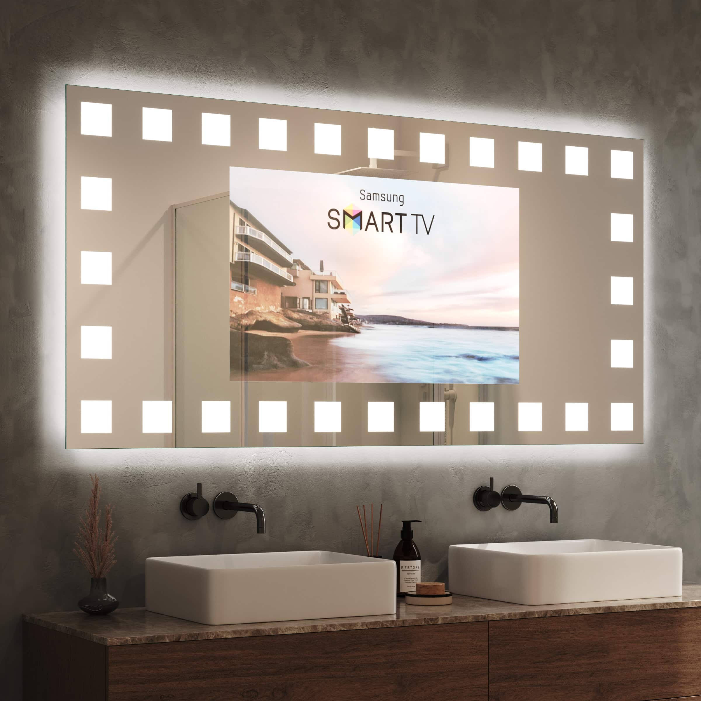 Der TV Spiegel 'Hollywood Dice' ist mehr als nur ein Spiegel – er ist ein multimediales Kunstwerk für Ihr anspruchsvolles Interieur. Im ausgeschalteten Zustand präsentiert er sich als makellose Spiegelfläche aus hochwertigem 6mm Spionglas. Auf Knopfdruck erwacht der integrierte Bildschirm zum Leben und bietet brillante Unterhaltung, während die Spiegelfunktion dezent erhalten bleibt. Die umlaufende 'Hollywood Dice' LED-Beleuchtung schafft eine professionelle, schattenfreie Ausleuchtung, deren Lichtstärke speziell für kosmetische Anwendungen optimiert ist. Durch indirekt erhellte Leuchtfelder entsteht ein weiches, schmeichelhaftes Licht, das Ihr Bad in eine Oase der Ruhe und Eleganz taucht. Dank individueller Maßanfertigung und präzise veredelter Glaskanten integriert sich dieser TV Spiegel nahtlos und als maßgeschneidertes Highlight in Ihre Raumarchitektur.