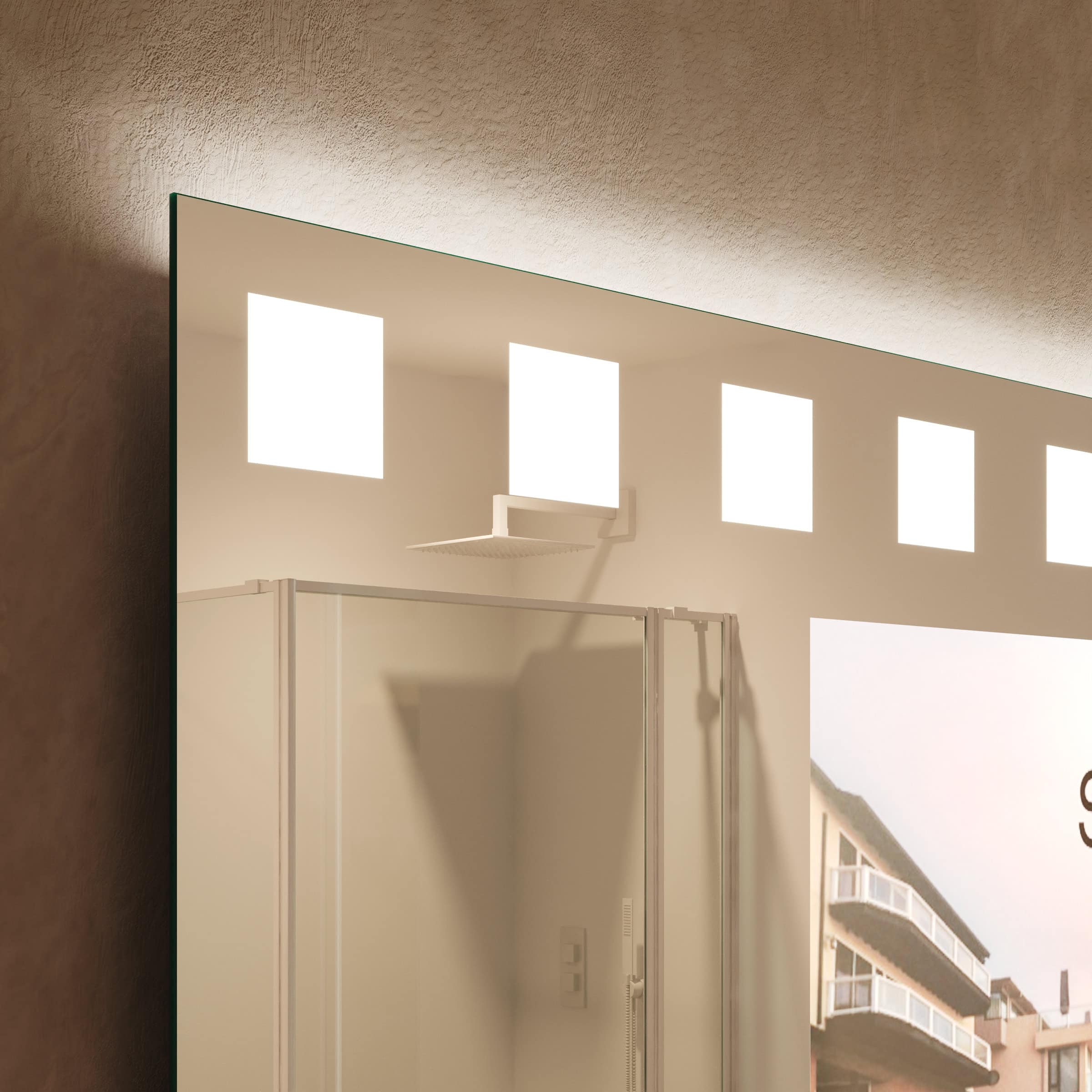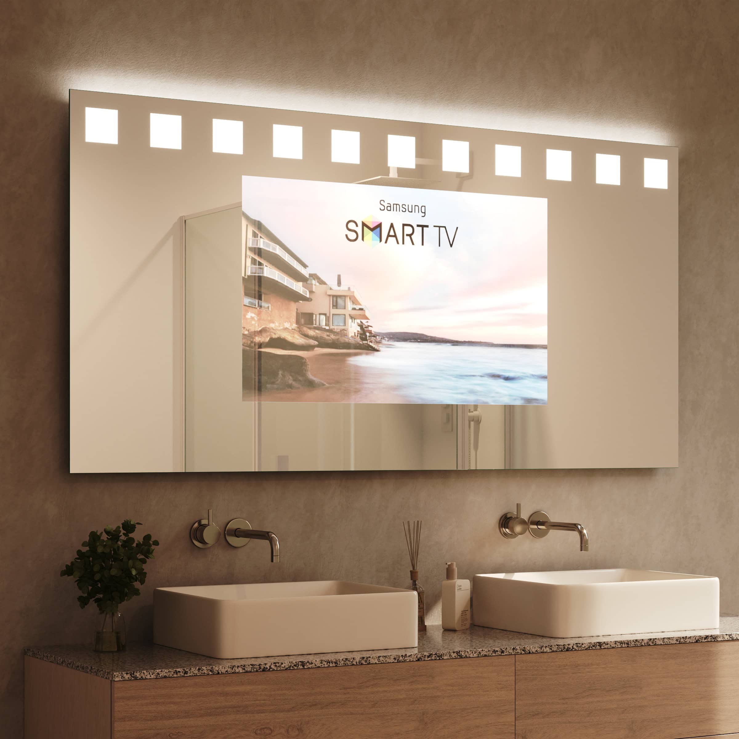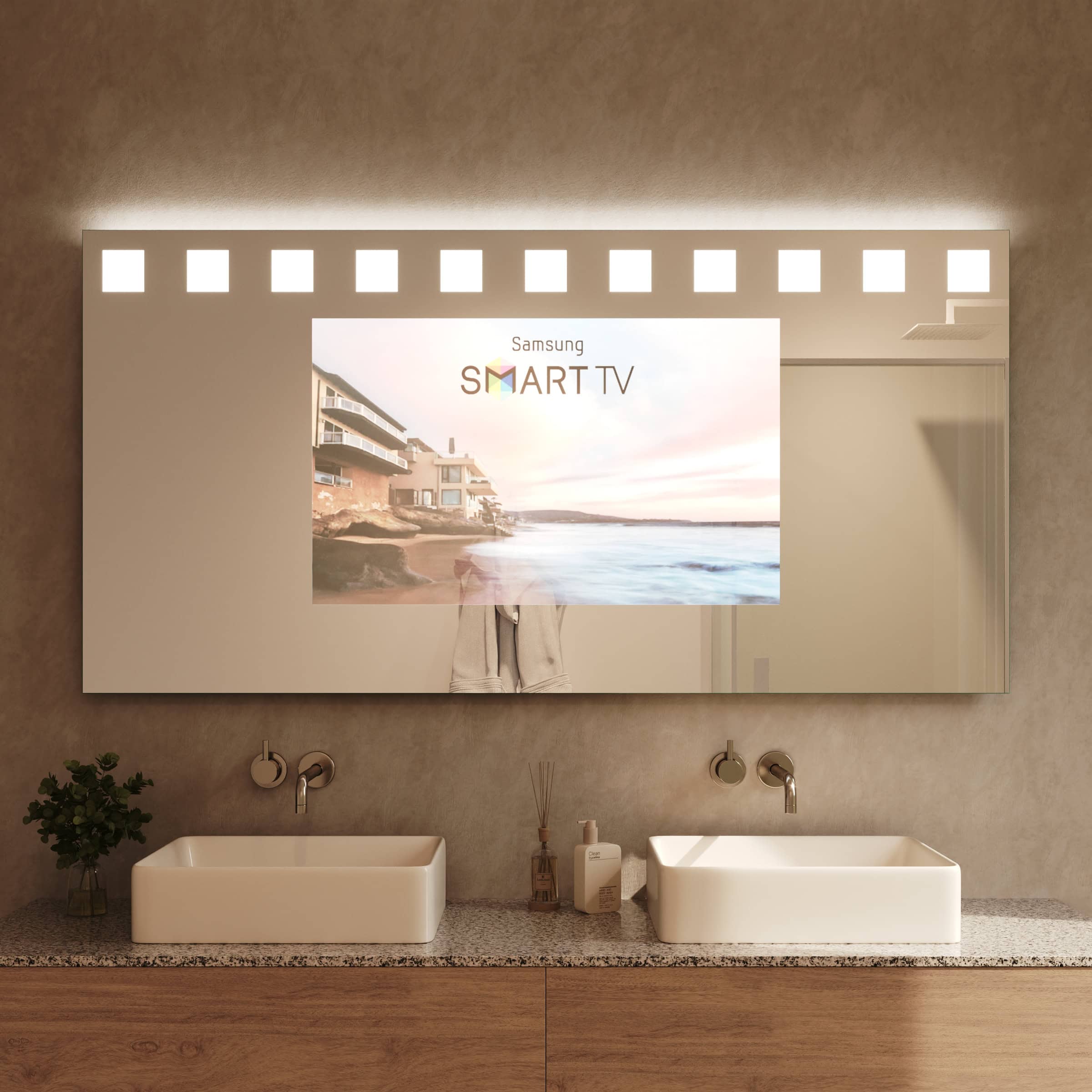 Dieser TV Spiegel verwandelt Ihr Badezimmer in eine Oase der Ruhe und des modernen Luxus. Im ausgeschalteten Zustand präsentiert er sich als makelloser, hochwertiger Spiegel. Aktiviert, offenbart das erstklassige Spionglas einen integrierten Bildschirm für Nachrichten oder Ihre Lieblingsserien, ohne das ästhetische Gesamtbild zu stören. Die oben positionierte Hollywood-Beleuchtung wurde speziell für kosmetische Anwendungen optimiert. Durch indirekt erhellte Leuchtfelder erzeugt die moderne LED-Technik ein schattenfreies, schmeichelhaftes Licht, das Ihre tägliche Routine präzisiert und veredelt. Gefertigt aus 6mm starkem Kristallglas mit geschliffenen und veredelten Kanten, fügt sich dieser rechteckige Spiegel dank individueller Maßanfertigung nahtlos in Ihr Raumkonzept ein. Mit seiner geringen Tiefe von nur 60mm unterstreicht er eine klare, aufgeräumte Ästhetik und wird zum technologischen wie gestalterischen Herzstück Ihres Bades.
