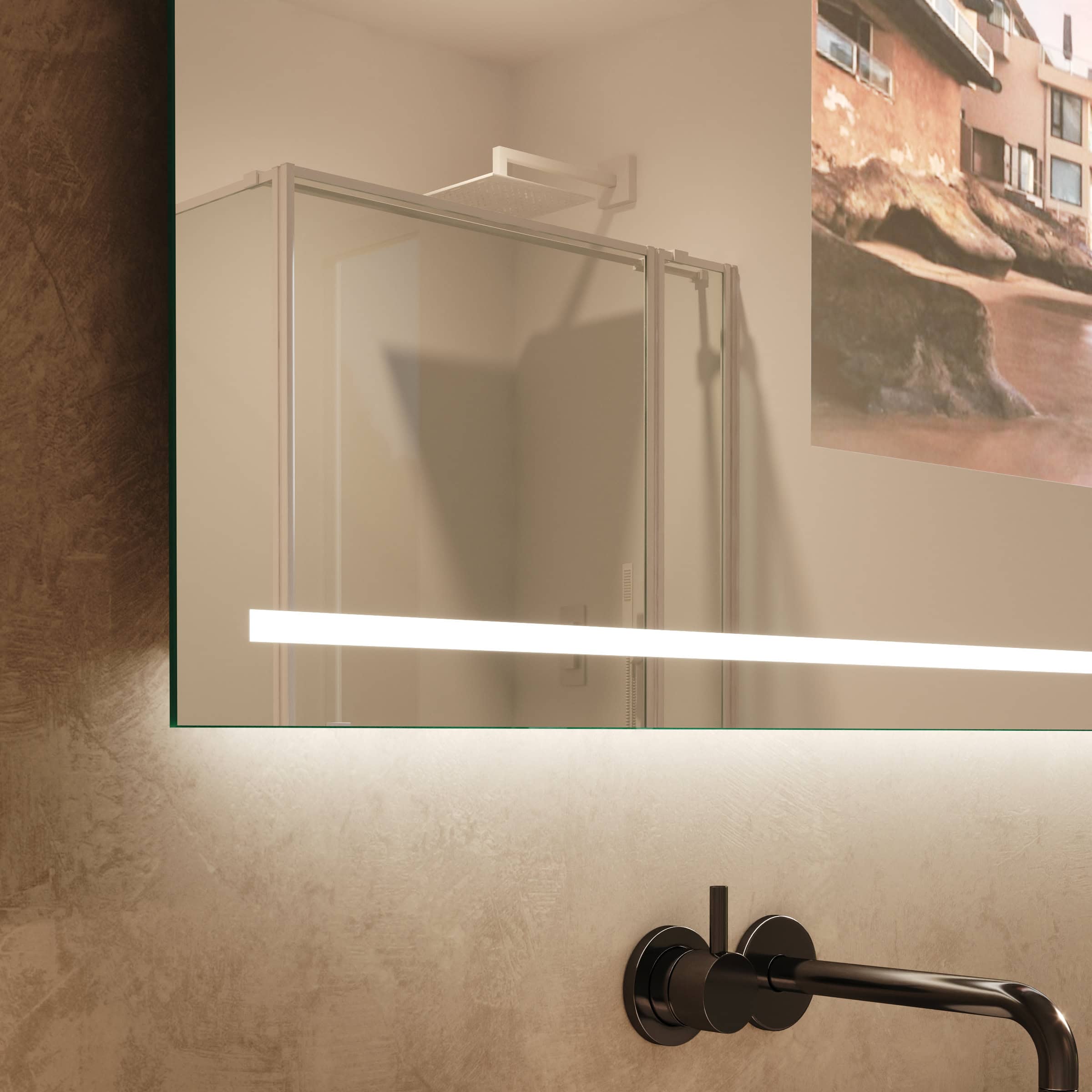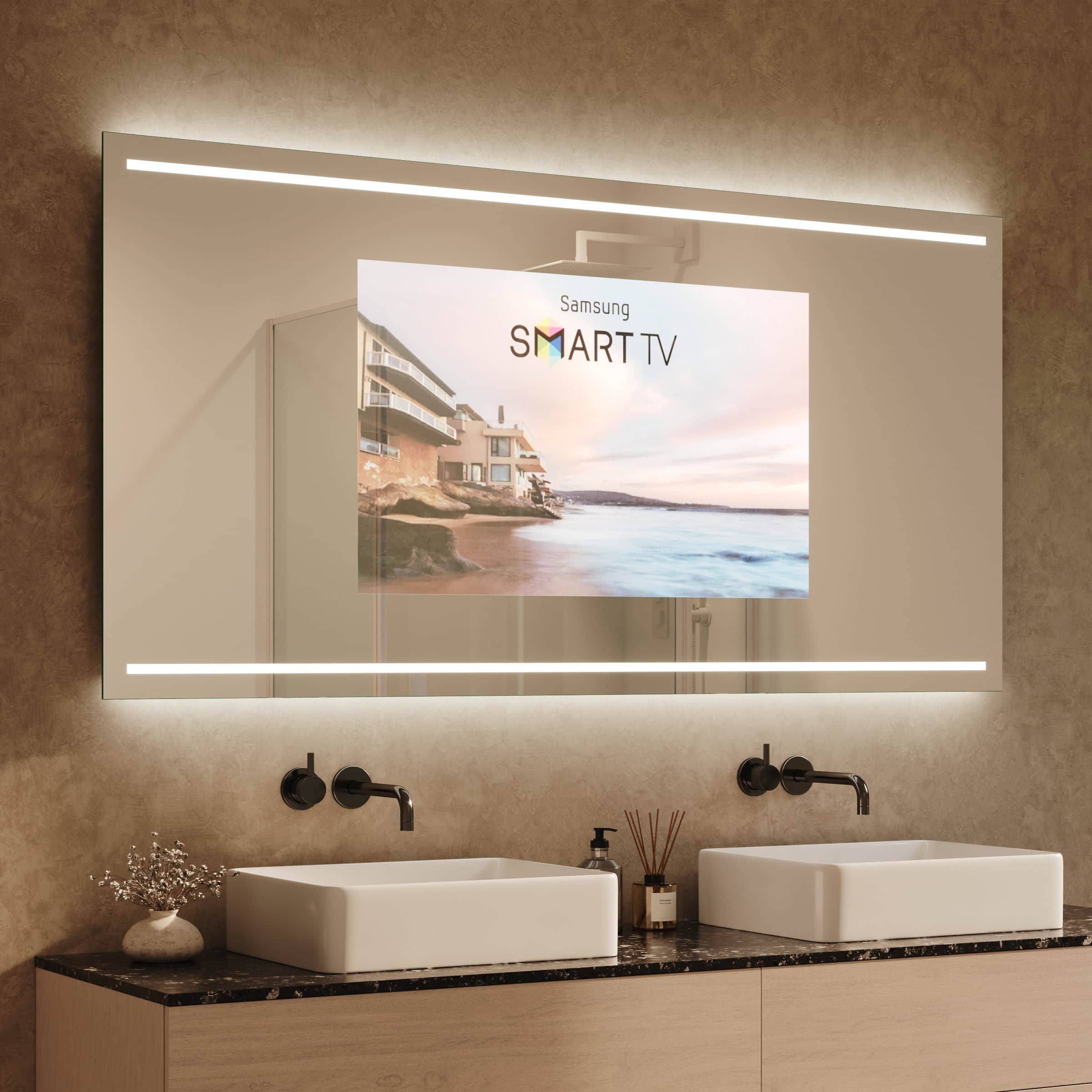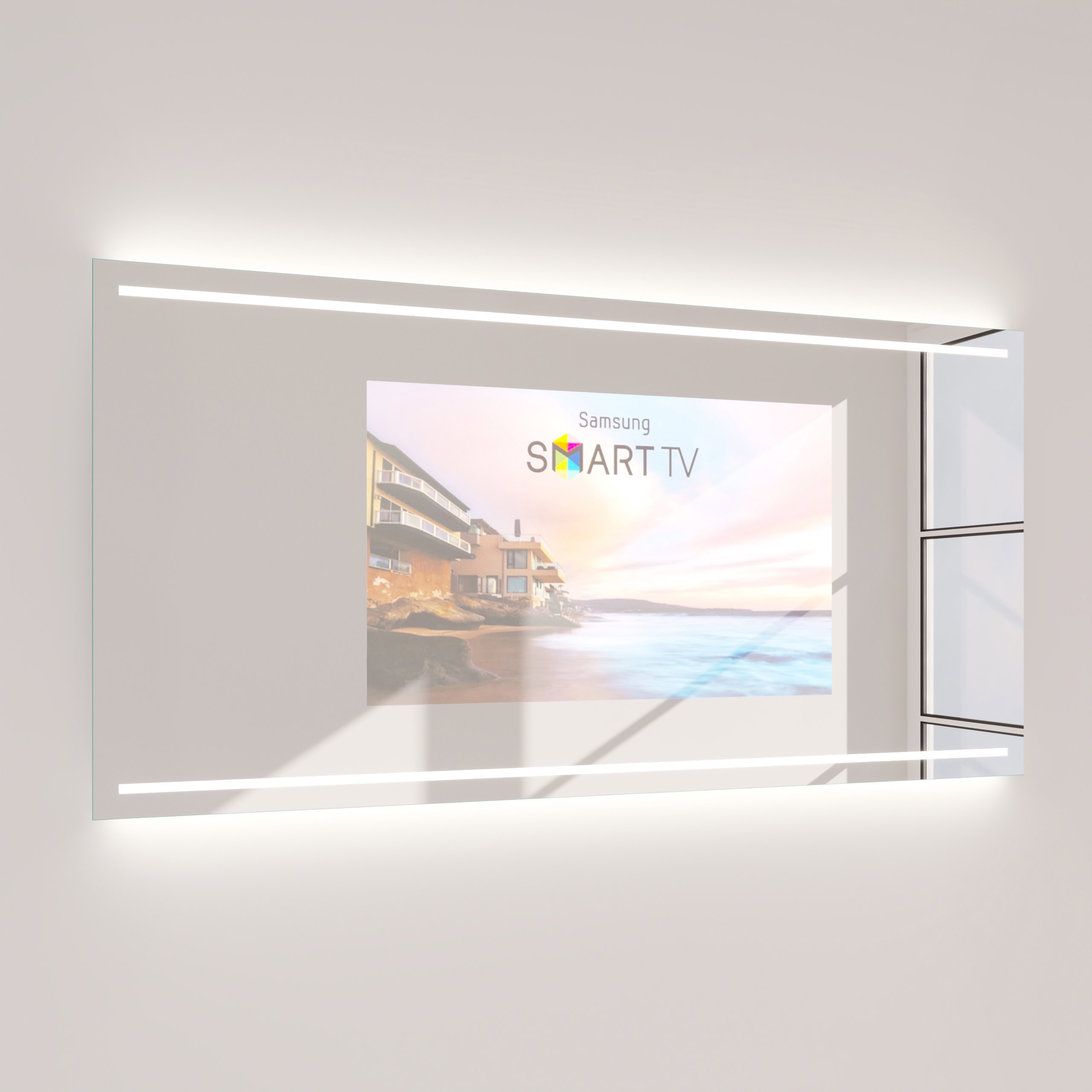 Der TV Spiegel Modena definiert die Grenzen zwischen Funktion und Faszination neu. Gefertigt als individuelle Maßanfertigung, fügt er sich millimetergenau und harmonisch in die Architektur Ihres Badezimmers ein. Das Herzstück ist ein hochwertiges 6mm Spionglas, das im ausgeschalteten Zustand als vollflächiger Spiegel dient. Die von oben und unten ausgehenden, indirekten LED-Leuchtfelder schaffen eine schattenfreie und für kosmetische Anwendungen optimierte Ausleuchtung. Diese satinierten Glasflächen wirken im Ruhezustand wie edles Milchglas und entfalten bei Aktivierung ein blendfreies, atmosphärisches Licht. Die präzise geschliffenen und veredelten Glaskanten zeugen von höchster Verarbeitungsqualität und machen den Spiegel zu einem skulpturalen Objekt, das Ihr anspruchsvolles Raumkonzept vollendet – ob bei der morgendlichen Routine oder einem entspannenden Bad am Abend.