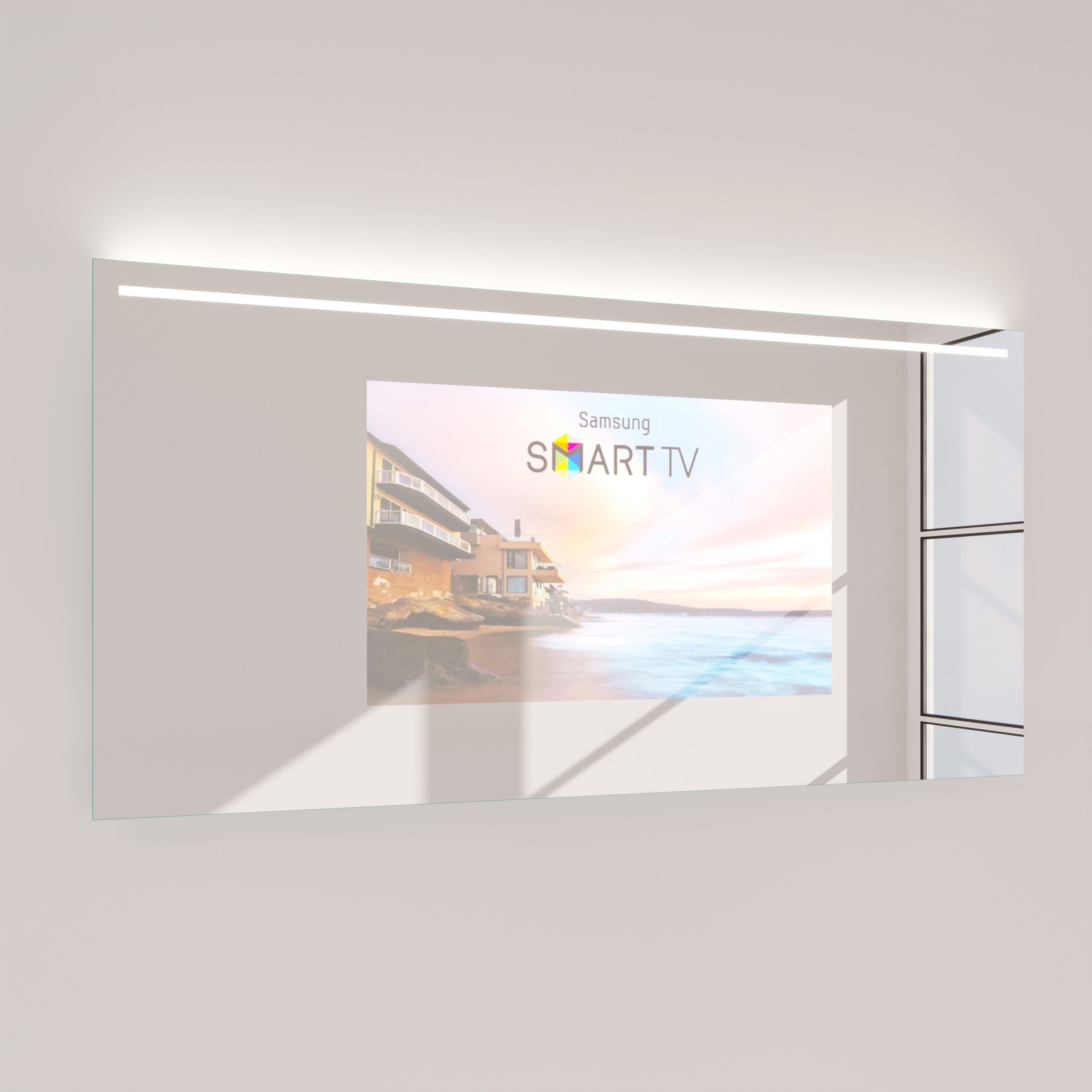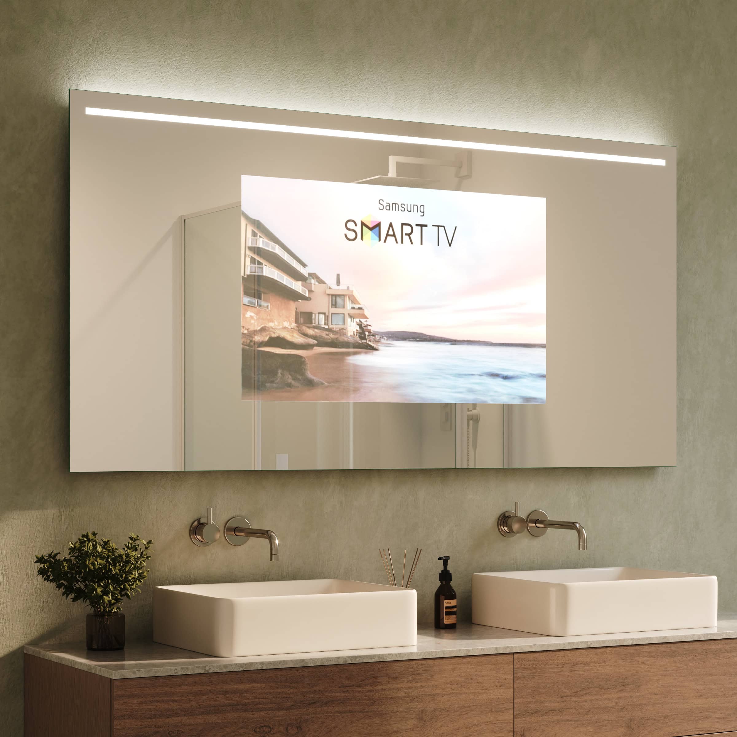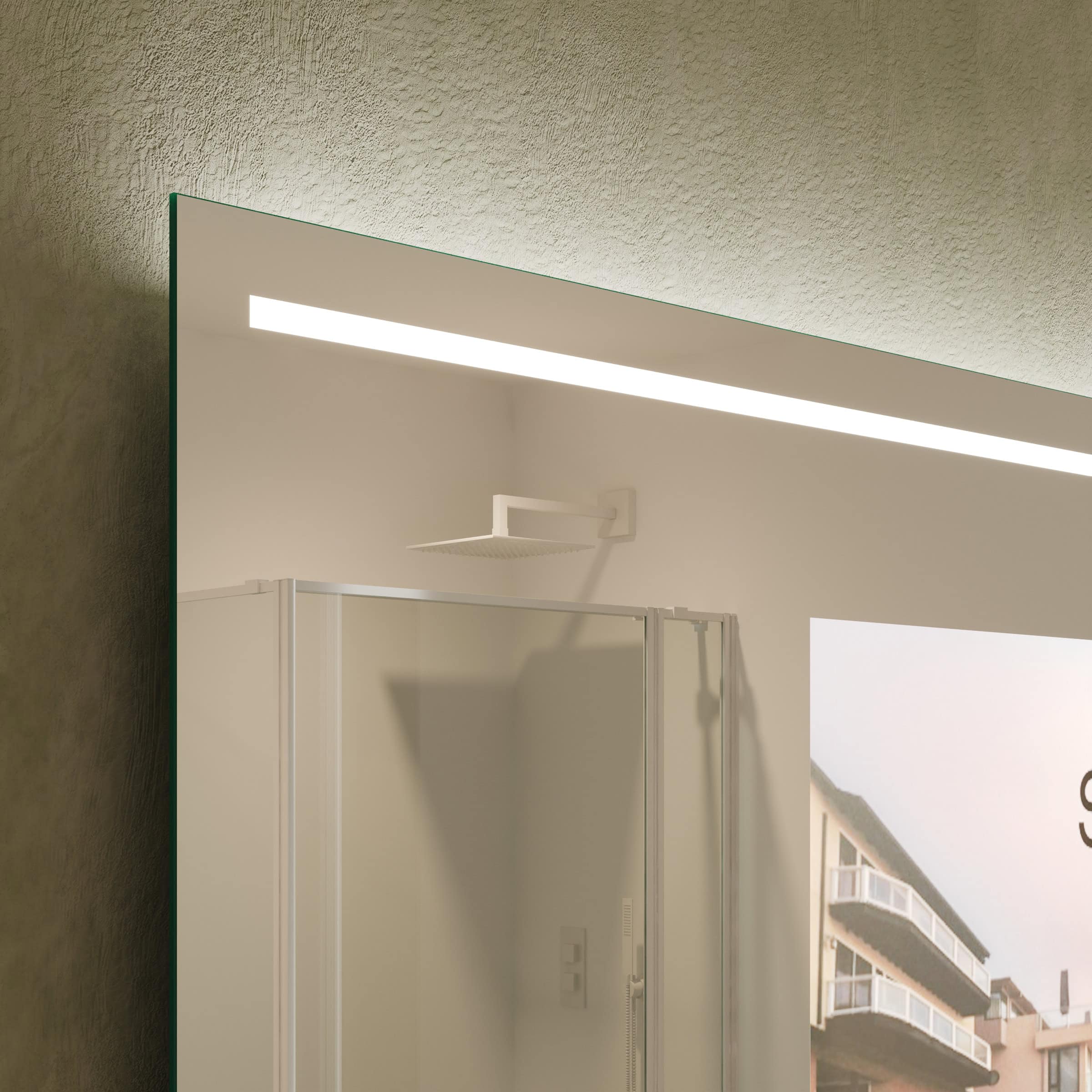 Der TV Spiegel Modena ist die Essenz anspruchsvoller Raumgestaltung. Gefertigt als individuelle Maßanfertigung, fügt er sich nahtlos und millimetergenau in Ihr Baddesign ein. Das Herzstück bildet ein 6mm starkes Spionglas mit edel geschliffenen und veredelten Kanten. Im ausgeschalteten Zustand präsentiert es sich als makellose Spiegelfläche. Auf Knopfdruck erwacht dahinter ein brillanter Bildschirm zum Leben, ohne die elegante Ästhetik zu stören. Die oben positionierte LED-Beleuchtung ist gezielt für die kosmetische Anwendung optimiert und spendet ein schattenfreies, klares Licht. Durch die satinierten Glasflächen tritt das Licht indirekt aus und erzeugt eine sanfte, atmosphärische Helligkeit. Ist das Licht ausgeschaltet, wirken diese Leuchtfelder wie dezentes Milchglas – ein durchdachtes Detail, das die hochwertige Anmutung unterstreicht. Mit einer Tiefe von nur 60mm bewahrt der Spiegel eine schlanke Silhouette und verkörpert minimalistische Perfektion.