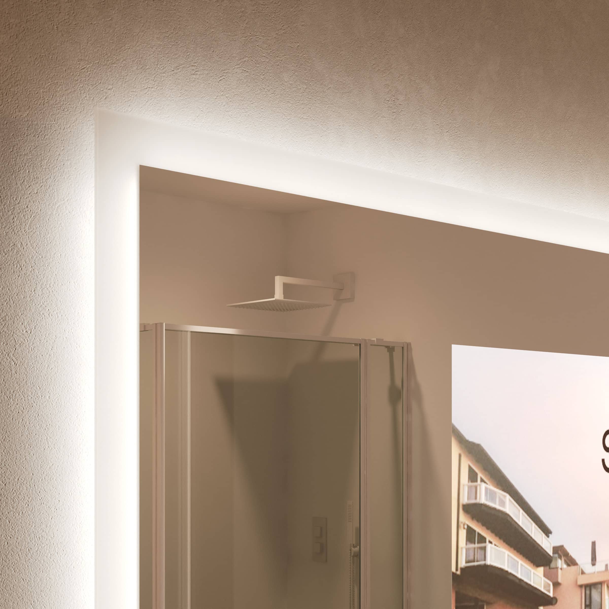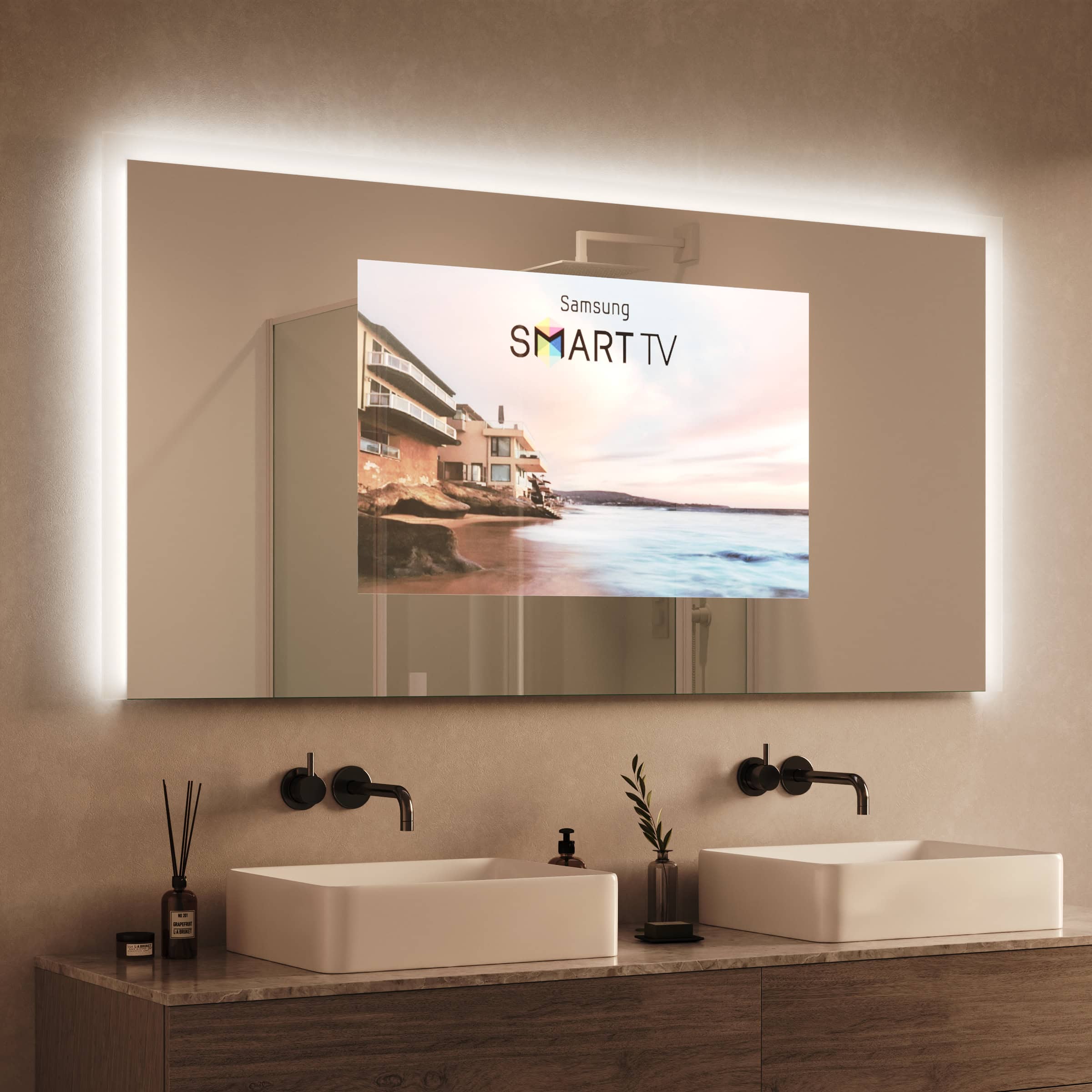Der TV Spiegel Noemi definiert die Grenzen zwischen Funktion und Faszination neu. Gefertigt als individuelle Maßanfertigung für Ihr Zuhause, fügt er sich nahtlos in Ihre Raumarchitektur ein. Im ausgeschalteten Zustand präsentiert er sich als makelloser Design-Spiegel, dessen satinierte Leuchtfelder dezent wie Milchglas wirken. Ein Knopfdruck genügt, und das hochwertige 6mm Spionglas enthüllt ein brillantes TV-Bild, ohne dass die Spiegelfläche ihre Eleganz verliert. Die umlaufende LED-Beleuchtung an den Seiten und oben wurde gezielt für die kosmetische Anwendung optimiert. Sie taucht Ihr Gesicht in schattenfreies, klares Licht, während die indirekte Abstrahlung eine wohltuende Atmosphäre im gesamten Raum schafft. Die geschliffenen und veredelten Glaskanten zeugen von höchster Handwerkskunst und machen diesen TV Spiegel mit Beleuchtung zum Herzstück jedes anspruchsvollen Badezimmers.