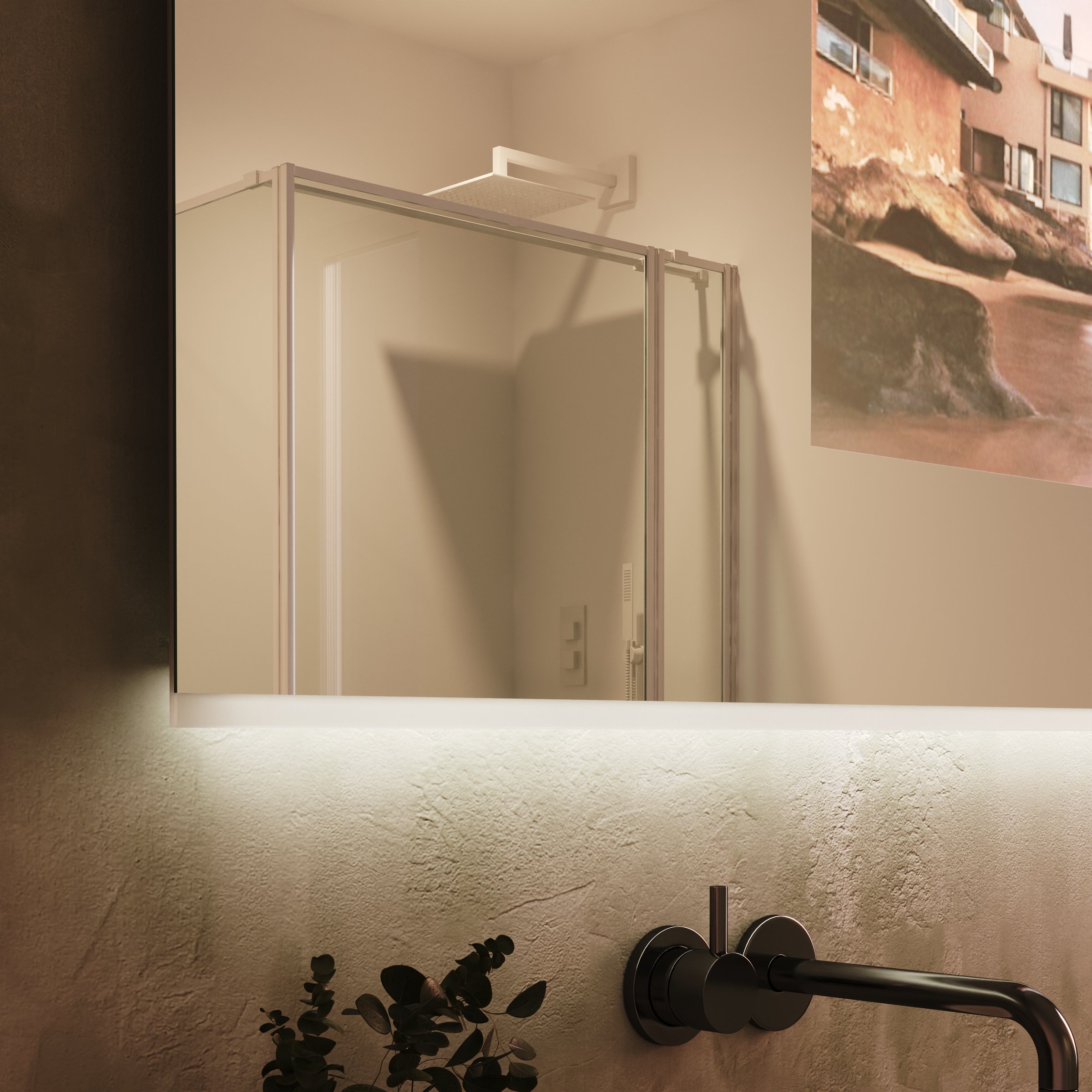 Der TV Spiegel Siena ist weit mehr als nur ein Spiegel – er ist ein Statement für anspruchsvolles Interior Design. Nach Ihren individuellen Maßen gefertigt, fügt er sich millimetergenau und harmonisch in Ihr Raumkonzept ein. Im ausgeschalteten Zustand präsentiert er sich als makelloser Designspiegel, dessen satinierte Leuchtfelder oben und unten wie edles Milchglas wirken. Das Herzstück bildet ein 6mm starkes Spionglas mit veredelten, geschliffenen Kanten, das auf Wunsch ein gestochen scharfes TV-Bild enthüllt. Die integrierte LED-Beleuchtung tritt indirekt aus den oberen und unteren Lichtfeldern aus und taucht Ihr Bad in ein weiches, blendfreies Licht. Diese Ausleuchtung ist nicht nur atmosphärisch, sondern auch perfekt als Kosmetiklicht optimiert und bietet Ihnen schattenfreie Klarheit für Ihre tägliche Pflegeroutine. So verschmilzt exzellente Funktionalität mit puristischer Ästhetik.
