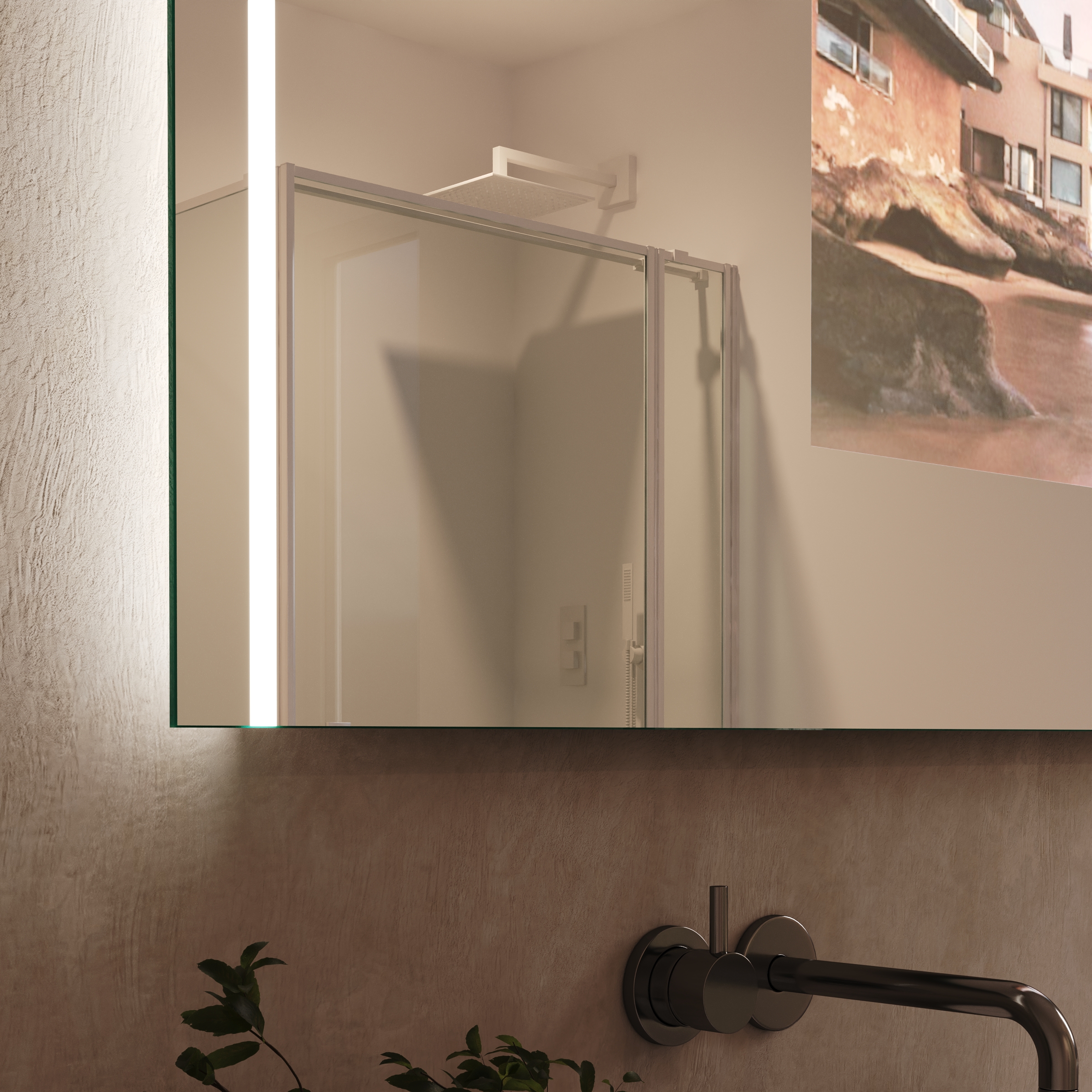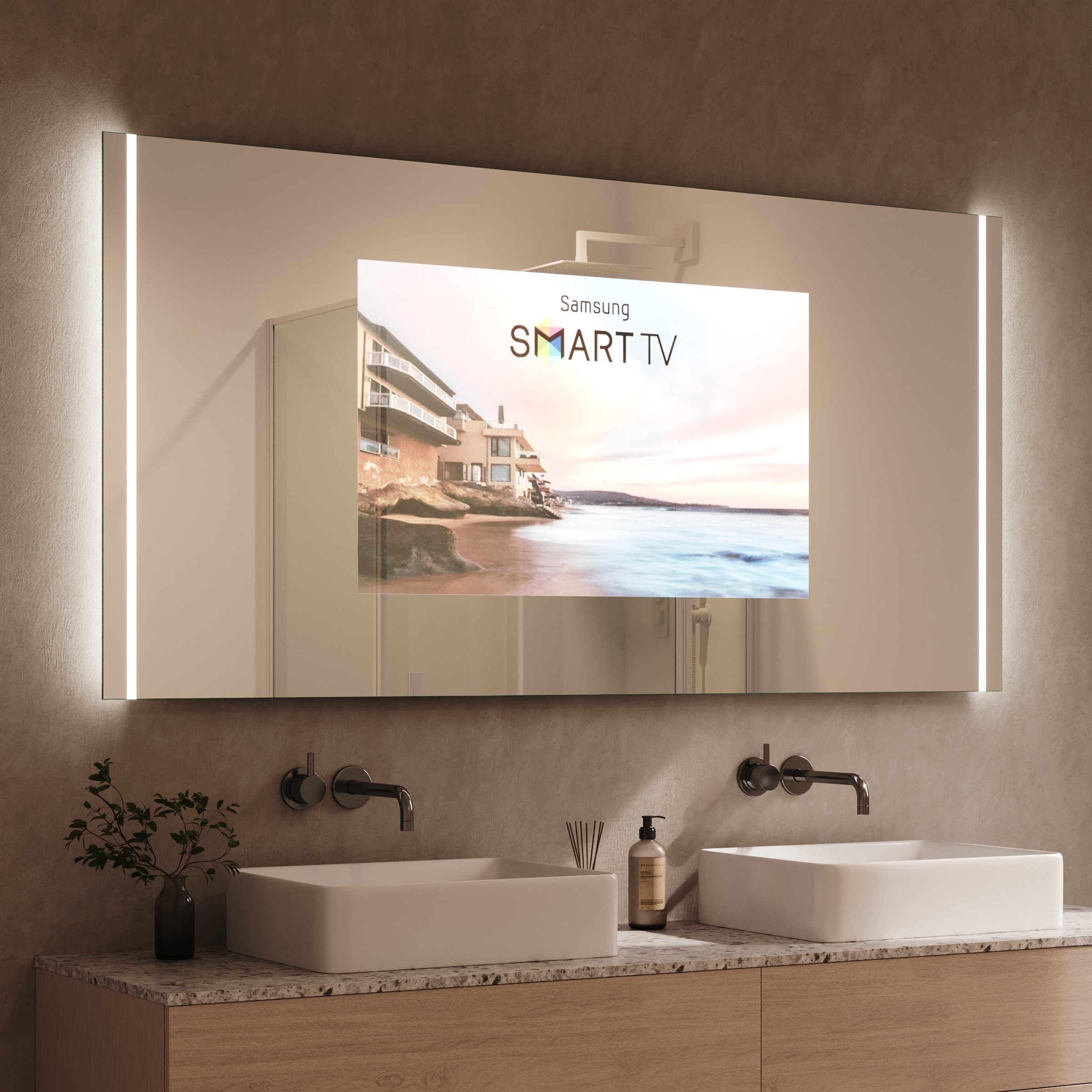 Als Meisterwerk der Integration fügt sich der TV Spiegel Viela nahtlos in Ihr anspruchsvolles Raumkonzept ein. Nach Ihren individuellen Maßen gefertigt, präsentiert er sich im ausgeschalteten Zustand als makellose Spiegelfläche aus 6mm starkem, veredeltem Spionglas. Ein Fingertipp genügt, und die Fläche erwacht zum Leben, um Ihnen Nachrichten oder Ihre Lieblingsserie zu präsentieren. Die seitlich positionierte LED-Beleuchtung ist weit mehr als nur ein atmosphärisches Detail: Ihre speziell für kosmetische Anwendungen optimierte Lichtstärke sorgt für eine schattenfreie und authentische Ausleuchtung Ihres Gesichts. Die satinierten Leuchtfelder, die im Ruhezustand wie feines Milchglas wirken, verströmen im aktiven Modus ein sanftes, indirektes Licht. Mit einer Bautiefe von nur 60mm vereint dieser TV Spiegel mit Beleuchtung puristische Eleganz mit multimedialer Funktionalität und macht Ihr Badezimmer zu einem Ort des luxuriösen Komforts.