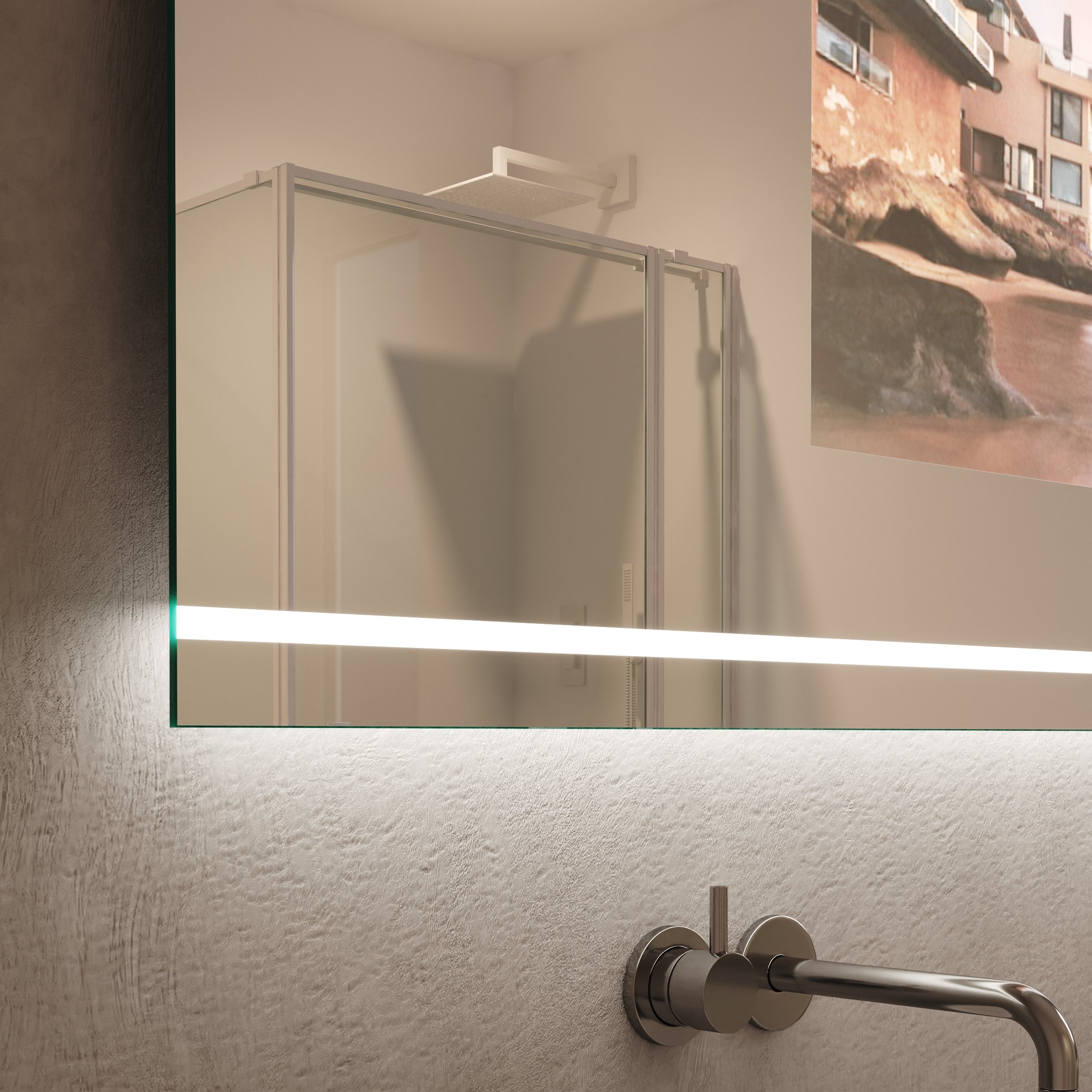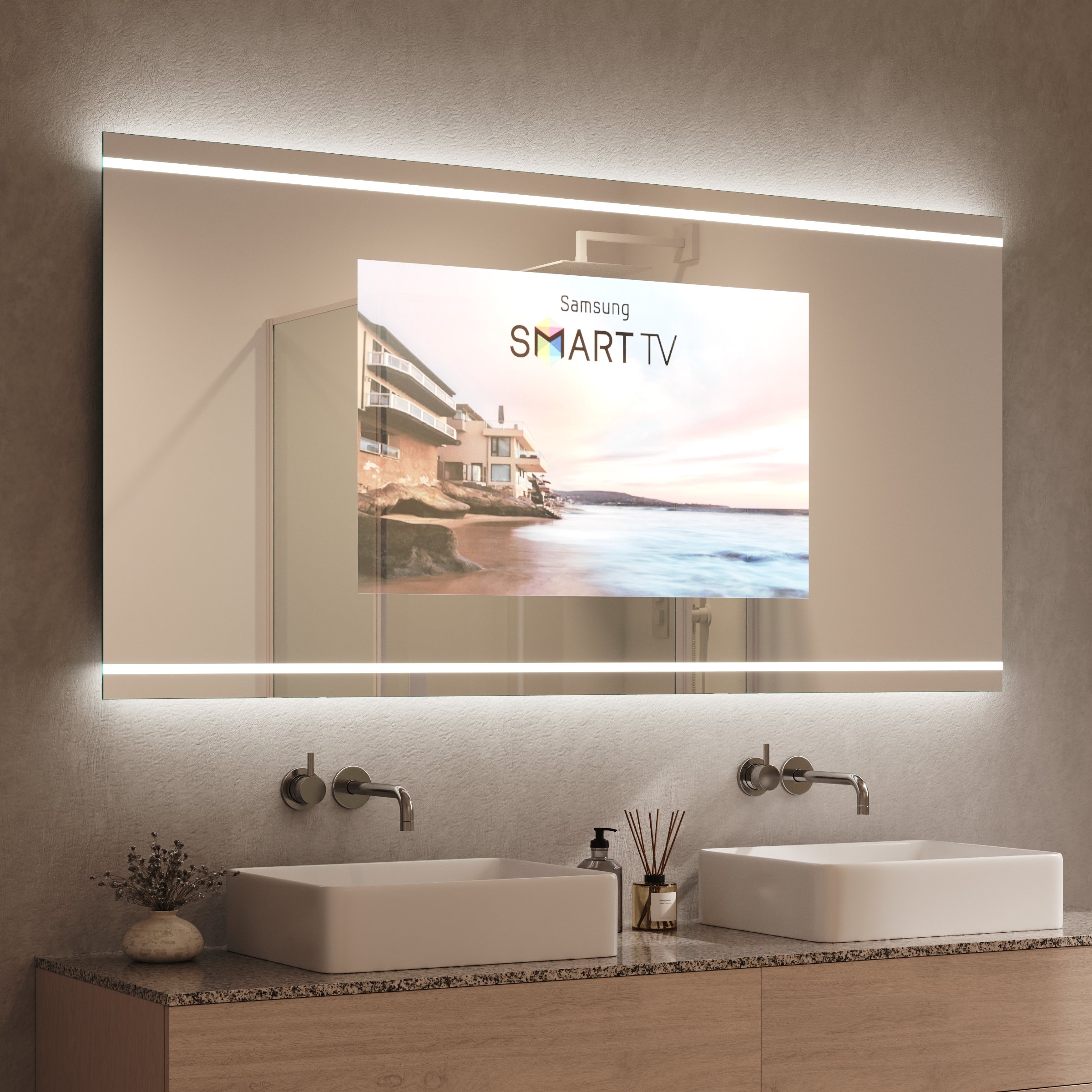Jeder Viela TV Spiegel wird als exklusive Maßanfertigung für Ihr Ambiente gefertigt und fügt sich millimetergenau in Ihre Raumgestaltung ein. Das Herzstück bildet das hochwertige, 6 mm starke Spionglas, dessen sorgfältig geschliffene und veredelte Kanten höchste Materialqualität signalisieren. Im ausgeschalteten Zustand genießen Sie die pure Ästhetik eines klassischen Designspiegels. Aktiviert, enthüllt er ein gestochen scharfes Bild und verwandelt Ihr Badezimmer in eine private Lounge. Umrahmt wird dieses technologische Meisterwerk von einer oben und unten positionierten LED-Beleuchtung. Diese erhellt sanft satinierte Leuchtfelder, die bei Nichtgebrauch wie edles Milchglas wirken. Das Licht tritt indirekt aus, schafft eine blendfreie, schmeichelhafte Atmosphäre und ist in seiner Stärke gezielt für kosmetische Anwendungen optimiert – für ein Pflegeritual bei perfekter Ausleuchtung.