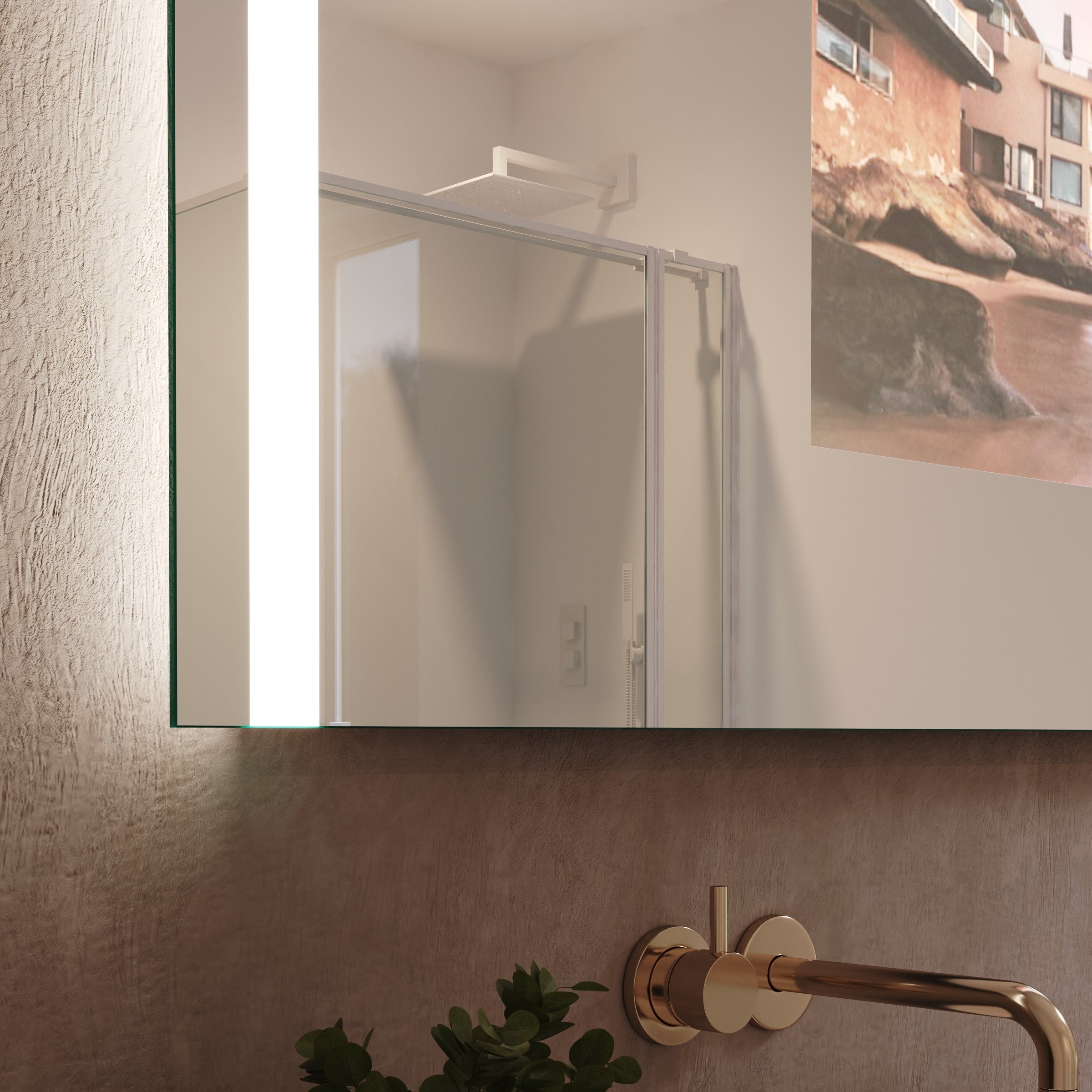 Der TV Spiegel Viola mit seitlicher Beleuchtung ist mehr als nur ein Spiegel – er ist ein Statement für anspruchsvolles Wohnen. Als individuelle Maßanfertigung fügt er sich nahtlos in die Architektur Ihres Raumes ein. Im ausgeschalteten Zustand präsentiert er sich als makellose Spiegelfläche aus edlem 6mm starkem Spionglas mit geschliffenen Kanten. Auf Wunsch verwandelt er sich in ein brillantes Display für Ihre Lieblingsinhalte. Die beidseitige LED-Beleuchtung wurde speziell für kosmetische Anwendungen optimiert und garantiert eine schattenfreie, authentische Ausleuchtung Ihres Gesichts. Die 4 cm breiten, satinierten Leuchtfelder werden indirekt erhellt und tauchen Ihr Bad in ein weiches, blendfreies Licht. Im ausgeschalteten Zustand wirken diese Felder wie dezentes Milchglas und unterstreichen das puristische Design. Mit seiner geringen Tiefe von nur 60mm verschmilzt dieser TV Spiegel für das Badezimmer förmlich mit der Wand und schafft eine Atmosphäre von moderner Leichtigkeit.